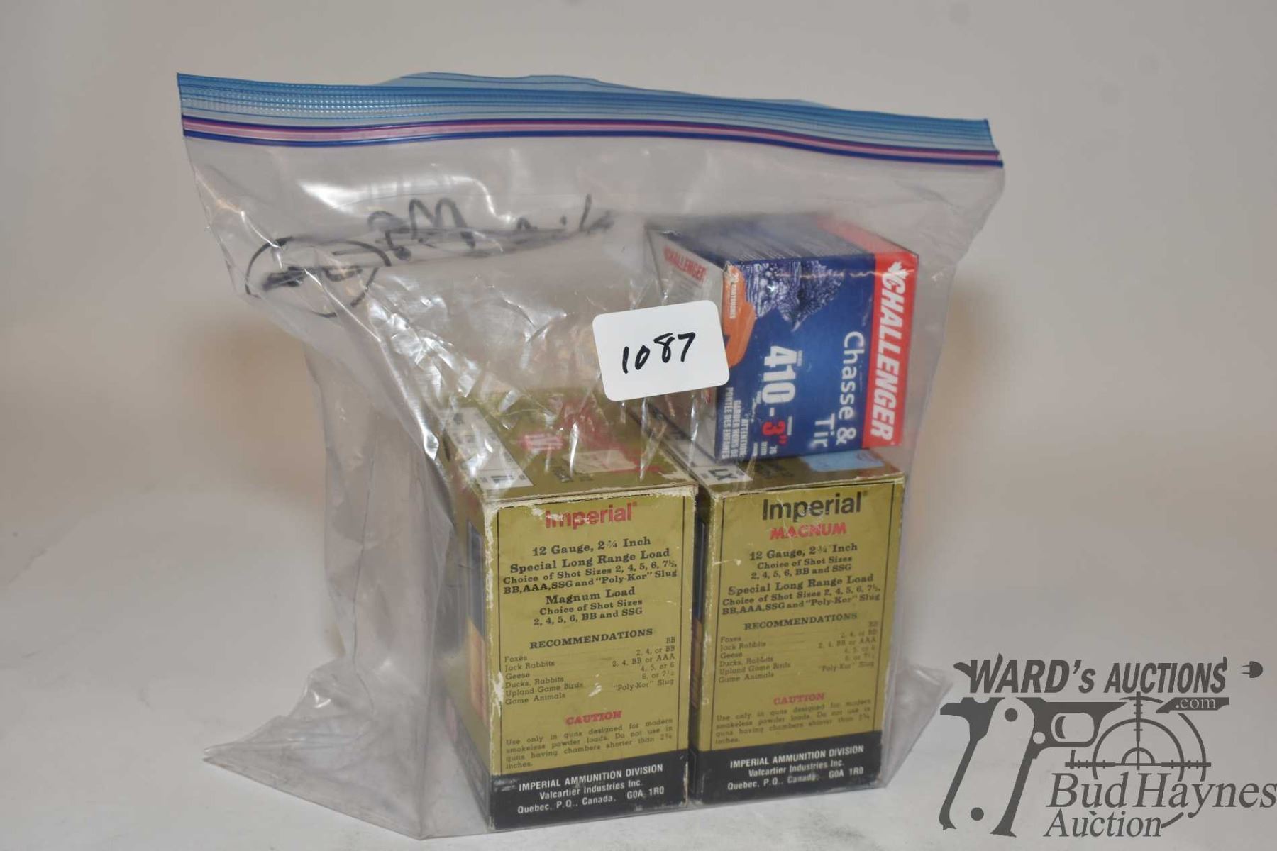 Selection of shotgun ammo including one full 25 count box of Challenger .410 GA 3" #6, one 24 count box of Imperial 12 GA 2 3/4" #2, and one 20 count box of Imperial 12 GA 2 3/4" #4
