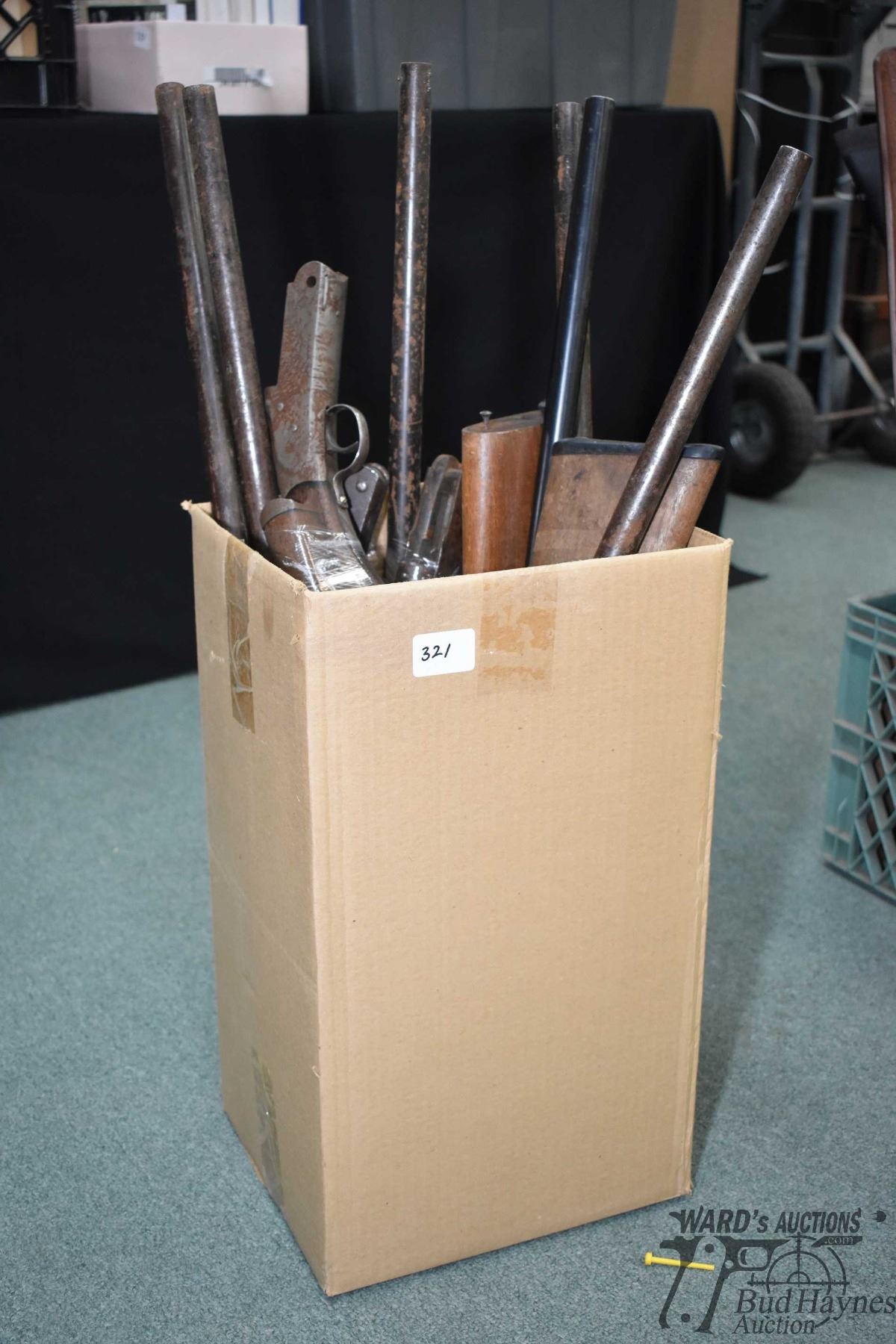 Selection of single shot break action shotgun barrels, wood and firing mechanisms. Note: Pal required