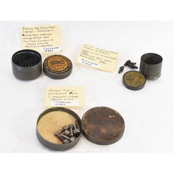 1. Stelco, The Steel Company Of Canada Limited, containing roughly .5 of a pound of .177 round air rifle shot. 2 1/8" across x 1 1/4" high...