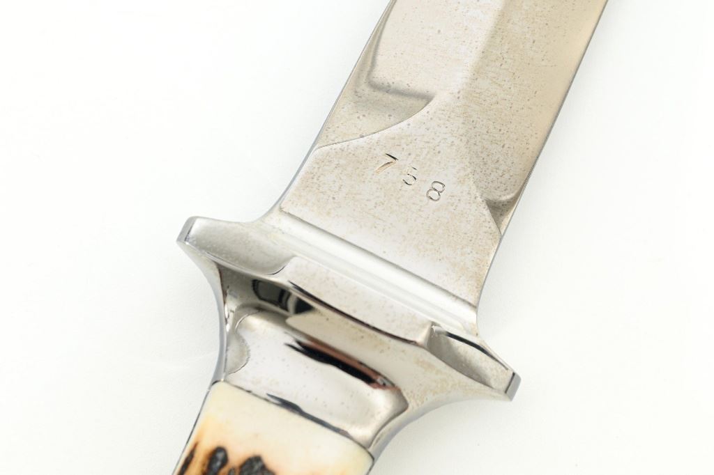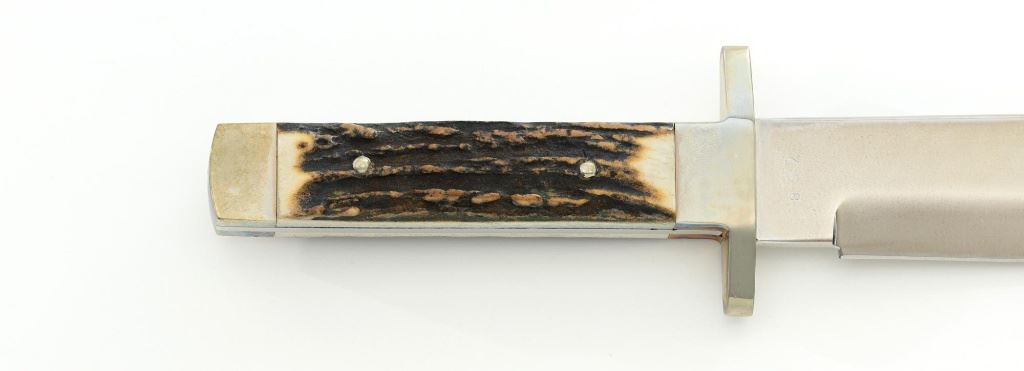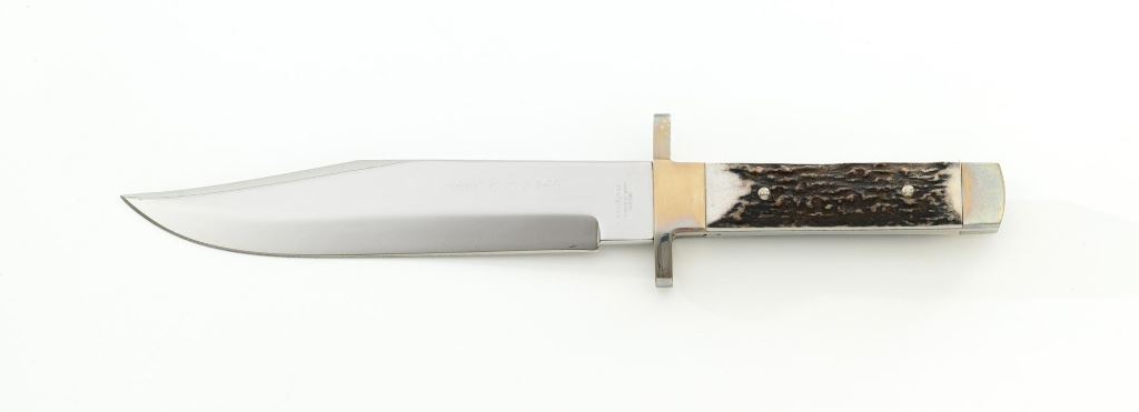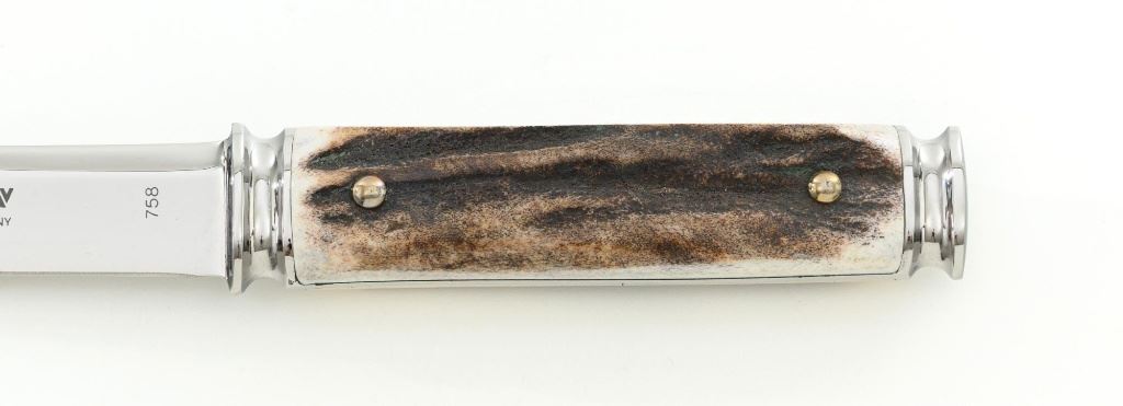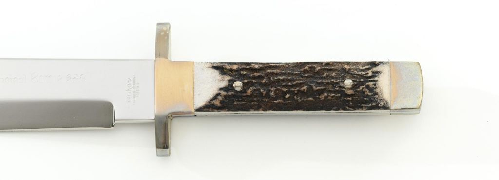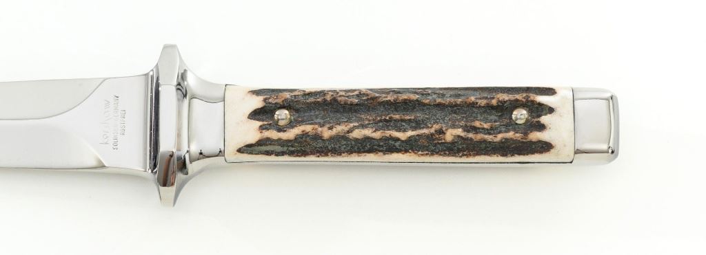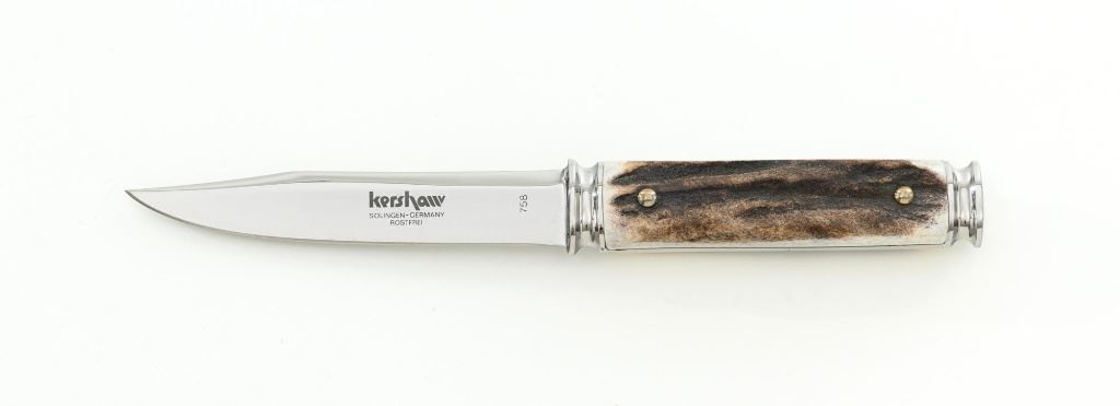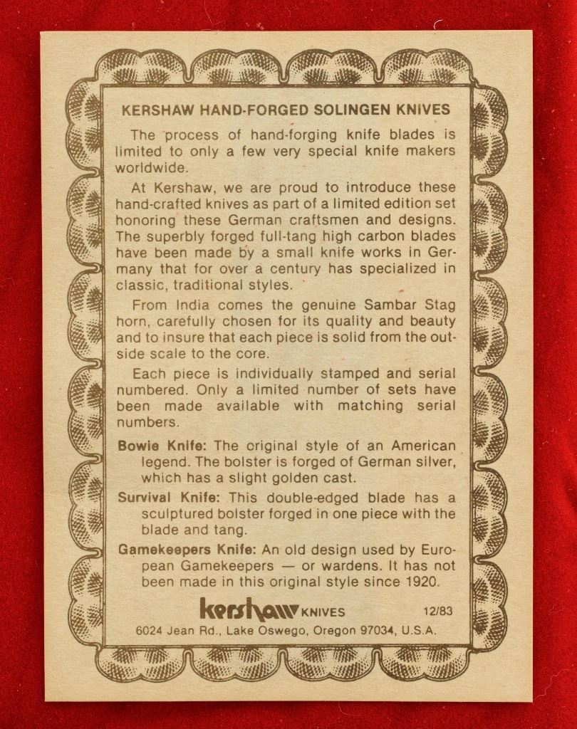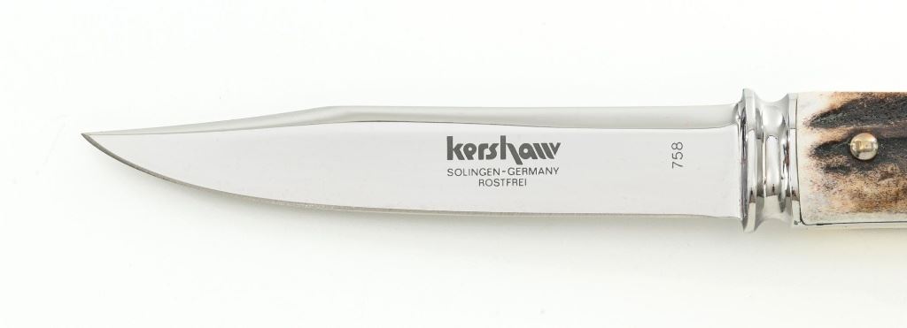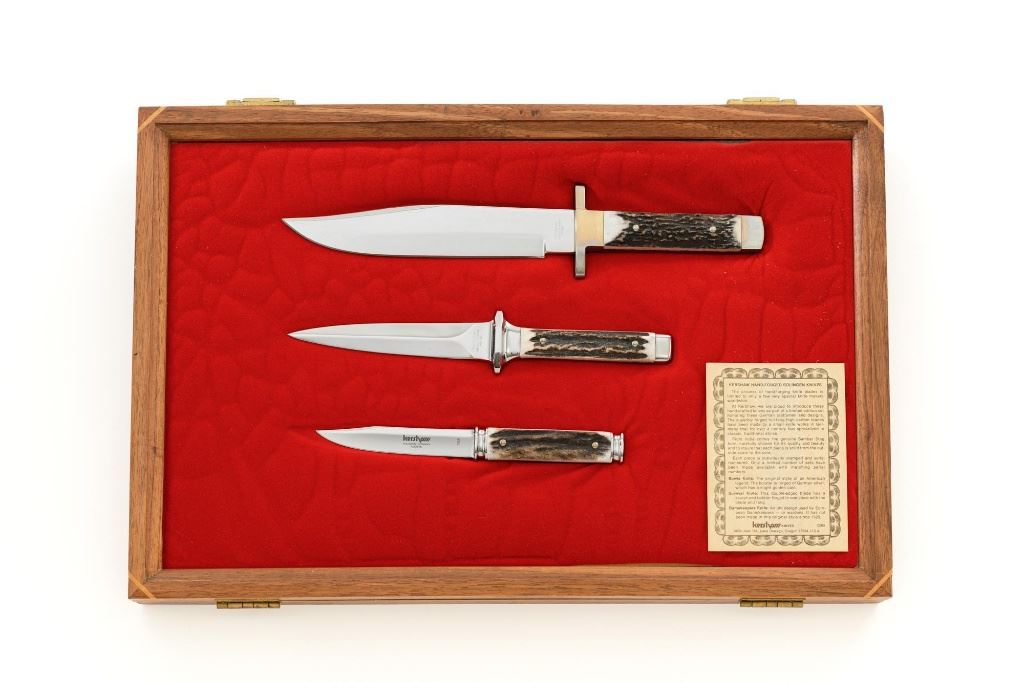Set of Three (3) Matching Numbered Kershaw Hand Forged Solingen Knives: This set includes an "Original Bowie", "Survival", and "Gamekeepers" knife. All with beautiful Sambar stag handles. Each knife is numbered "758". In wood display case with Kershaw information card. All the knives are in excellent, unused condition, showing only minor handling marks. German silver guard and pommel on the bowie knife has some areas that are lightly tarnished and would improve with mild cleaning. Case is in excellent condition; keys are not present. Est.: $800-$1,000.