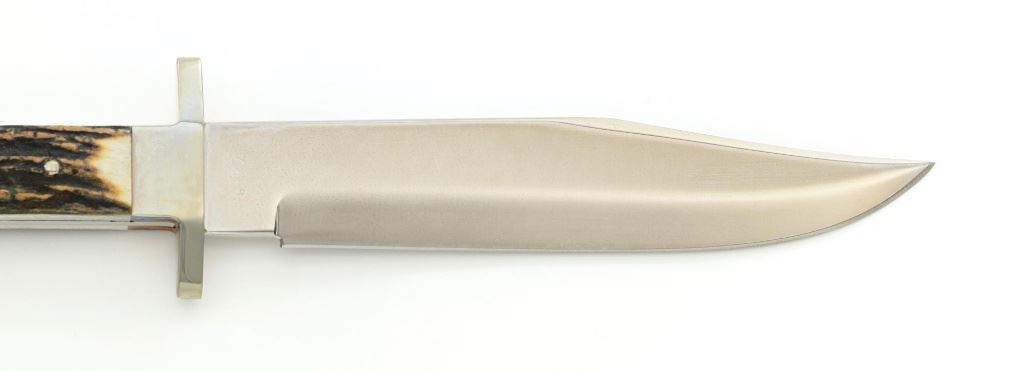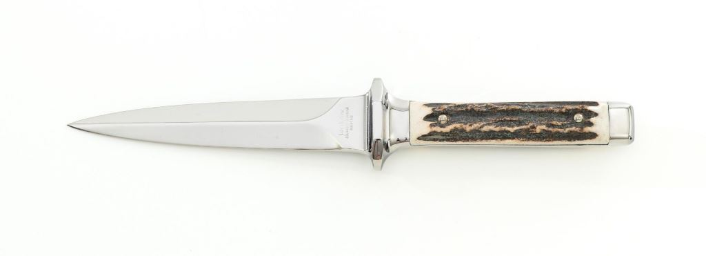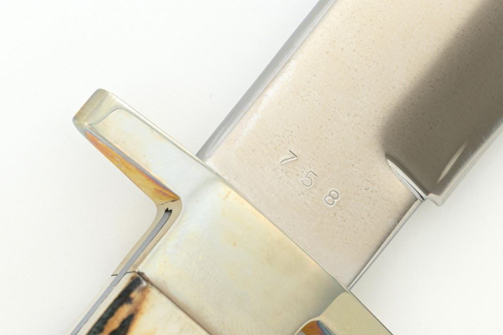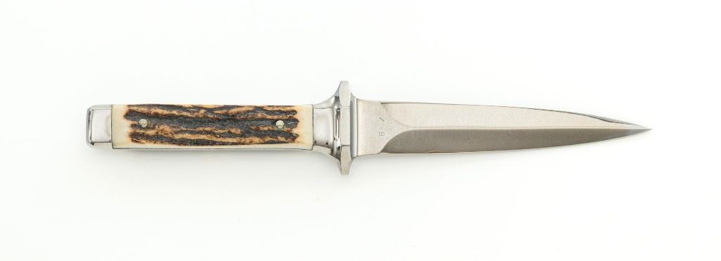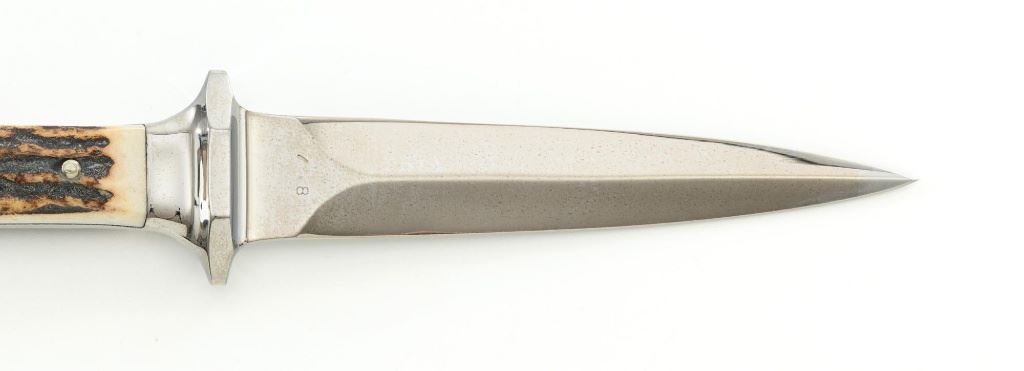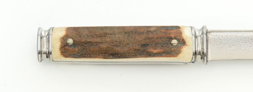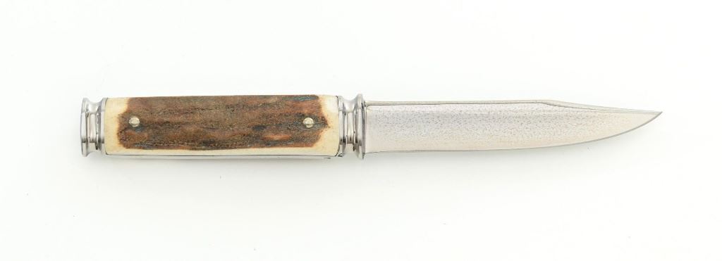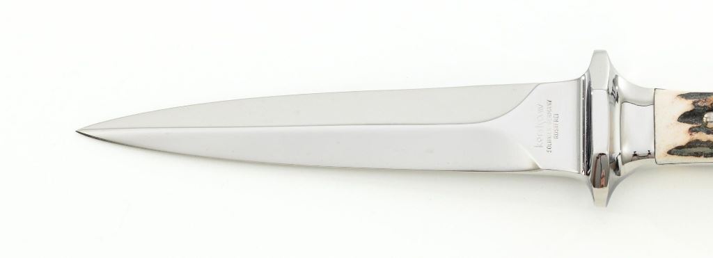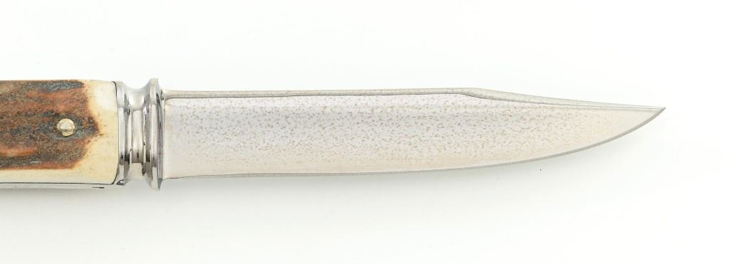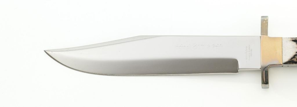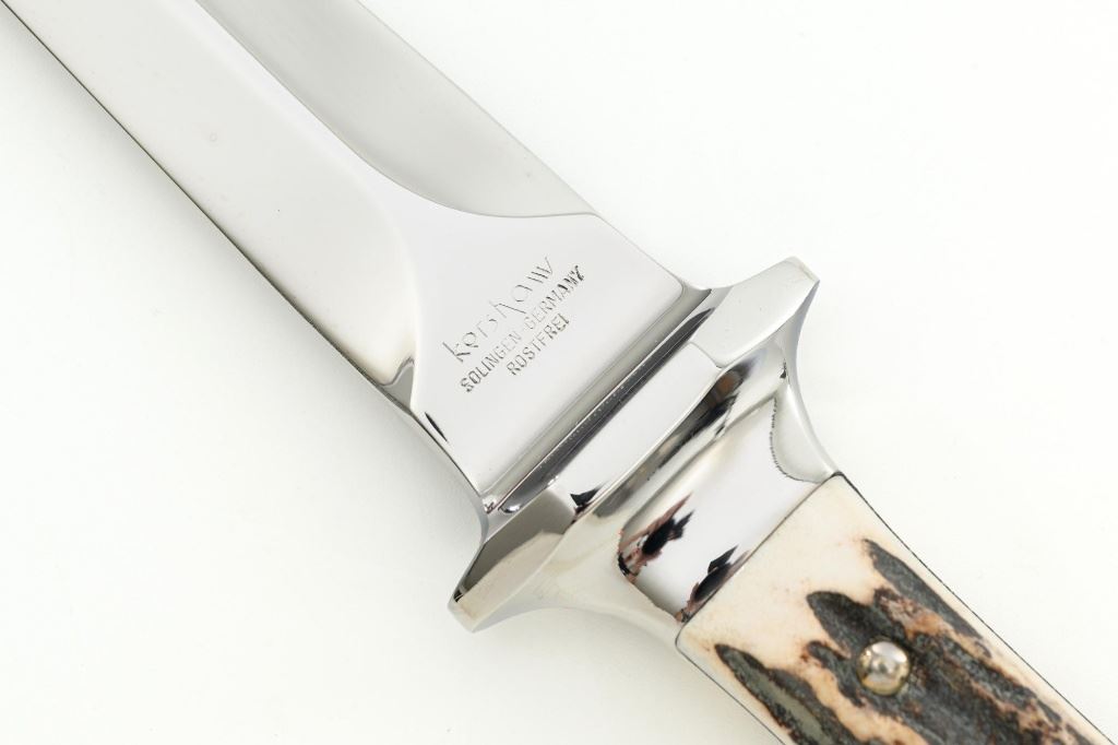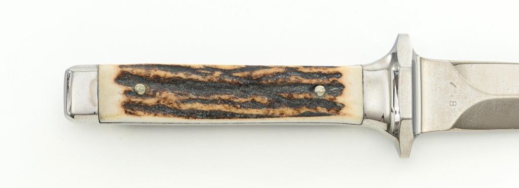 Set of Three (3) Matching Numbered Kershaw Hand Forged Solingen Knives: This set includes an "Original Bowie", "Survival", and "Gamekeepers" knife. All with beautiful Sambar stag handles. Each knife is numbered "758". In wood display case with Kershaw information card. All the knives are in excellent, unused condition, showing only minor handling marks. German silver guard and pommel on the bowie knife has some areas that are lightly tarnished and would improve with mild cleaning. Case is in excellent condition; keys are not present. Est.: $800-$1,000.