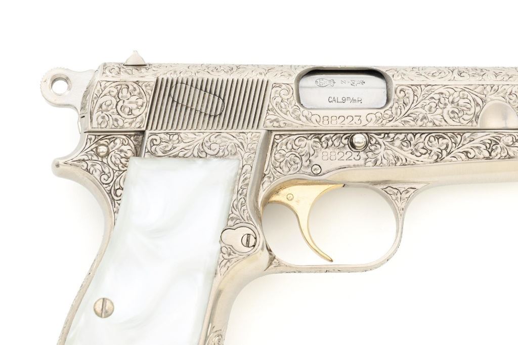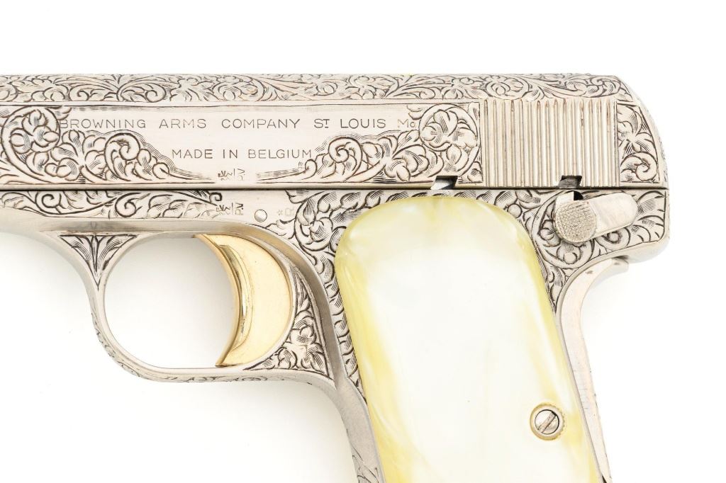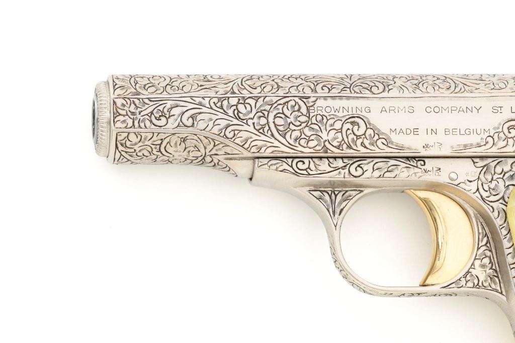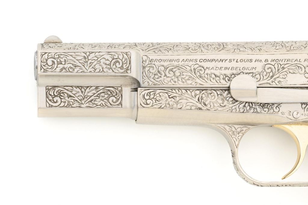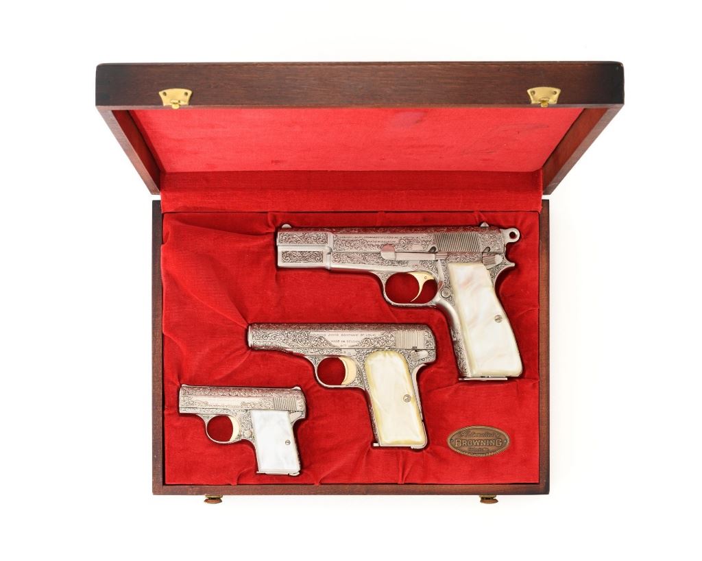 Set of Three Belgian Browning Renaissance Engraved Semi-Automatic Pistols, which includes the following: 1.) High Power, #88223, 9mm cal., 4.6" barrel, half-moon blade front sight, and dovetailed rear sight with "U"-notched groove. Mfgd 1959. 2.) Model 1955, #526194, .380 ACP cal., 3.5" barrel, small blade front sight and integral "U"-notched rear sight. Mfgd 1965. 3.) Baby, #139174, .25 ACP cal., 2.1" barrel, small blade front sight, and square-notched rear sight. Mfgd pre-1958. All feature a coin finish and extensive factory "Renaissance" engraving, gold colored triggers, pearlite grips, and retain their respective original magazines. All are displayed in a hardwood case with French fit red interior that has a Browning plaque in the lower right hand corner. The lid with a small brass plaque that has the previous owners name. Included is an original instruction manual. Pistols are in excellent overall condition; there is no flaking or finish loss, and minimal signs of handling. The sighting groove along the top of the Model 1955 pistol has a few spots that are slightly tarnished. Grips are excellent with the panels on the Model 1955 pistol showing some mild yellowing. All the actions function correctly and are like new. Bores are mirror bright with sharp lands and grooves. Exterior of the case has scattered small scratches and storage marks. Finish has blistered in the corners on the lid. Interior shows moderate age. Est.: $7,000-$9,000/set. (All C&R/PPT)