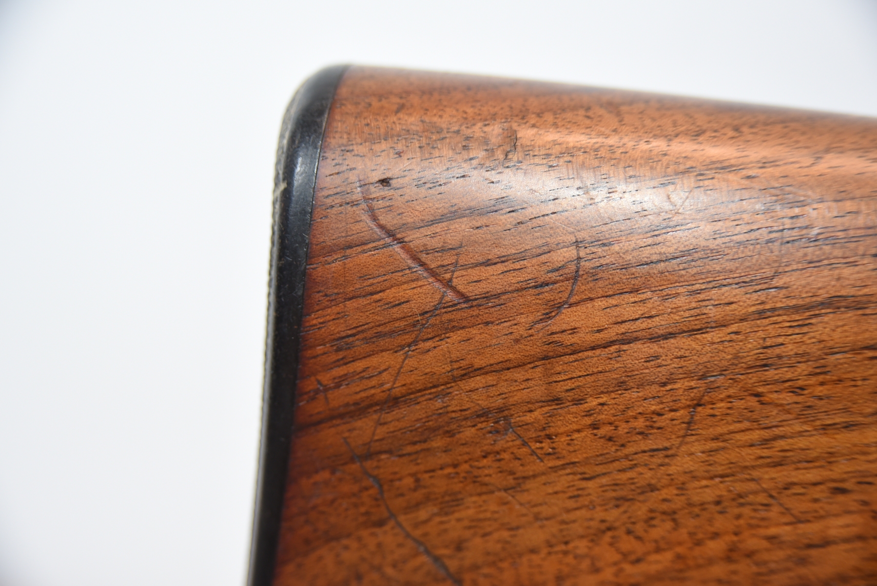 Wood stock shows scratches, scuff, light dents, there are cracks on either side of the stock by receiver area; condition is good.