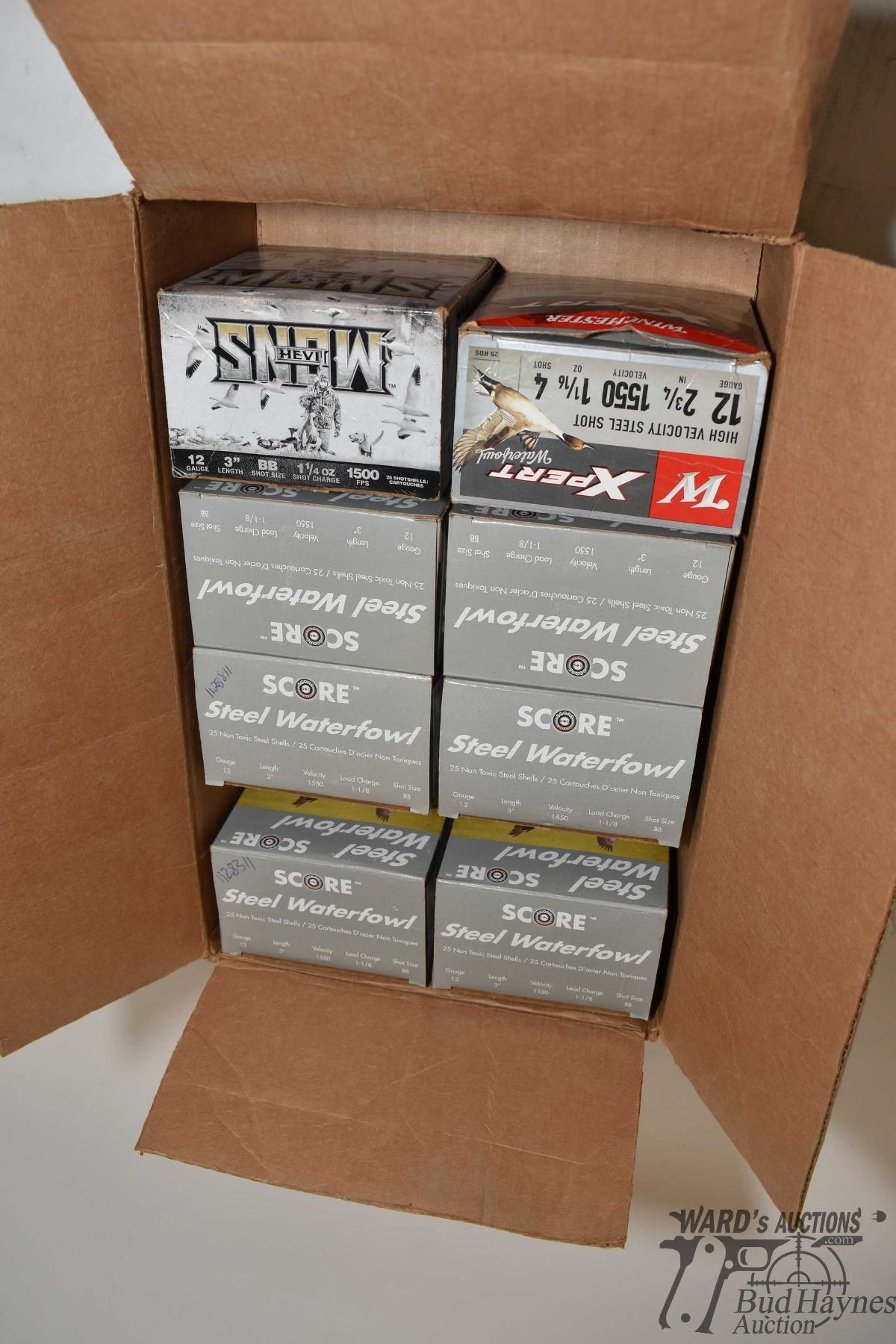Six full 25 count boxes of Score steel waterfowl 12 GA 3" BB and one full 25 count box and 10 loose snow hevi 12 GA 3" BB