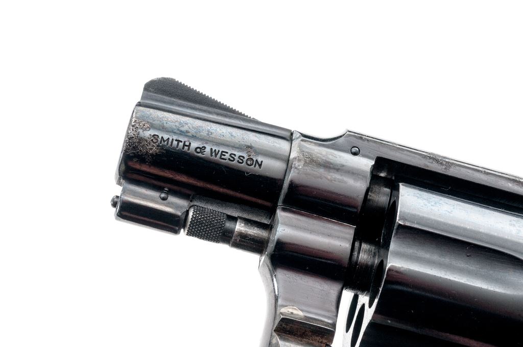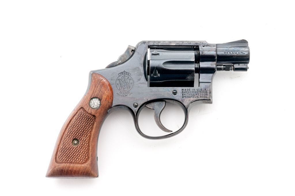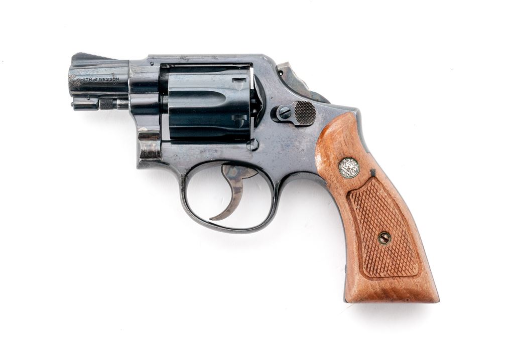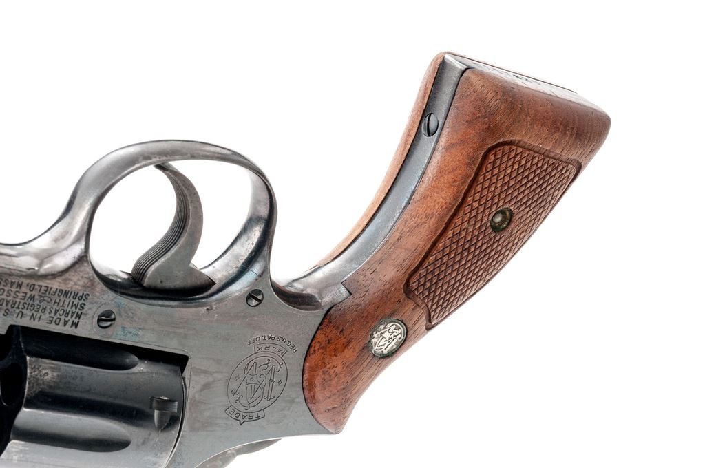 Smith & Wesson Model 10-5 Double Action Revolver, #D117820, .38 Spec. cal., 2" barrel, square butt, high-polish blue finish, two-piece factory checkered walnut grips with silver S&W medallions, ramped blade front sight and square-notched rear, with color case hardened hammer and trigger. Back of right grip is numbered and matches the revolver. Mfg'd circa 1969-1970. Condition is fair. Majority of the metal finish remains but there are scattered spots of moderate pitting on the barrel, frame, and cylinder. Hammer spur has been removed. Grips with general finish loss, surface dents, and scratches. Action cycles smoothly, cylinder locks up well. Bore is bright and rates in near excellent condition overall, rifling is defined. Est.: $200-$400. (C&R)