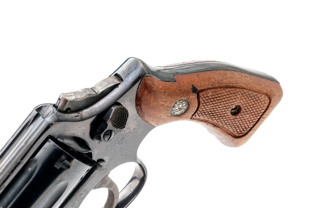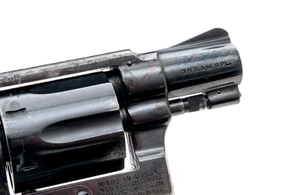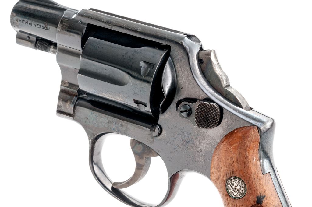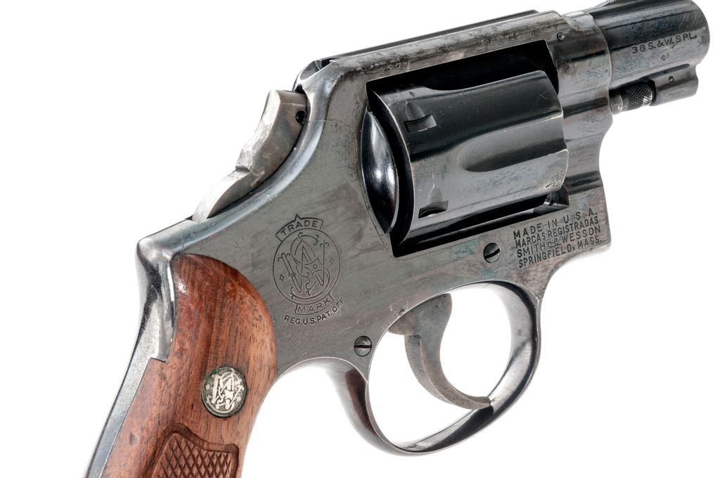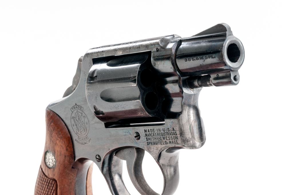 Smith & Wesson Model 10-5 Double Action Revolver, #D117820, .38 Spec. cal., 2" barrel, square butt, high-polish blue finish, two-piece factory checkered walnut grips with silver S&W medallions, ramped blade front sight and square-notched rear, with color case hardened hammer and trigger. Back of right grip is numbered and matches the revolver. Mfg'd circa 1969-1970. Condition is fair. Majority of the metal finish remains but there are scattered spots of moderate pitting on the barrel, frame, and cylinder. Hammer spur has been removed. Grips with general finish loss, surface dents, and scratches. Action cycles smoothly, cylinder locks up well. Bore is bright and rates in near excellent condition overall, rifling is defined. Est.: $200-$400. (C&R)