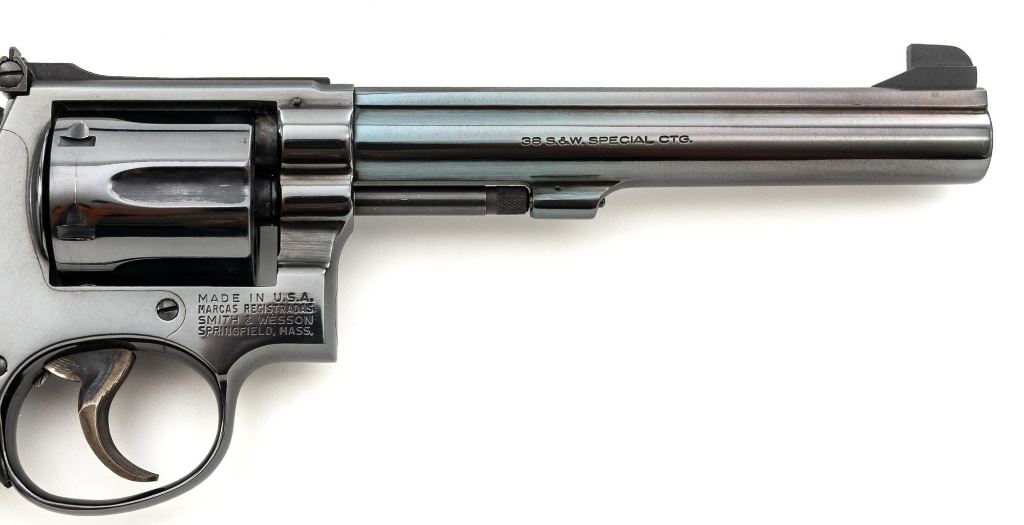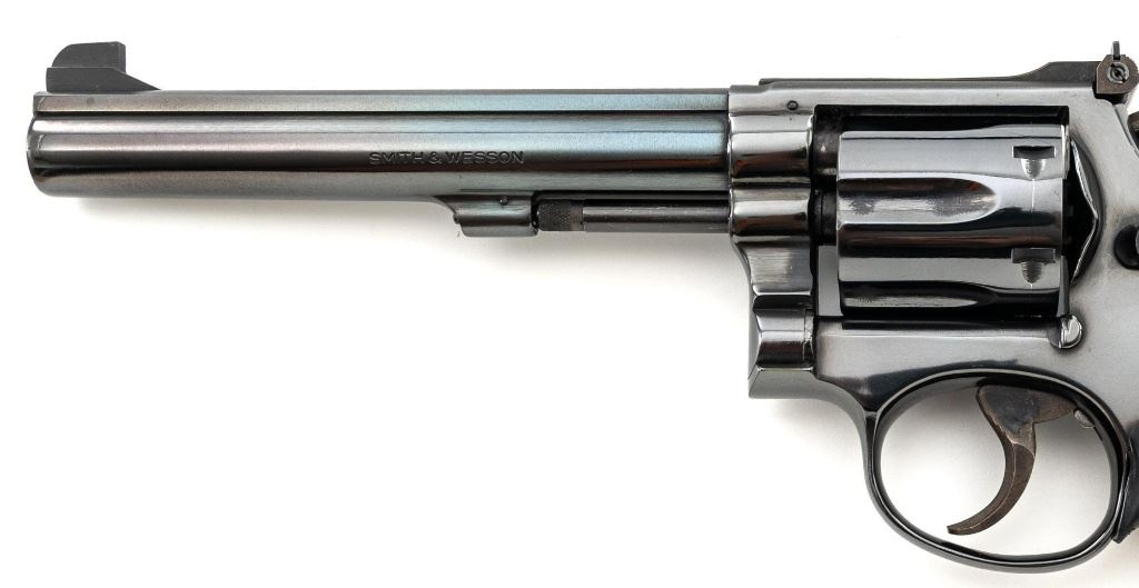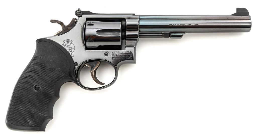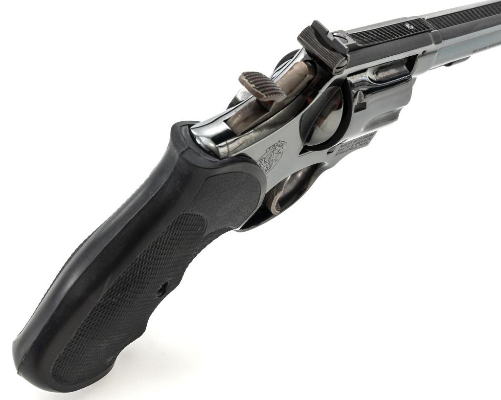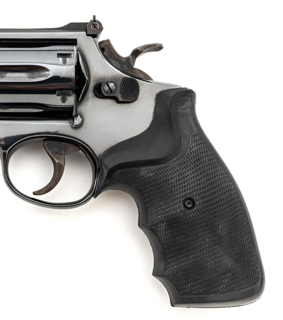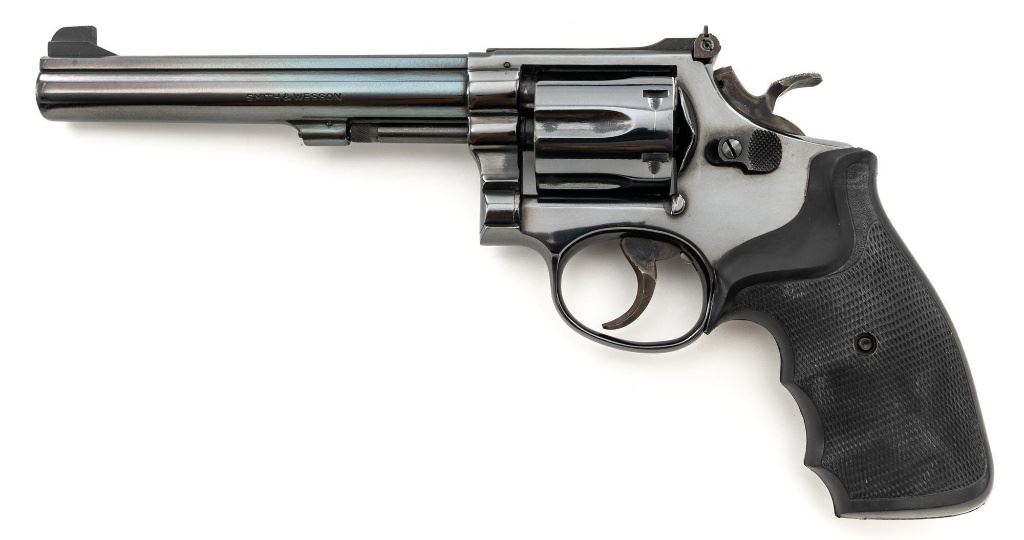 Smith & Wesson Model 14-3 Target Masterpiece Double Action Revolver, #5K82274, .38 Spl. cal., 6" pinned barrel, blue finish, checkered black rubber Pachmayr "Gripper" grips, Patridge front and micrometer adjustable square-notch rear sight, with target hammer and trigger. Mfgd 1974. Revolver is in near excellent overall condition, retaining approx. 96%-97% factory finish, showing light scratches and handling marks along the barrel. Cylinder with a faint index. Grips show light soiling from use. Action is not functioning correctly and needs repair. Bore is bright with near excellent rifling. Est.: $400-$600. (C&R/PPT)
