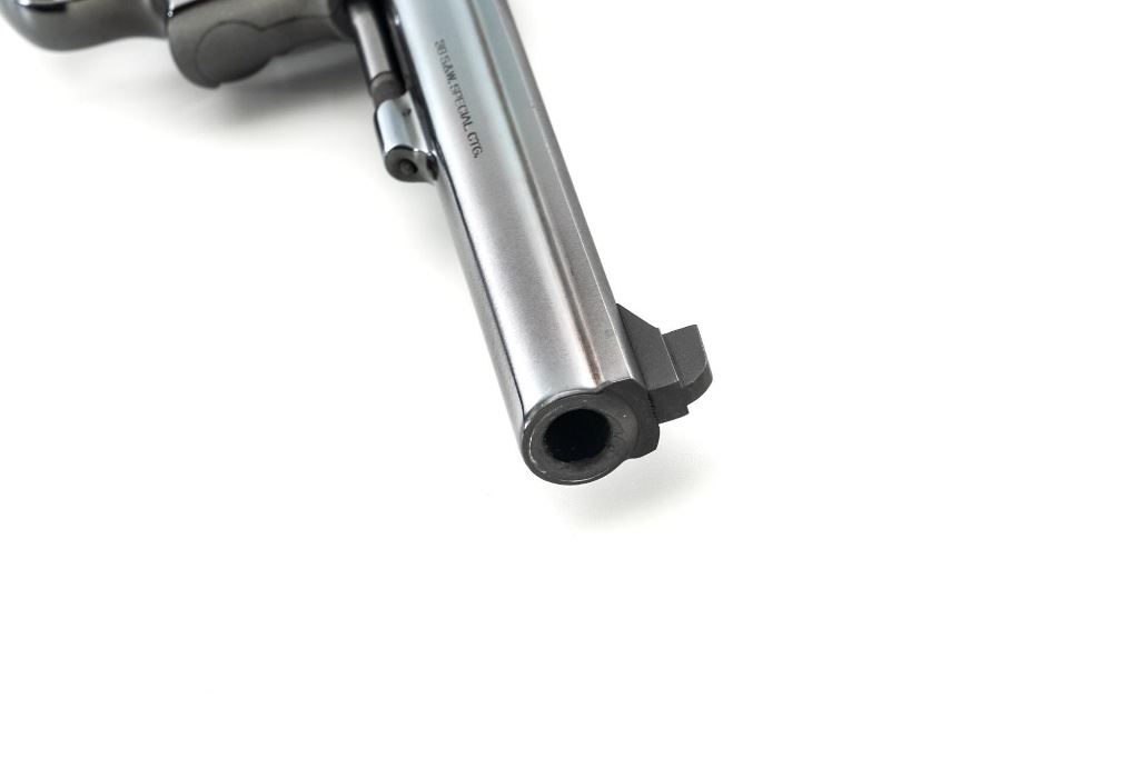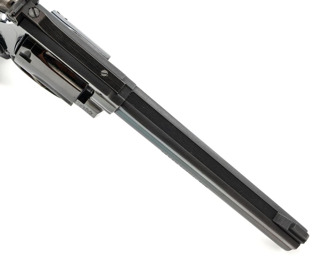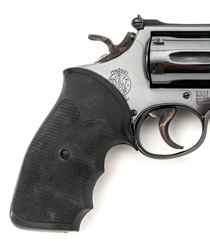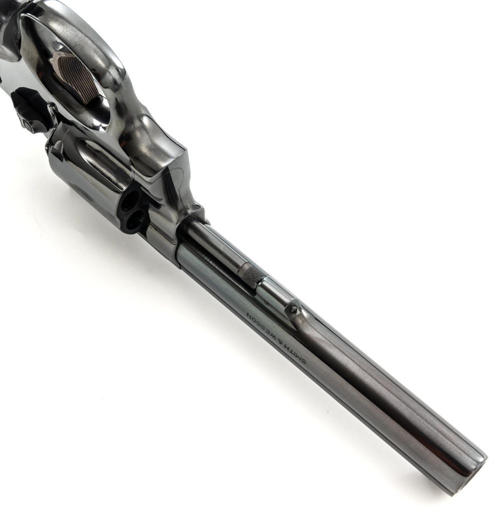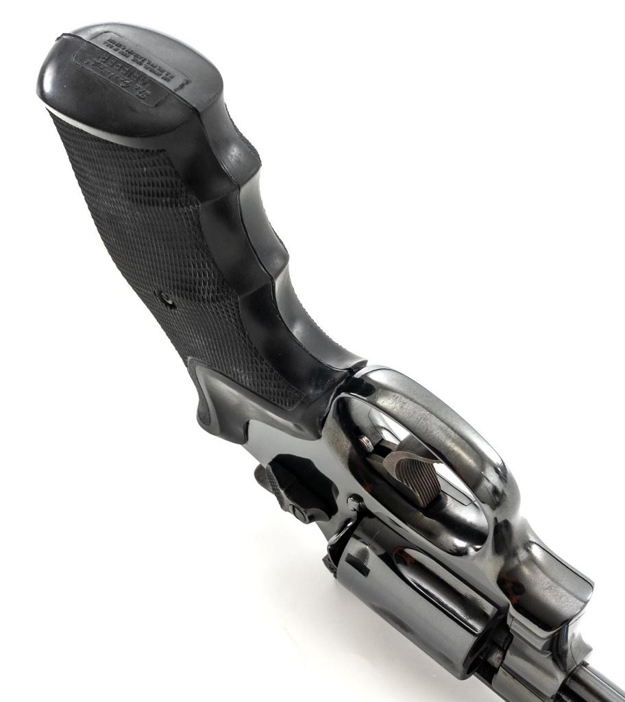 Smith & Wesson Model 14-3 Target Masterpiece Double Action Revolver, #5K82274, .38 Spl. cal., 6" pinned barrel, blue finish, checkered black rubber Pachmayr "Gripper" grips, Patridge front and micrometer adjustable square-notch rear sight, with target hammer and trigger. Mfgd 1974. Revolver is in near excellent overall condition, retaining approx. 96%-97% factory finish, showing light scratches and handling marks along the barrel. Cylinder with a faint index. Grips show light soiling from use. Action is not functioning correctly and needs repair. Bore is bright with near excellent rifling. Est.: $400-$600. (C&R/PPT)