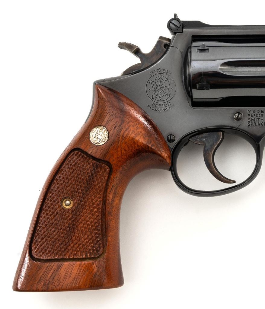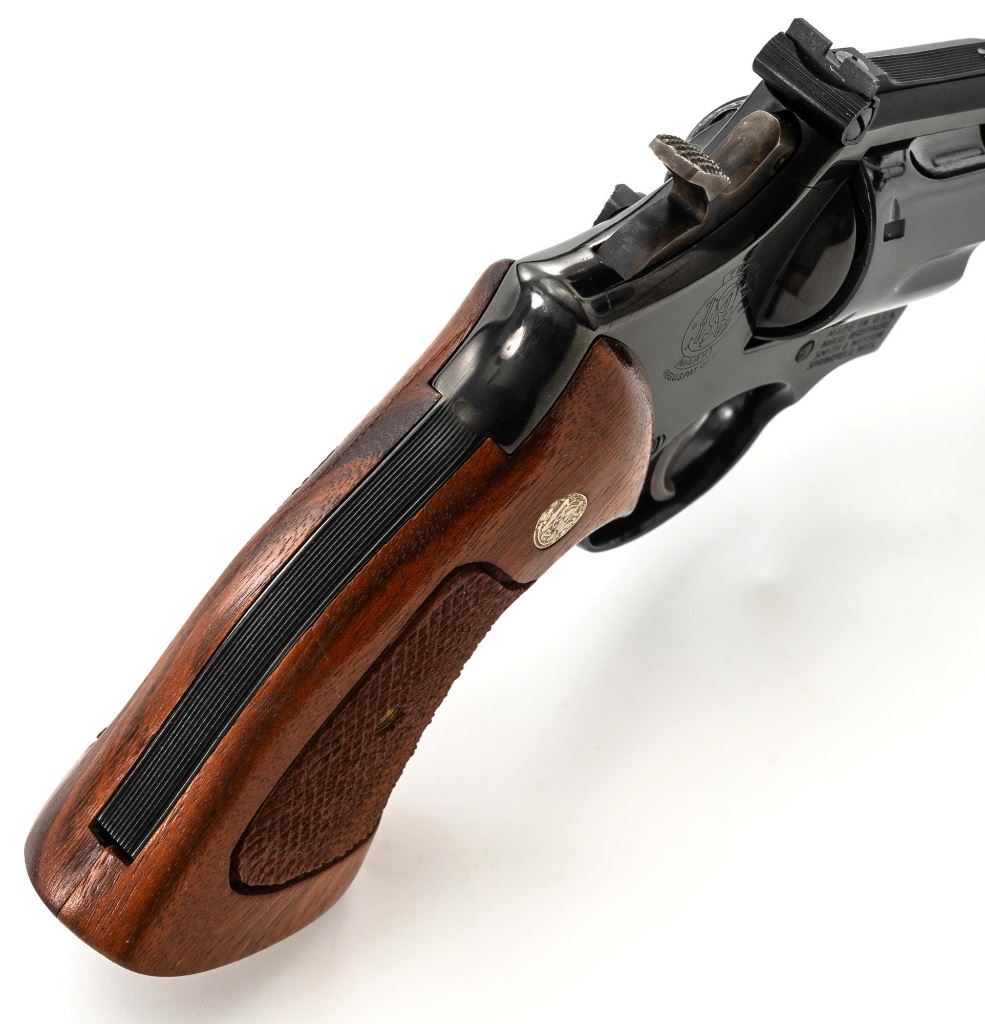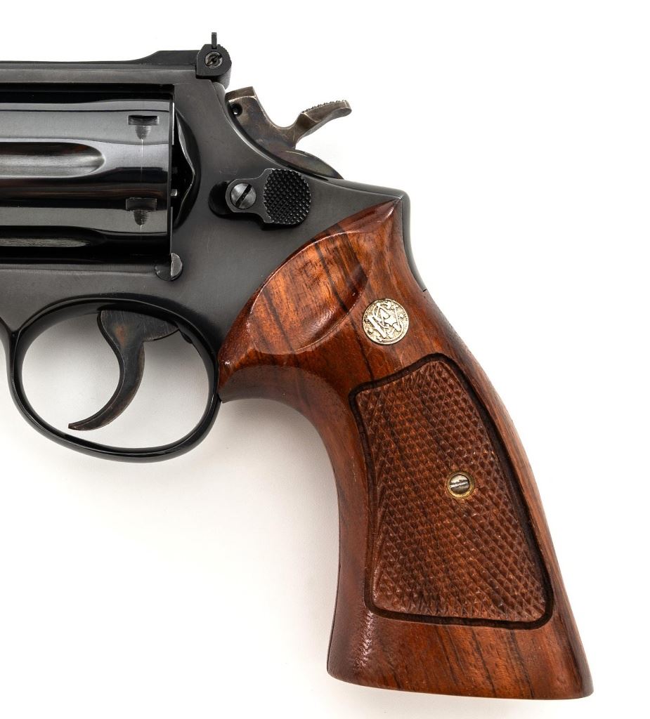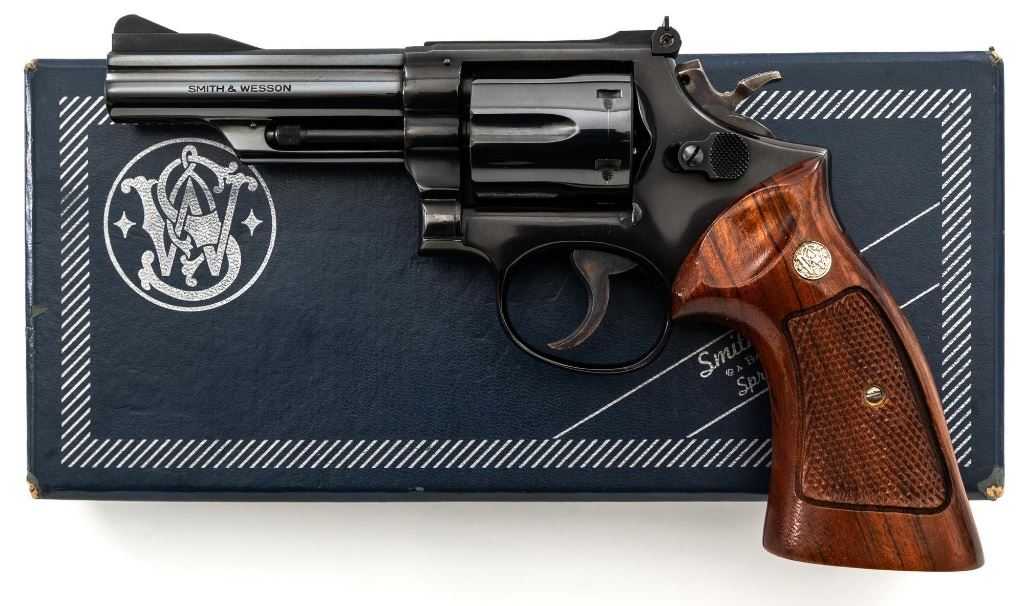 Smith & Wesson Model 19-3 Combat Magnum Double Action Revolver, #2K46732, .357 Mag., cal., 4" pinned barrel, blue finish, checkered walnut two-piece Magna grips with S&W medallions, Baughman ramped blade front and micrometer adjustable square-notch rear sight, with color case hardened hammer and trigger. Includes the factory cardboard box with matching end label, instruction manual, warranty card, screwdriver, brush, mop, cleaning rod, Brownells replacement main spring. and associated packaging materials. Box is in fine condition with corner wear and a minor stain inside the lid. Mfgd 1972. Revolver is in excellent overall condition, retaining approx. 98%-99% factory finish, with light handling marks and faint index line on the cylinder. Grips are in excellent condition with fine checkering detail, showing little use. Action is crisp. Bore is mirror bright with excellent rifling. Est.: $800-$1,200. (C&R)