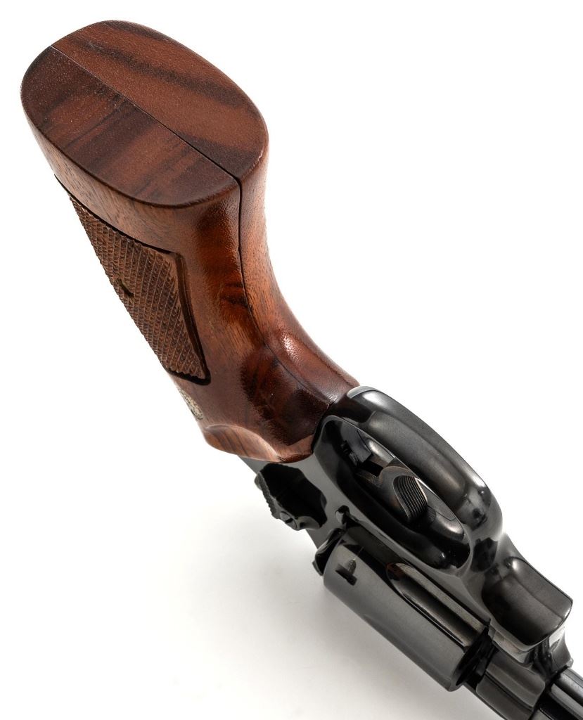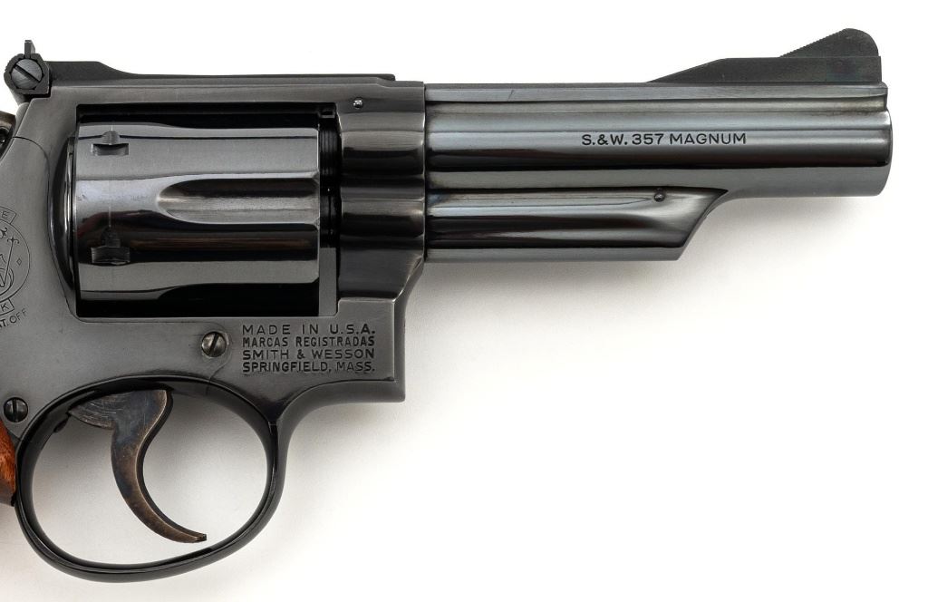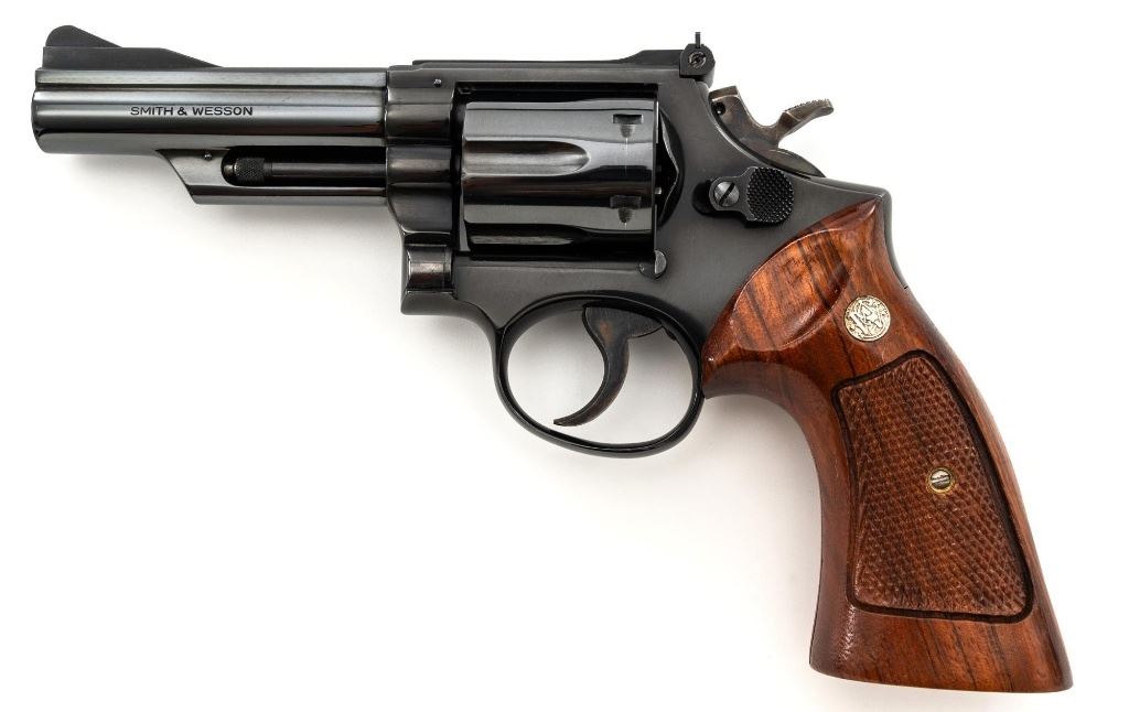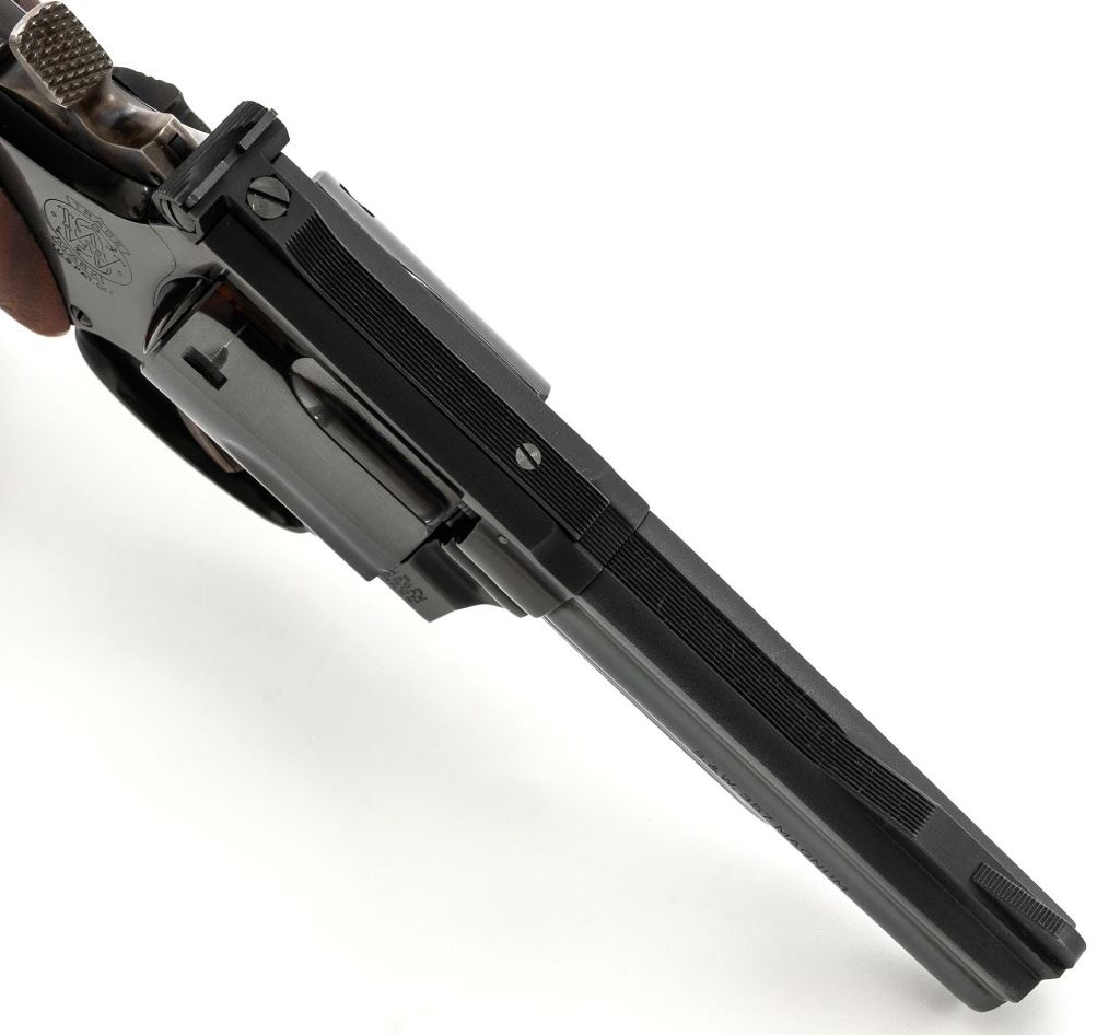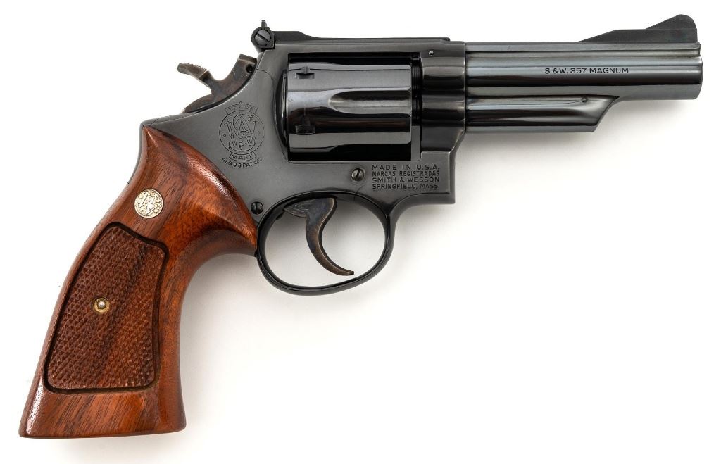 Smith & Wesson Model 19-3 Combat Magnum Double Action Revolver, #2K46732, .357 Mag., cal., 4" pinned barrel, blue finish, checkered walnut two-piece Magna grips with S&W medallions, Baughman ramped blade front and micrometer adjustable square-notch rear sight, with color case hardened hammer and trigger. Includes the factory cardboard box with matching end label, instruction manual, warranty card, screwdriver, brush, mop, cleaning rod, Brownells replacement main spring. and associated packaging materials. Box is in fine condition with corner wear and a minor stain inside the lid. Mfgd 1972. Revolver is in excellent overall condition, retaining approx. 98%-99% factory finish, with light handling marks and faint index line on the cylinder. Grips are in excellent condition with fine checkering detail, showing little use. Action is crisp. Bore is mirror bright with excellent rifling. Est.: $800-$1,200. (C&R)