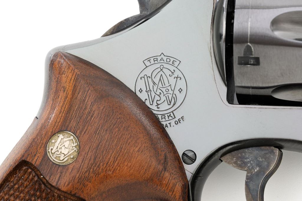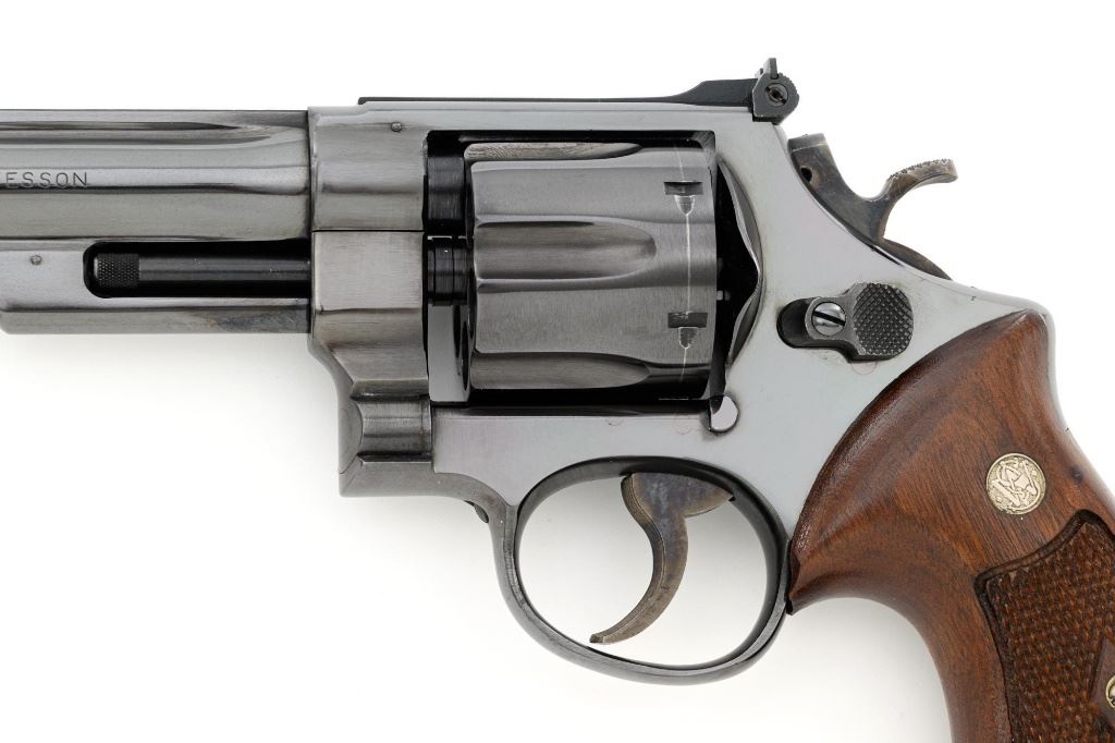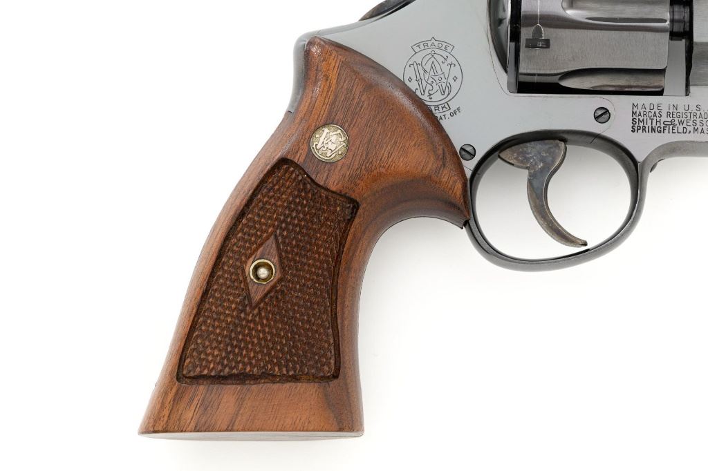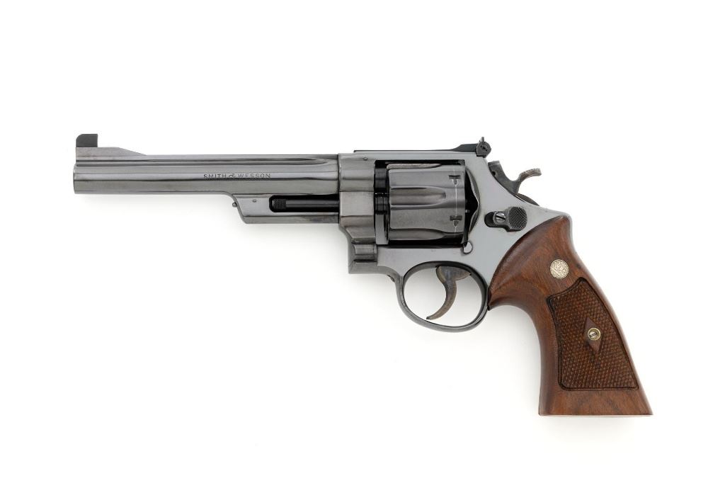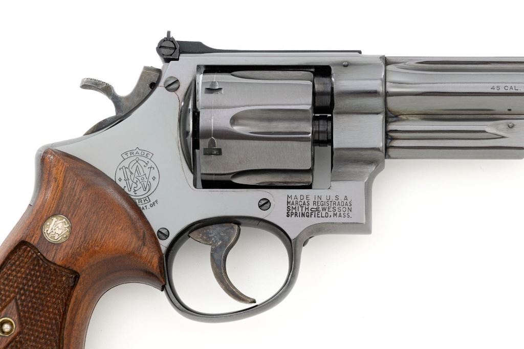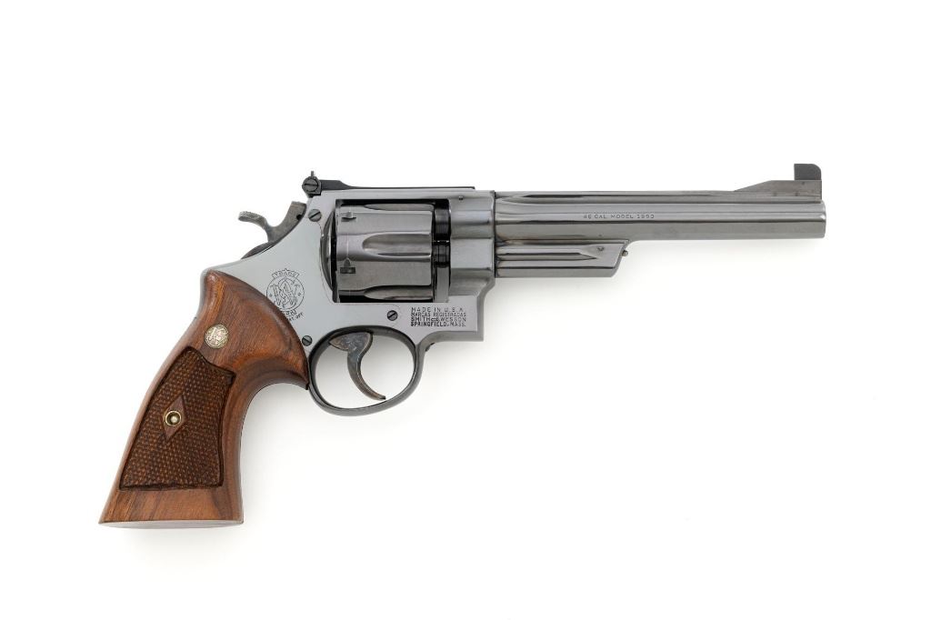 Smith & Wesson Model 1950 .45 Target (Pre-Model 26) Double Action Revolver, #S145399, .45 ACP cal., 6.5" pinned barrel, bright blue finish, checkered walnut diamond center two-piece target grips with S&W medallions, Patridge front sight, micrometer adjustable square-notch rear sight, 5-screw frame, color case hardened target hammer and factory ribbed trigger. Matching visible serial numbers, except for grips. Mfgd 1956. Includes five (5) blue steel moon clips. Revolver is in excellent overall condition, retaining approx. 97%-98% factory finish, with light wear at the muzzle. Cylinder shows minor leading edgewear and a faint index line at the rear. Factory markings are clear. Grips are excellent with sharp checkering detail and a non-matching number on the interior of the right panel. Action functions well and locks up securely. Bright bore rates excellent with well-defined rifling. The consignor notes that a Wolff reduced power main spring has been added. Est.: $1,200-$1,500. (C&R)