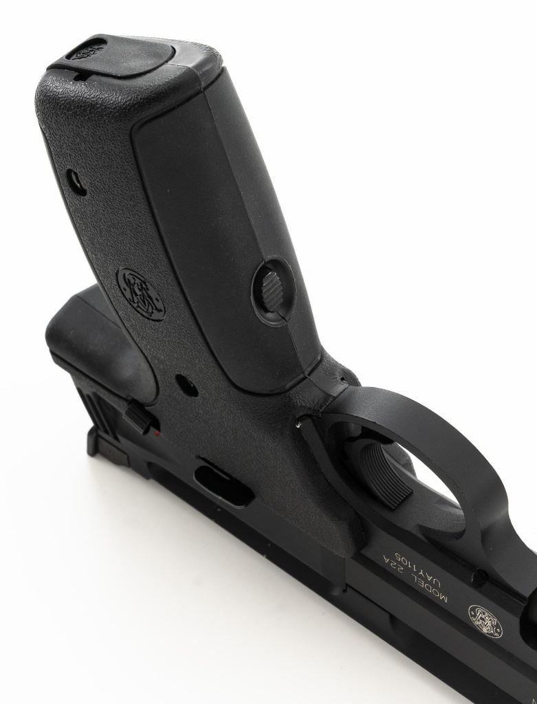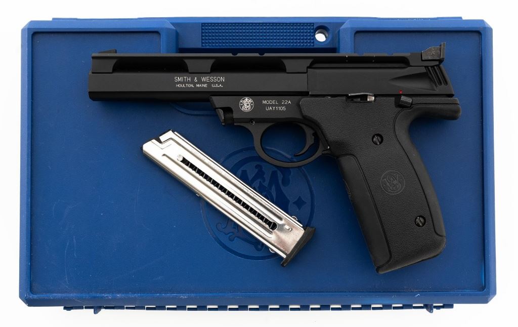 Smith & Wesson Model 22A Semi-Automatic Pistol, #UAY1105, .22 LR cal., 5.5" bull barrel, dark blue finish, black aluminum alloy frame, original two-piece black polymer grips. Pistol features a solid raised rib that is grooved for scope mounts, with integral blade front sight, adjustable square-notched rear sight, with two (2) factory 10-round magazines. In original blue plastic case with matching numbered end label and owner's manual. Condition is excellent, retaining approx.98% factory finish, with only minor handling marks. Grips show minimal wear. Action is smooth, bore is bright with excellent rifling. Est.: $200-$350. (Modern/PPT)