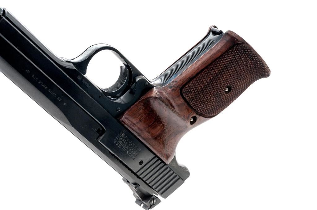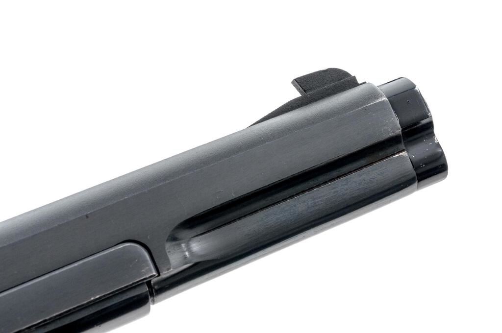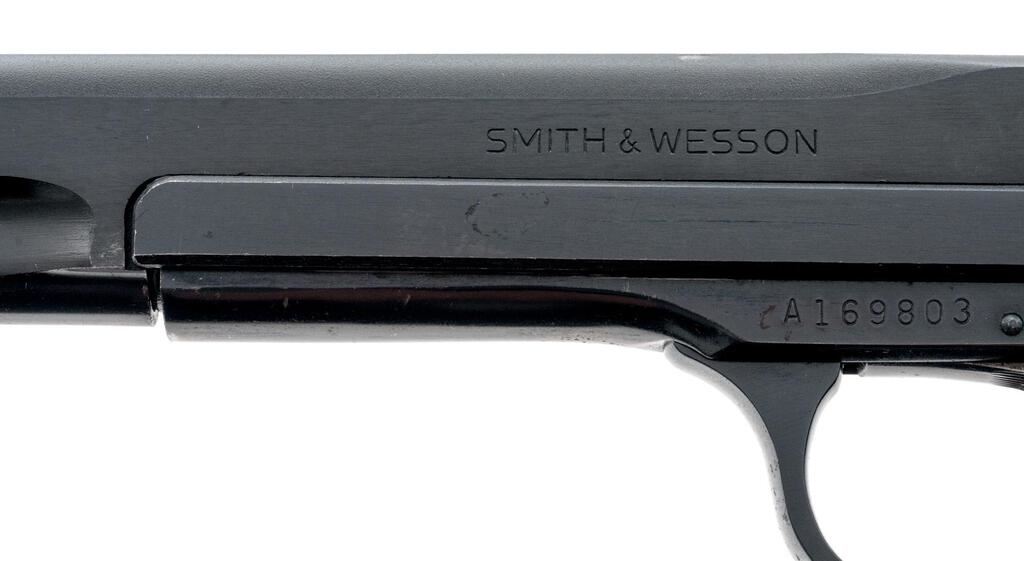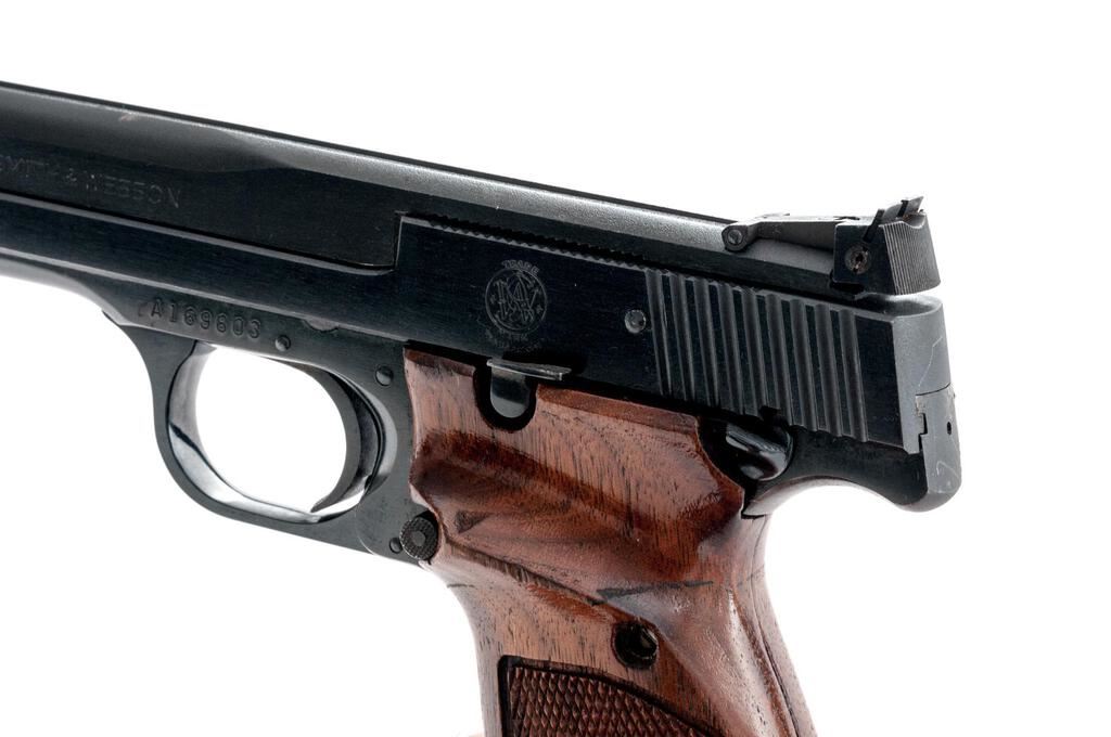 Smith & Wesson Model 41 (No Dash) Semi-Automatic Match Target Pistol, #A169803, .22 LR cal., 7.38" barrel, Patridge front and adjustable rear sights, early cocking indicator, blue finish, checkered wood two-piece thumb-rest target grips with flared magazine well, 10-rd. S&W marked magazine. Mfg'd 1972. Pistol is in near fine overall condition retaining approx. 90%-92% factory finish, with wear at the muzzle, light scratches and mars consistent with use. Pistol shows edgewear with small rubs on top of the slide, and thinning of finish on the front grip strap and rear of slide. Checkered wood target grips are good with dents, compressions, and wear along the thumb rest. There is a larger scratch at the rear of the left panel. Action is smooth, bore is very good with well-defined rifling. Est.: $800-$1,000. (C&R/PPT)