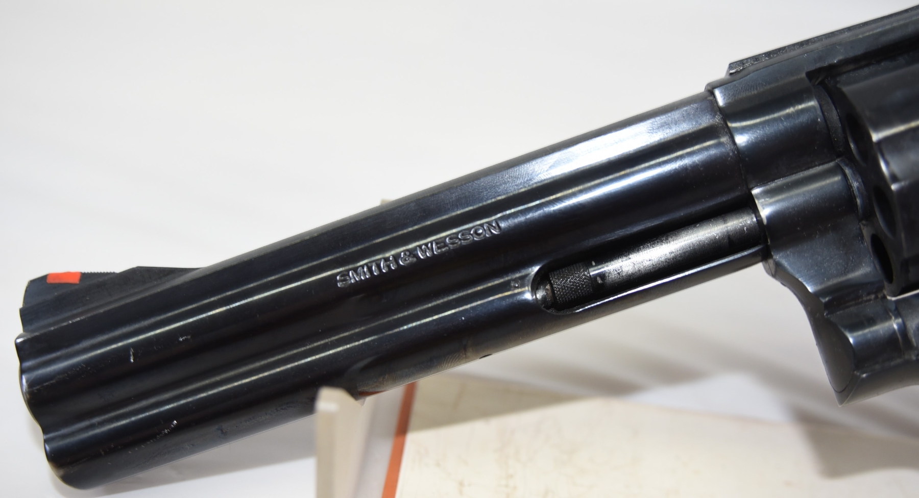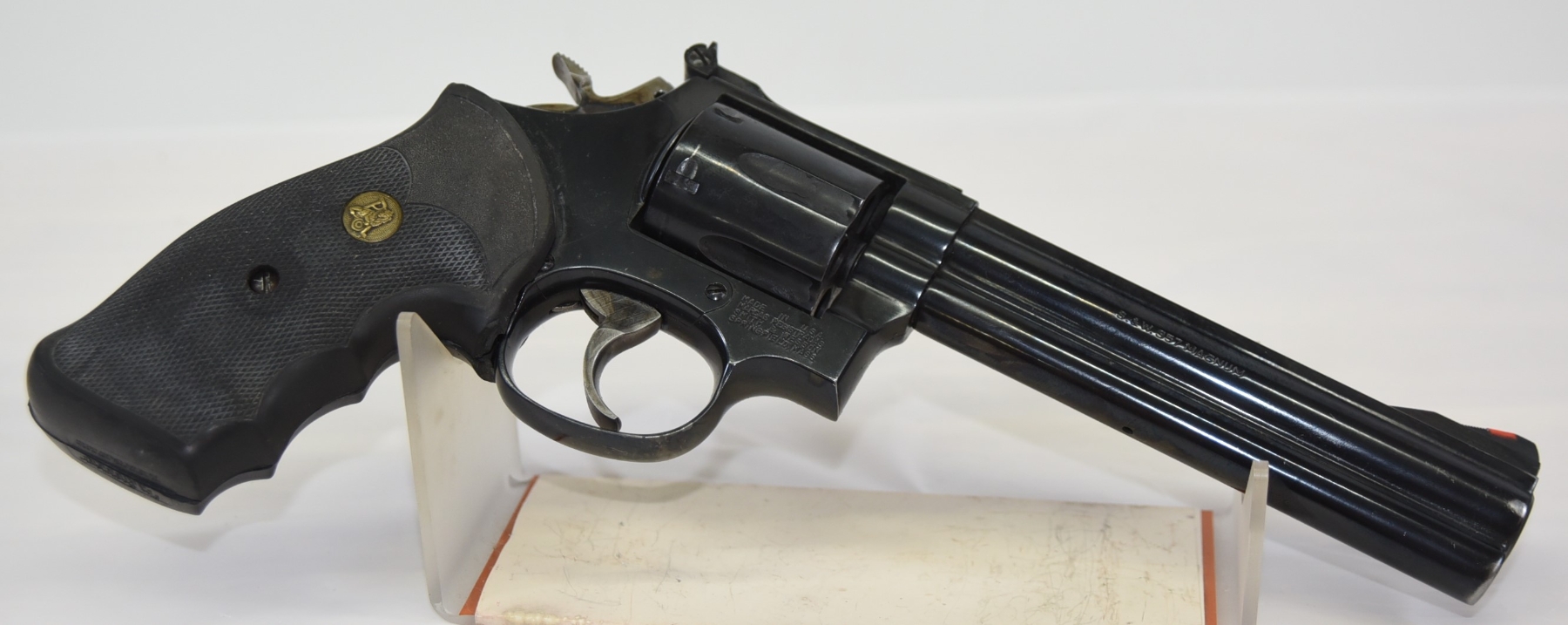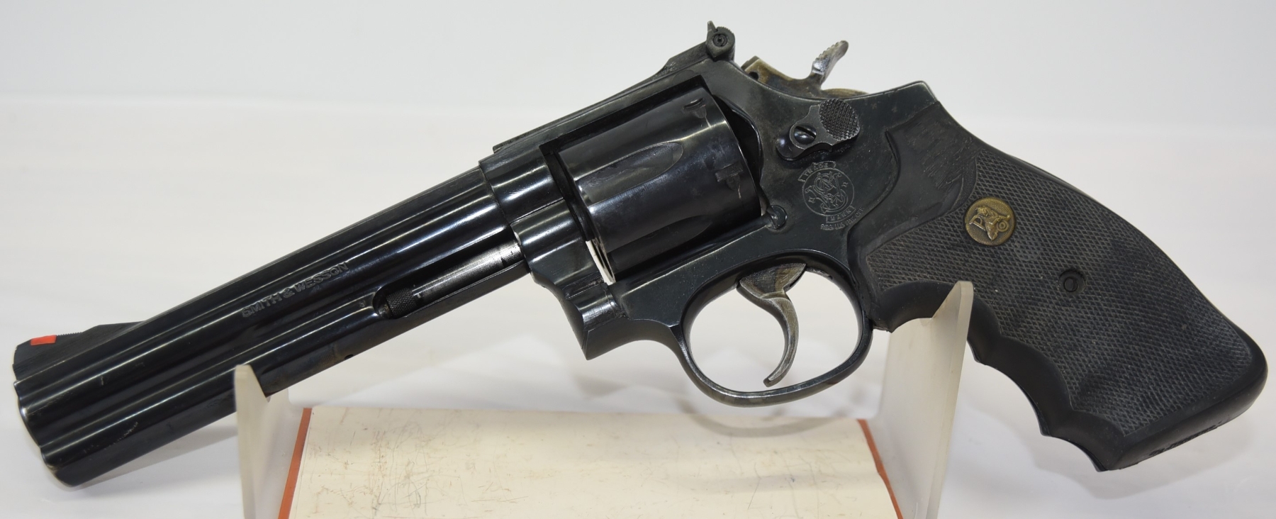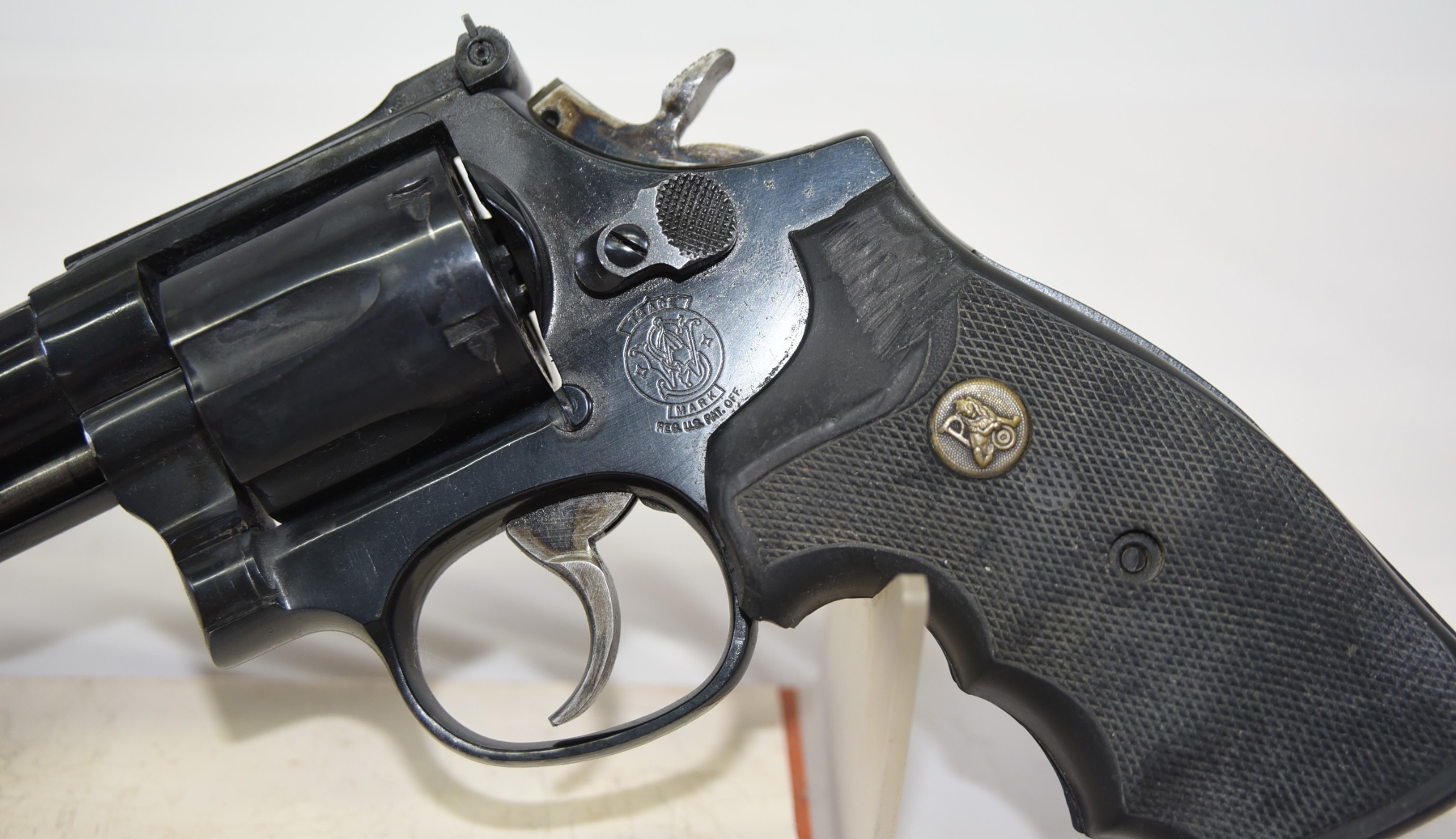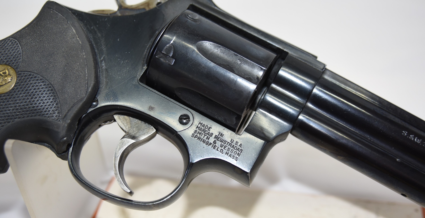 Rubber grips show marring on the left side, fitment appears incorrect on frame (grips may belong to another S&W model); condition is fair.