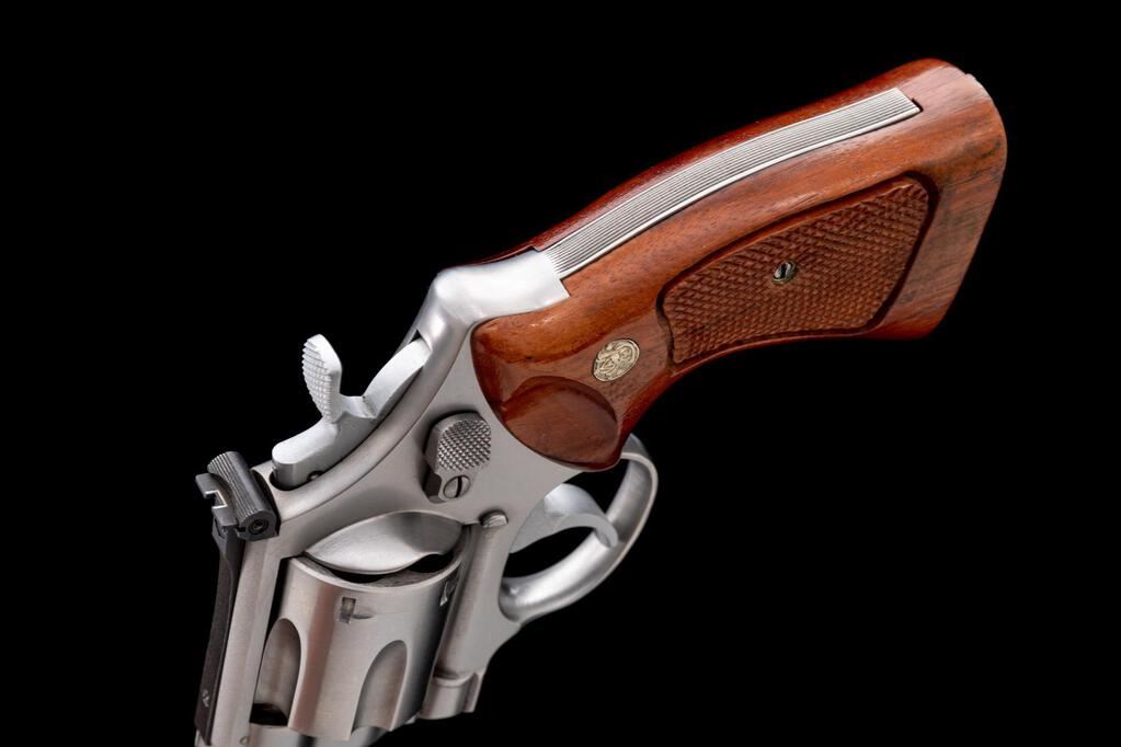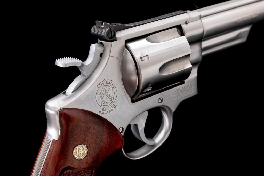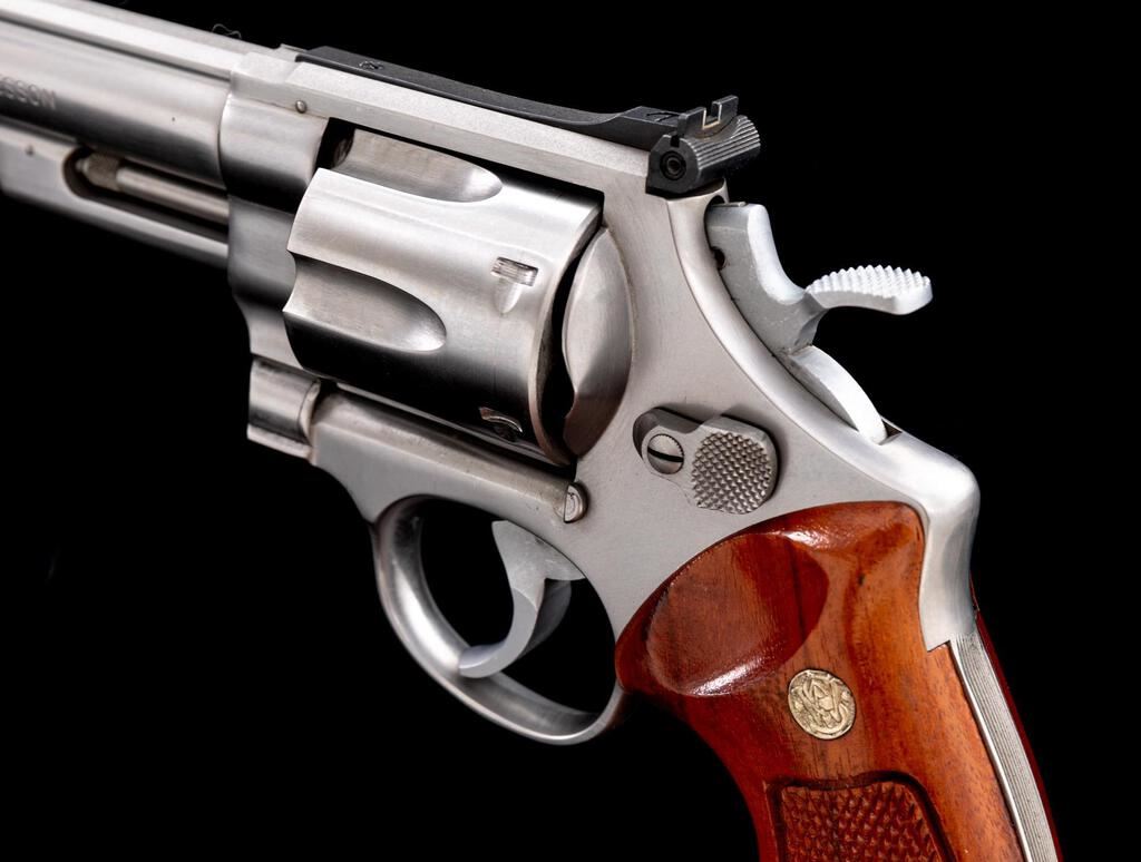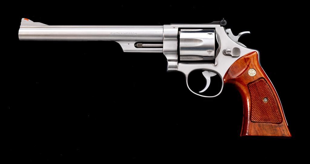 Smith & Wesson Model 629 Double Action Revolver, #N870200, .44 Mag. cal., 8-3/8" pinned barrel, satin stainless finish, checkered target grips with S&W medallions, recessed cylinder, red ramp front sight and fully adjustable square-notched with white outline rear sight, smooth target trigger and checkered target hammer. Mfg'd ca. 1980-1981. Condition is excellent. Metal with intermittent mild scratches and handling marks. Light powder marks on the cylinder face. Grips are also excellent showing little handling wear, checkering is sharp. Action cycles smoothly and locks up securely. Excellent mirror bright bore with well-defined rifling. Est.: $1,000-$1,400. (Modern/PPT)