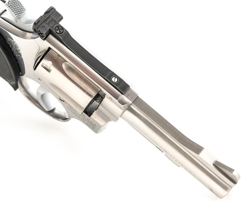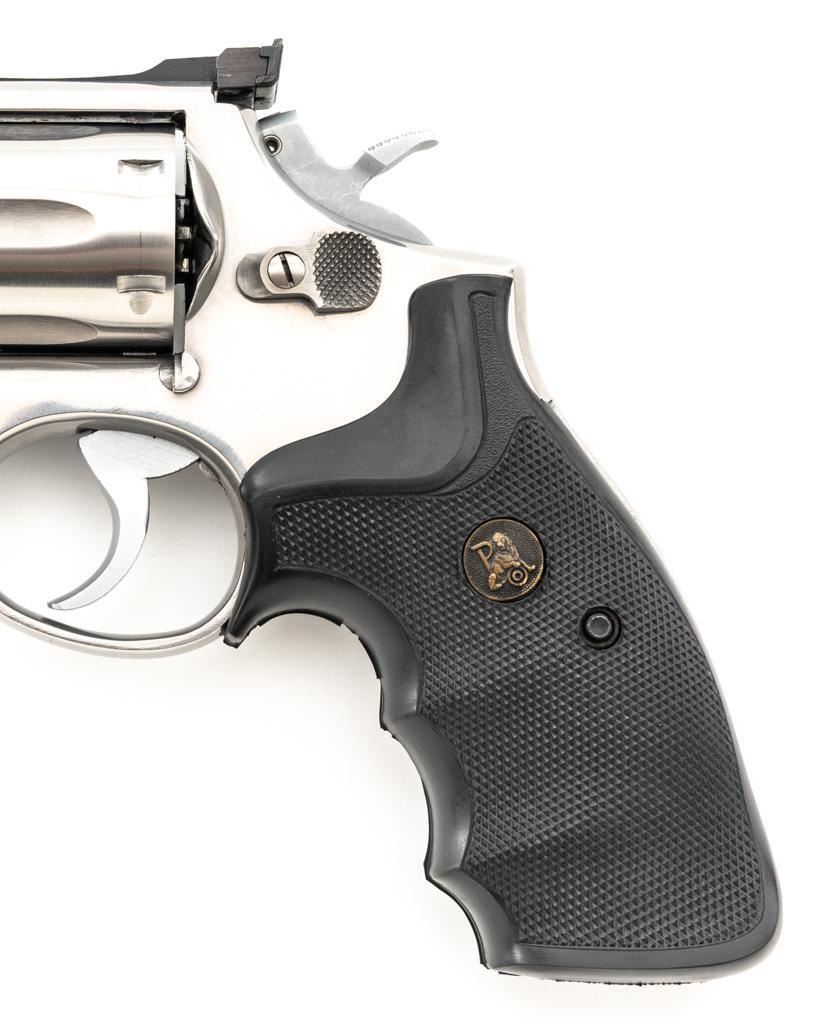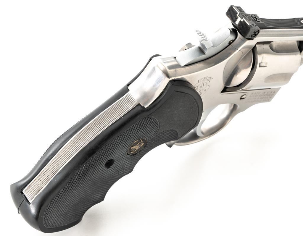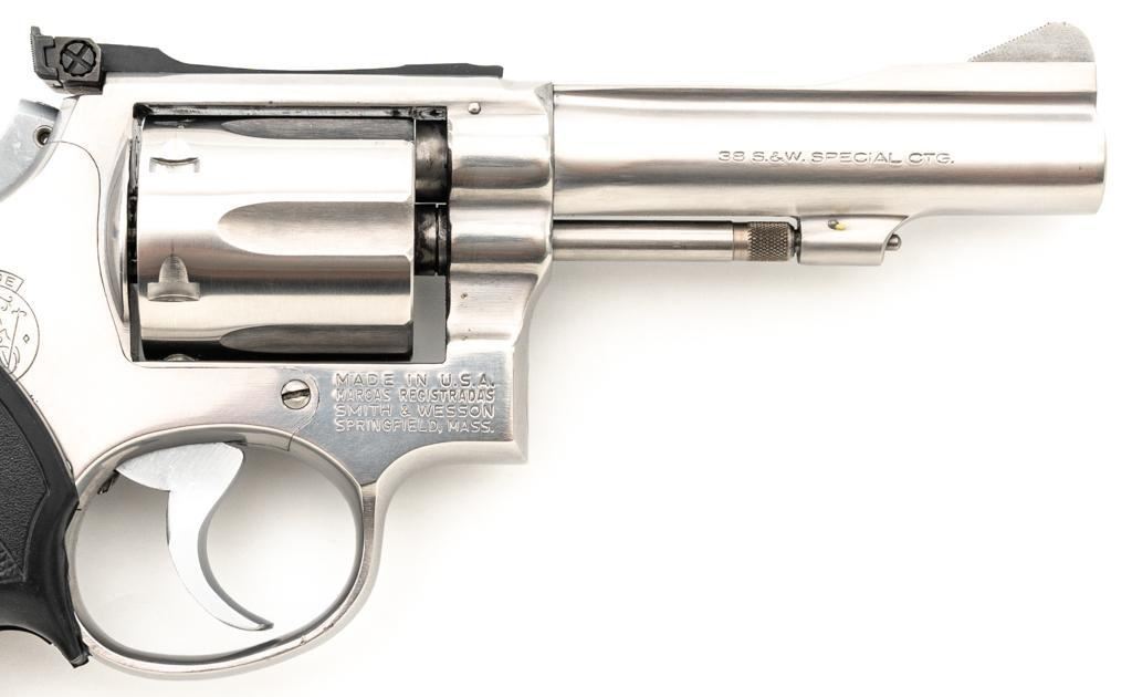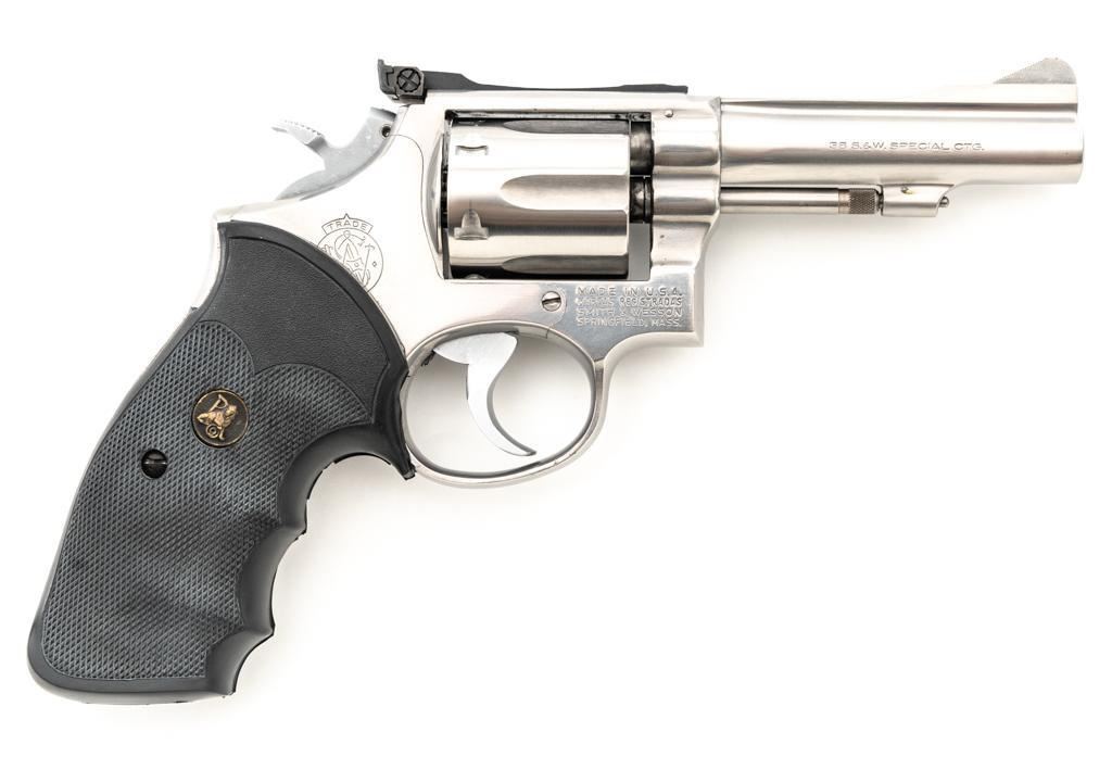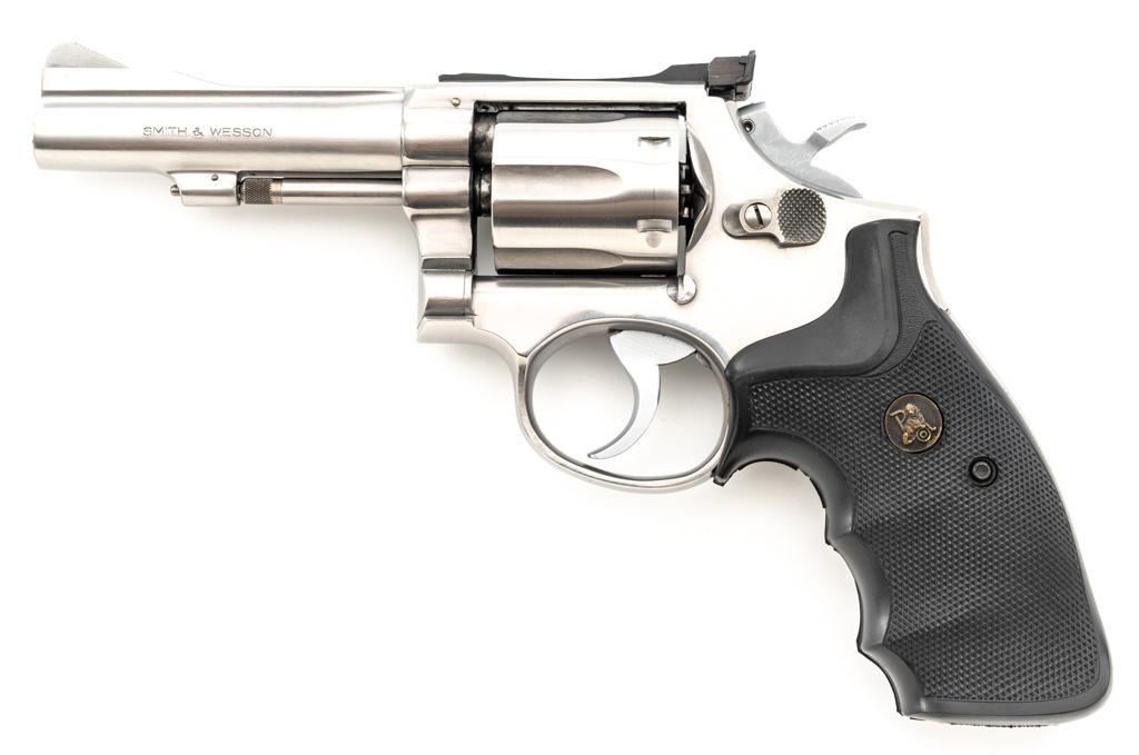 Smith & Wesson Model 67 No Dash Double Action Revolver, #5K20011, .38 Spl. cal., 4" pinned barrel, satin stainless steel finish, checkered rubber Pachmayr "Gripper" two-piece combat grips, serrated ramped blade front sight, and white-outline adjustable square-notched rear sight. Mfgd 1973. Revolver is in near excellent overall condition, with light wear at the muzzle, and a faint index line on the cylinder. Grips are in near excellent condition, showing light handling wear. Action functions smoothly and locks up securely. Bore is near excellent with crisp rifling. Est.: $600-$800. (C&R/PPT)