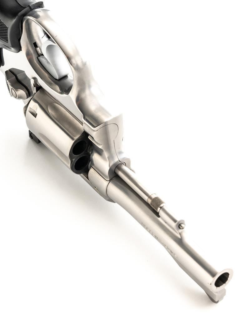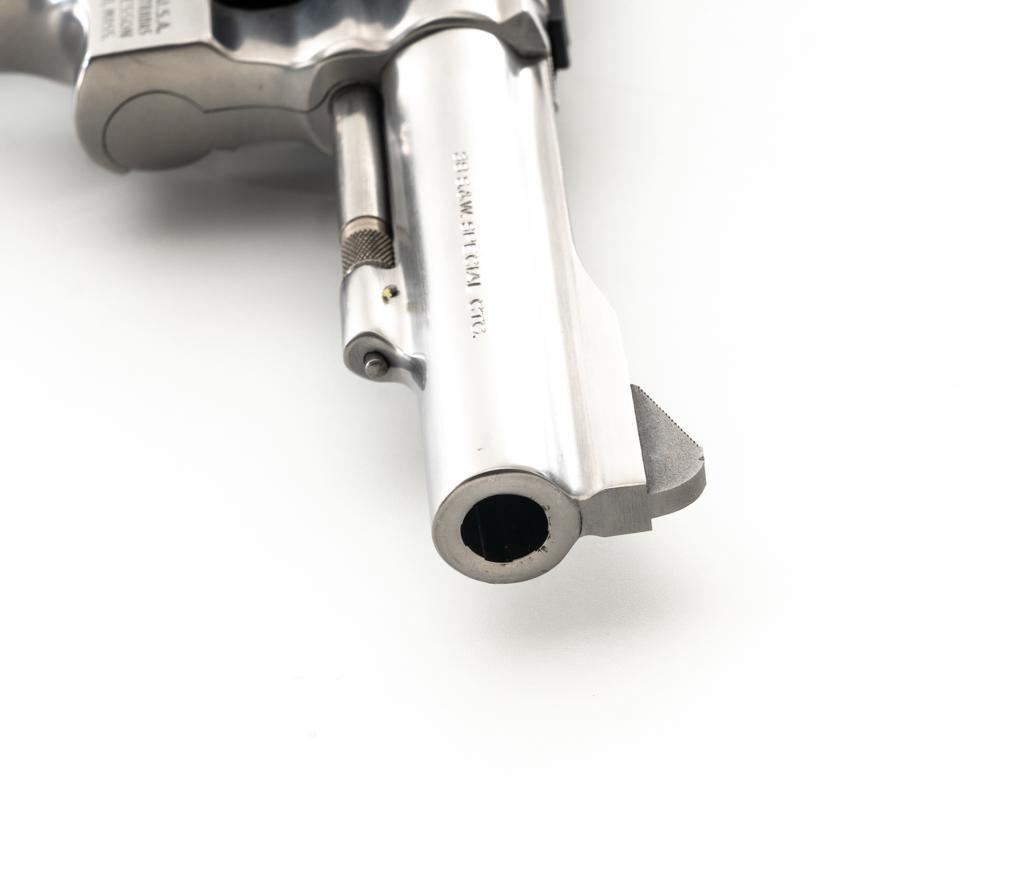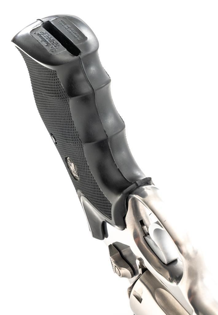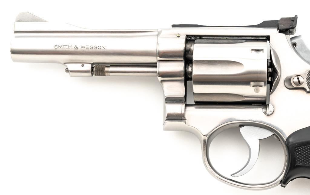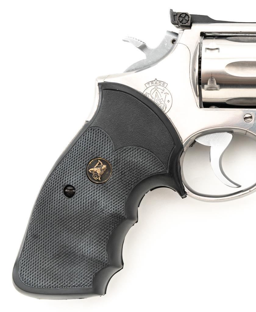 Smith & Wesson Model 67 No Dash Double Action Revolver, #5K20011, .38 Spl. cal., 4" pinned barrel, satin stainless steel finish, checkered rubber Pachmayr "Gripper" two-piece combat grips, serrated ramped blade front sight, and white-outline adjustable square-notched rear sight. Mfgd 1973. Revolver is in near excellent overall condition, with light wear at the muzzle, and a faint index line on the cylinder. Grips are in near excellent condition, showing light handling wear. Action functions smoothly and locks up securely. Bore is near excellent with crisp rifling. Est.: $600-$800. (C&R/PPT)