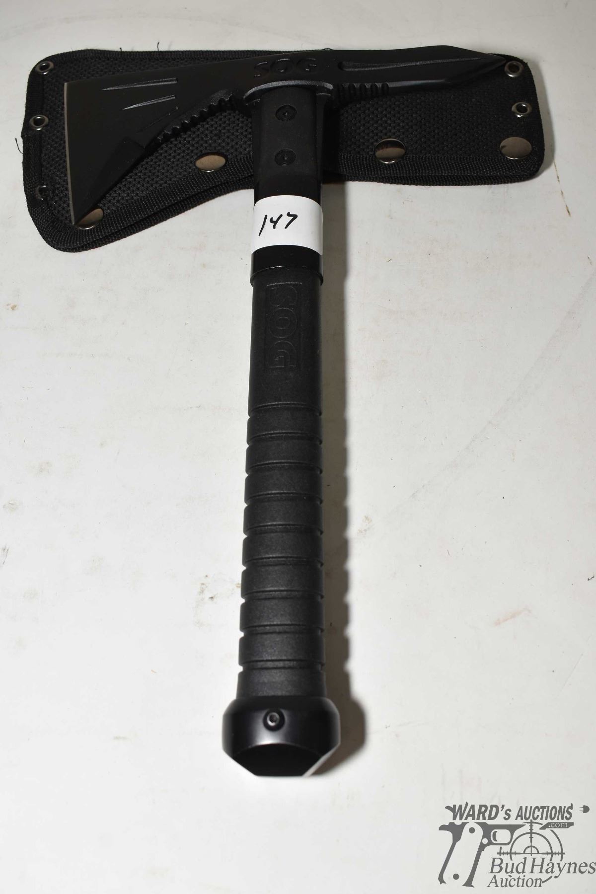 Sog voodoo hawk tactical axe w/ clamshell case, flat black head and 12" handle