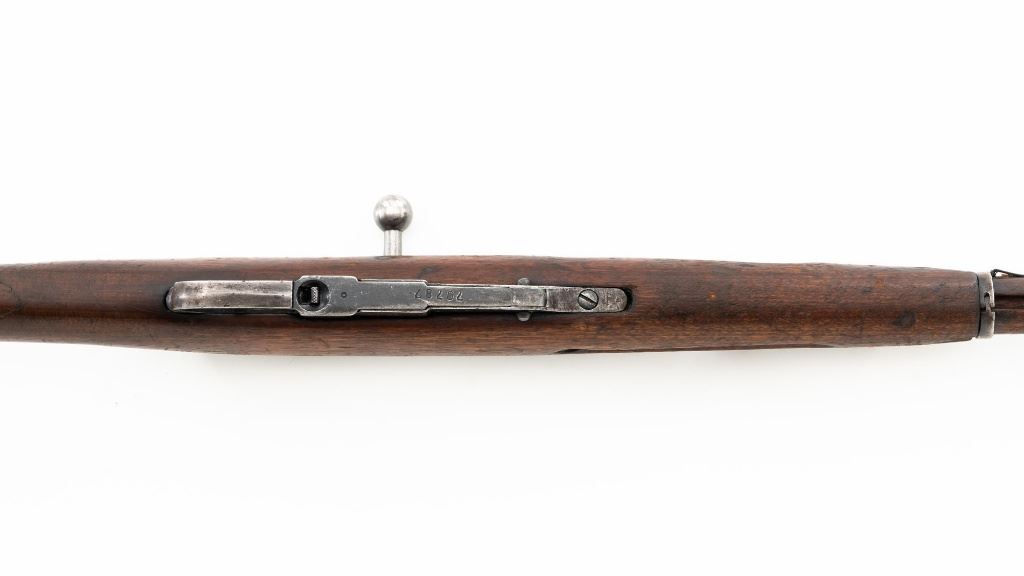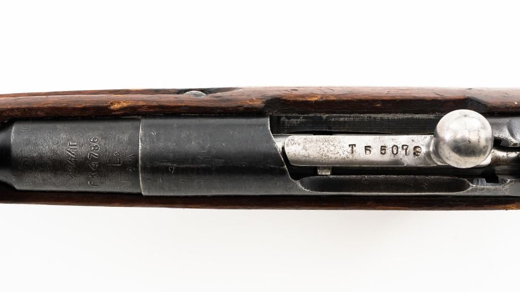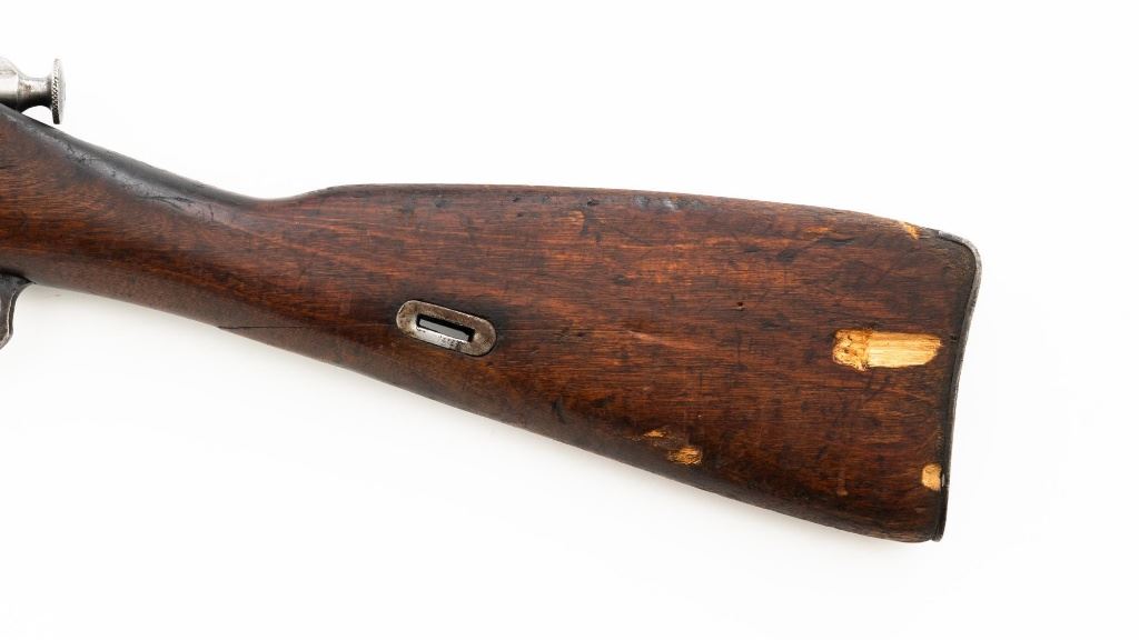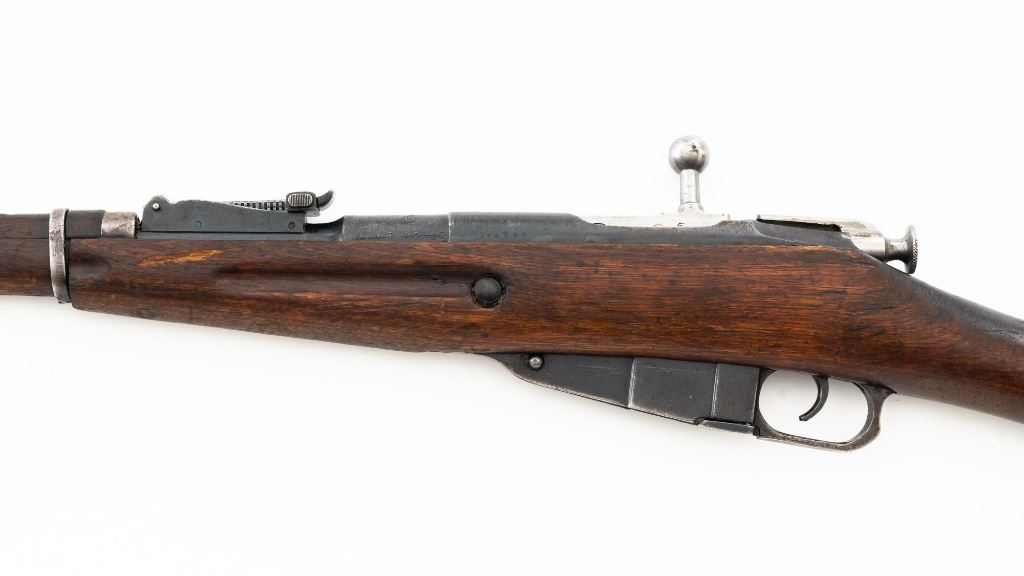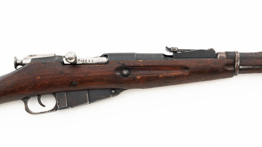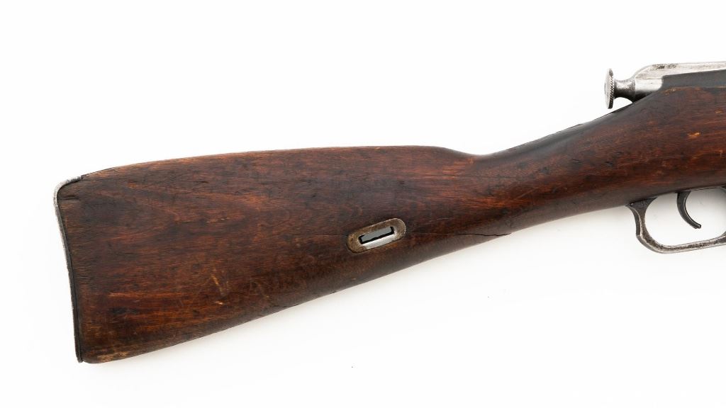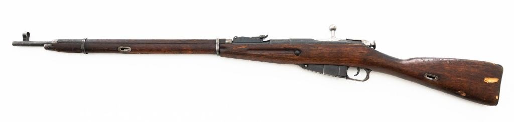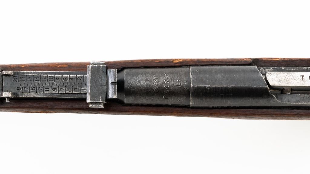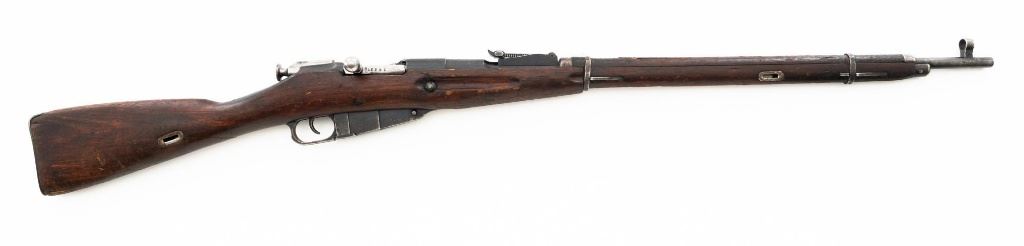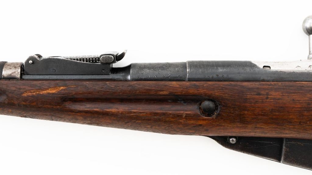 Soviet M91/30 Mosin Nagant Bolt Action Rifle, #GK4786, 7.62x54Rmm cal., 29" barrel, blued finish with bright bolt assembly, hardwood stock and handguard, hooded post front sight, and adjustable tangent rear sight with "U"-notched groove, graduated to 2000 meters. Steel cleaning rod is missing. Top of the barrel shank is marked with faint "(Soviet crest)" over "1944r/GK4786/(Izhevsk Arsenal symbol)". An old number has been barred out on the left side. Matching numbered buttplate, other numbered parts do not match. Import marked on right side of the barrel. Condition overall is about fair, retaining approx. 50%-60% blue, showing considerable age and wear. Bolt assembly is good with a few spots of patina. Wood is in poor condition with overall dents and scratches, with a few newer chips missing from the left side. Additionally, there is a crack through the stock wrist and a break to top of the handguard. Action operates smoothly. Bore is dark, pitted, and has fair worn rifling. Est.: $150-$300. (C&R)