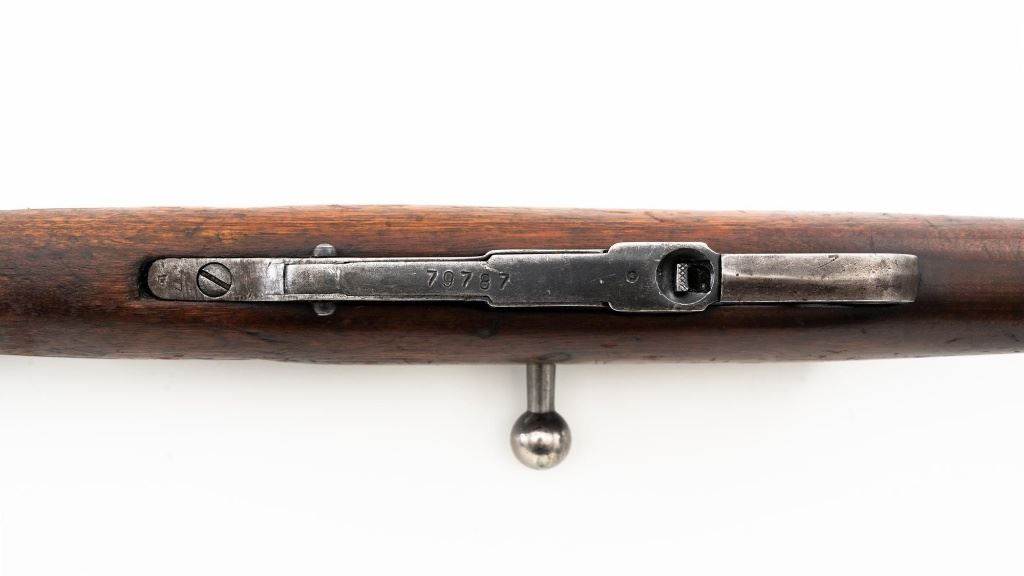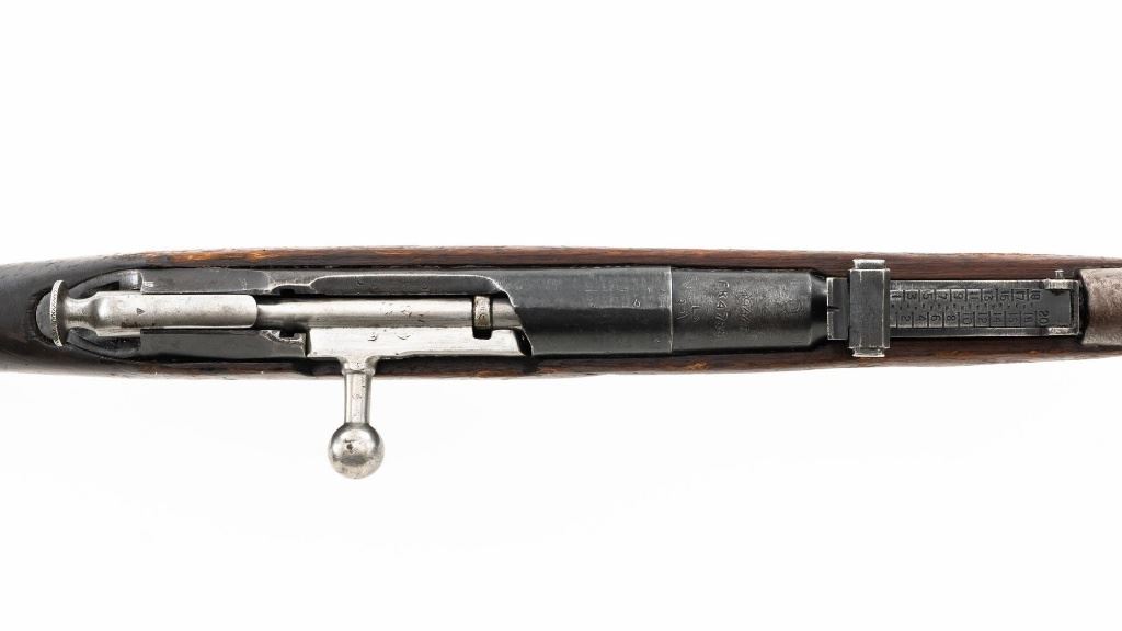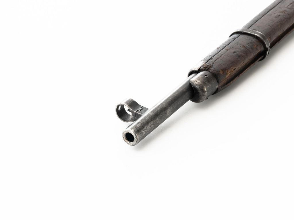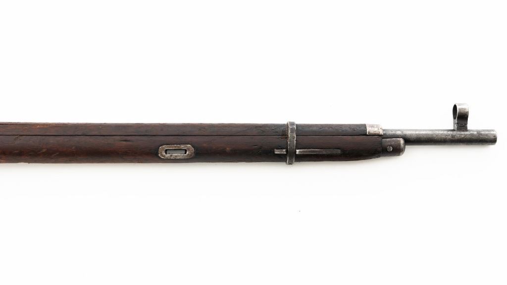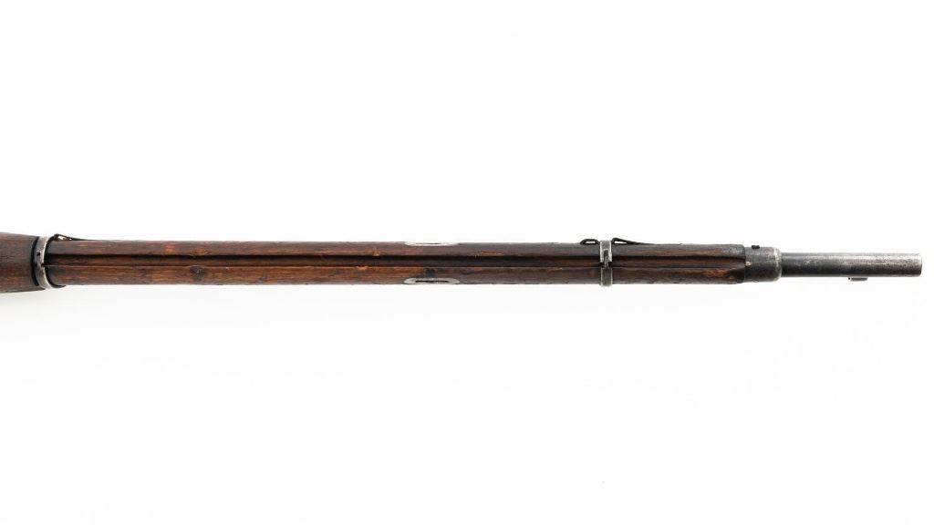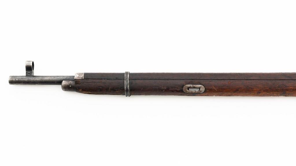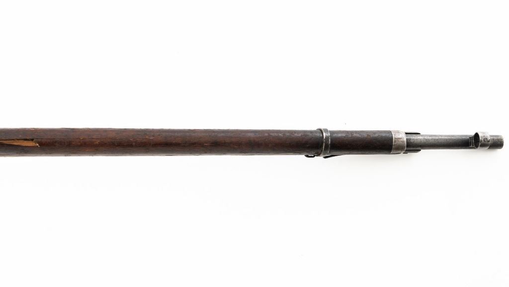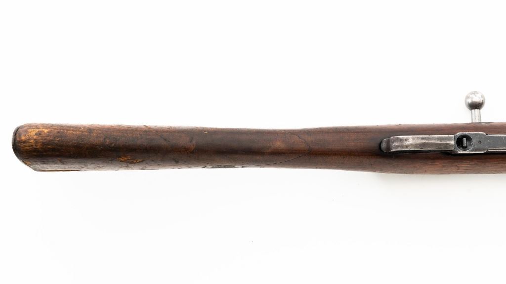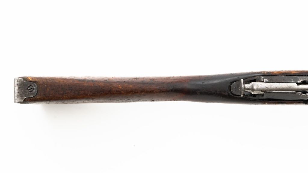 Soviet M91/30 Mosin Nagant Bolt Action Rifle, #GK4786, 7.62x54Rmm cal., 29" barrel, blued finish with bright bolt assembly, hardwood stock and handguard, hooded post front sight, and adjustable tangent rear sight with "U"-notched groove, graduated to 2000 meters. Steel cleaning rod is missing. Top of the barrel shank is marked with faint "(Soviet crest)" over "1944r/GK4786/(Izhevsk Arsenal symbol)". An old number has been barred out on the left side. Matching numbered buttplate, other numbered parts do not match. Import marked on right side of the barrel. Condition overall is about fair, retaining approx. 50%-60% blue, showing considerable age and wear. Bolt assembly is good with a few spots of patina. Wood is in poor condition with overall dents and scratches, with a few newer chips missing from the left side. Additionally, there is a crack through the stock wrist and a break to top of the handguard. Action operates smoothly. Bore is dark, pitted, and has fair worn rifling. Est.: $150-$300. (C&R)