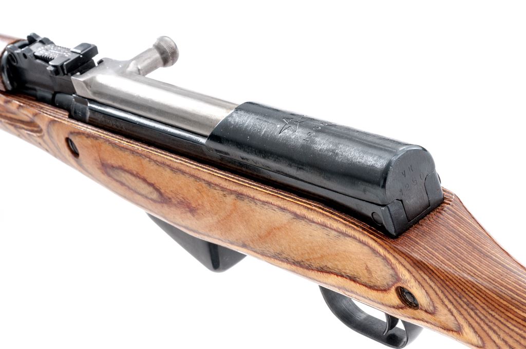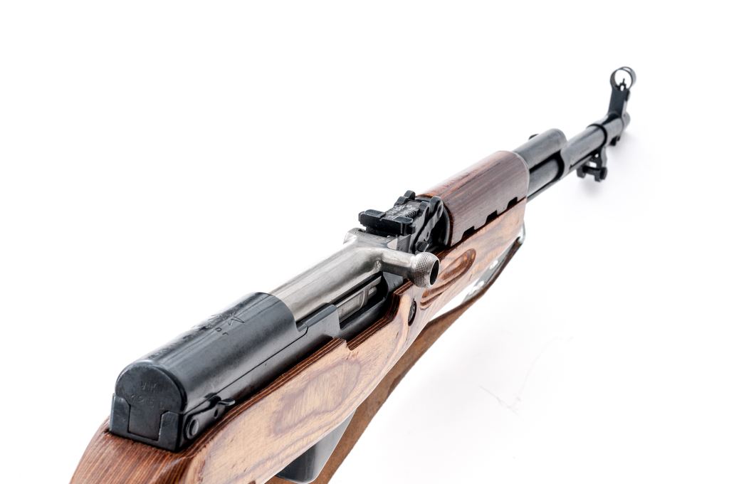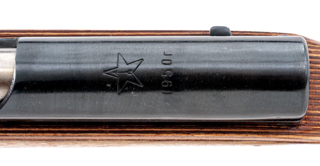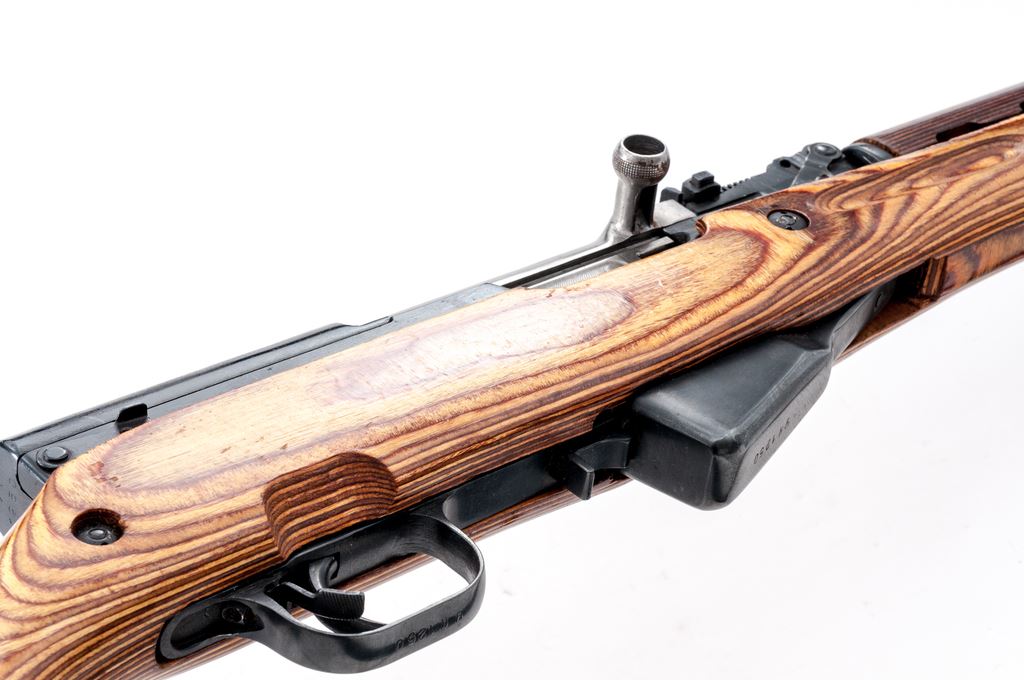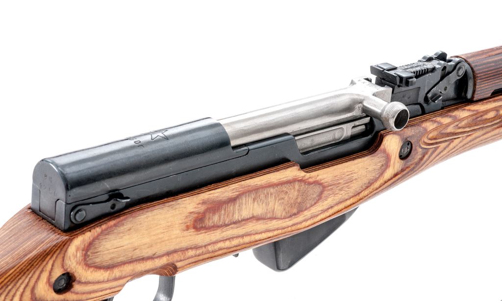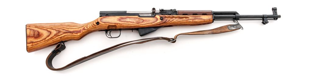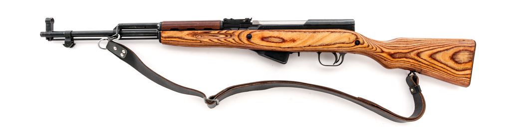 Soviet SKS Semi-Automatic Carbine, #YH1250, 7.62x39mm cal., 20.3'' barrel, blued finish, bight bolt, laminated stock, hooded post front sight and adjustable tangent rear sight, with cleaning rod, butt trap cleaning kit, and black leather sling. Marked on receiver cover with Tula Arsenal star symbol over ''1950r''. Matching numbers. Bayonet assembly is missing. Condition overall is very good with the metal retaining over 95% finish. Handguard retains its original finish. Stock has been sanded, a gloss varnish applied, and is in very good condition. Action is smooth, bright bore is excellent. Import stamped on right side of barrel. Est.: $600-$800. (C&R)