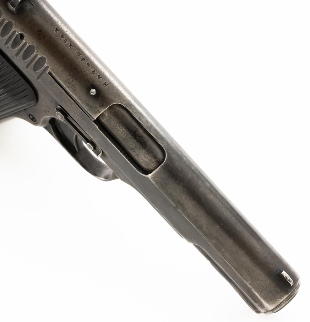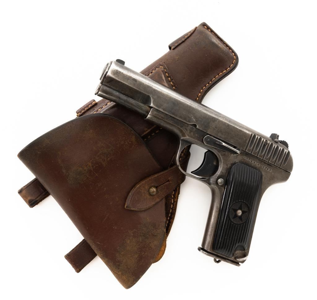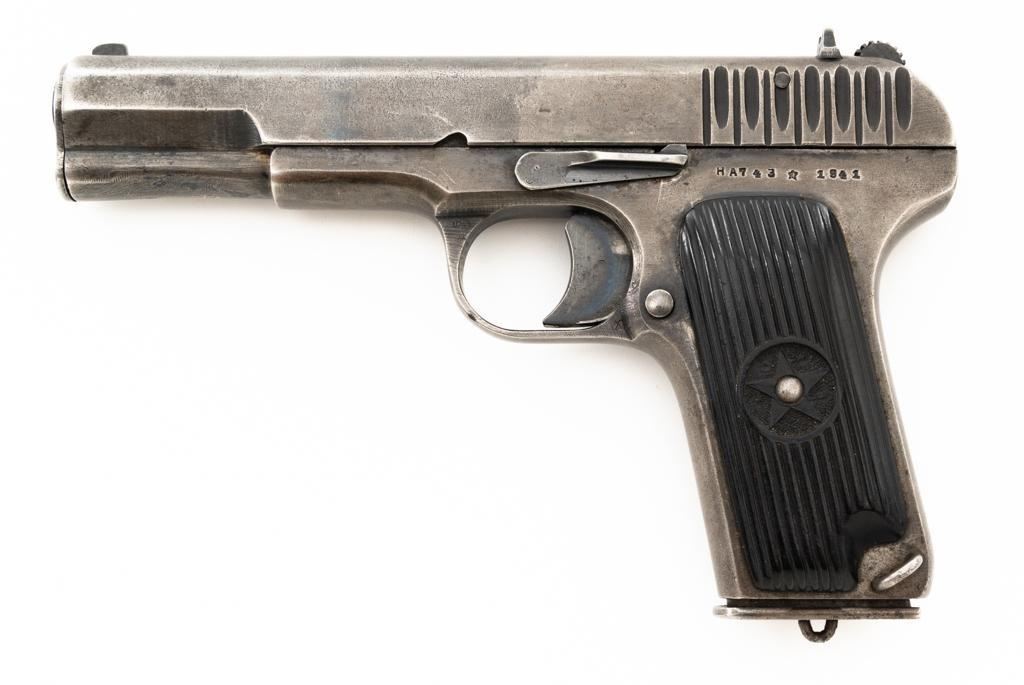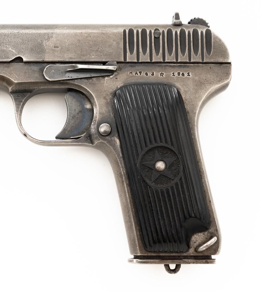 Soviet TT-33 Tokarev Semi-Automatic Pistol with Two (2) Magazines & Holster, #HA743, 7.62x25mm cal., 4.6" barrel, blued finish, grooved black plastic grips embossed with five pointed stars surrounded by "CCCP" on each side, blade front sight, fixed rear sight with "U"-notched groove, and lanyard loop. Magazine #1 has a gray phosphate finish and is stamped with a matching number "HA743", in fair condition showing with wear and patina. Magazine #2 has a blued finish and is stamped with a mismatched number "2689", in very good condition, with toning to the finish. Both magazines have lanyard loops on their base plates. Brown leather Soviet holster is unmarked under the flap. Condition is fair with cuts to the leather, showing general age and wear, all stitching and fittings are intact. Pistol is marked "HA743(five pointed star)1941" on left side of the frame and on top of the slide. No visible import marks. Condition overall is fair, retaining approx. 30% thinning and toning blue, now with a mottled appearance, showing general light pitting. There is a damaged area to the bottom right side of the slide, that has been repaired by welding and filing. Grips are good, showing wear and handling marks. Slide opens smoothly but returns slowly into battery, slide stop will not lock into place and hold open. Bore rates fair with darkening in the grooves, rifling is visible. Est.:$500-$700. (C&R)