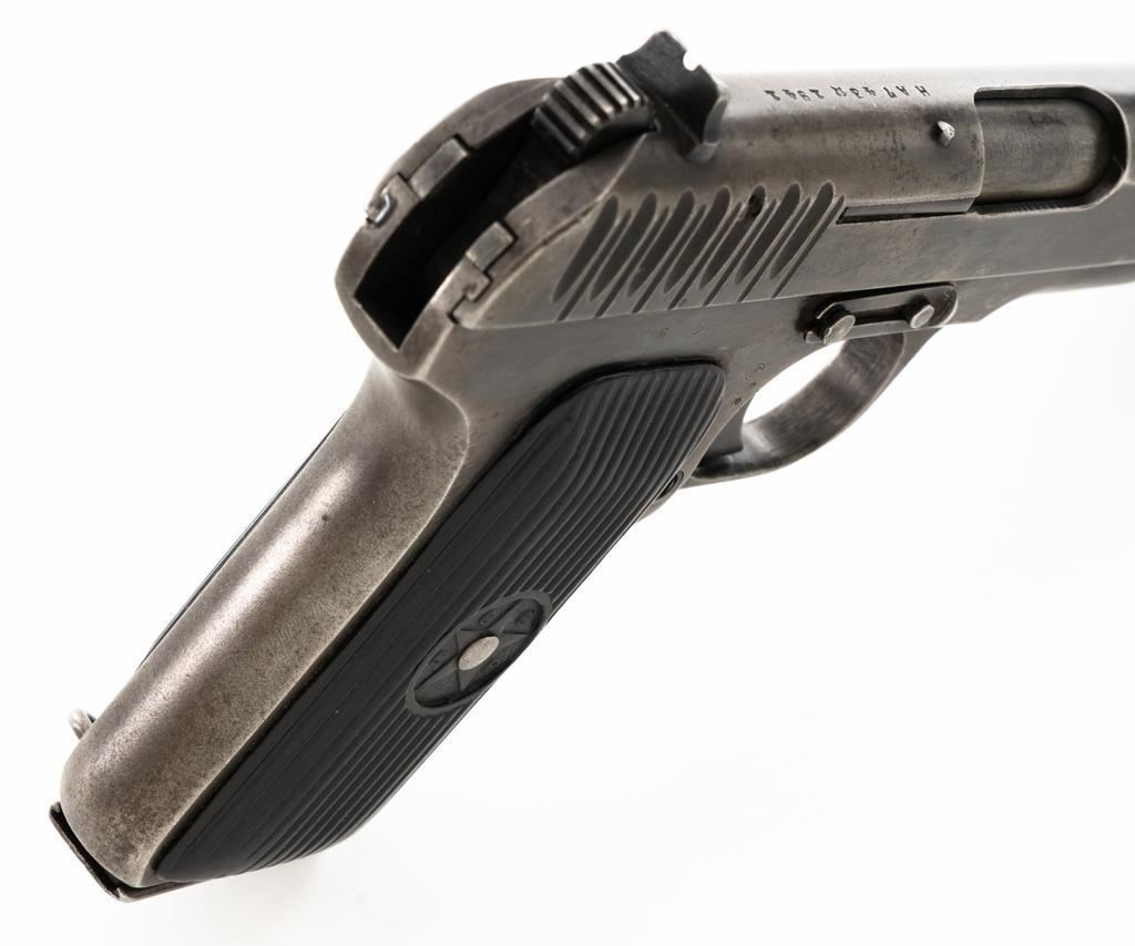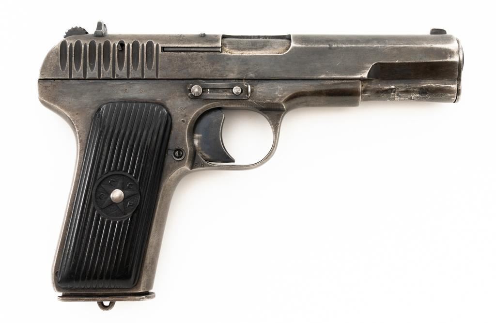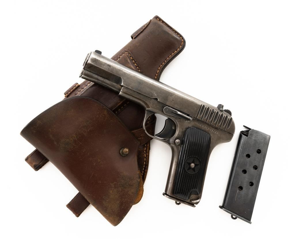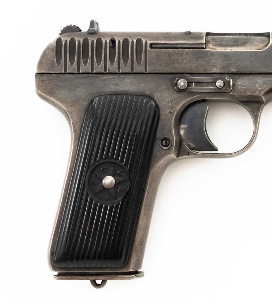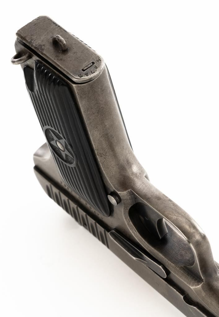 Soviet TT-33 Tokarev Semi-Automatic Pistol with Two (2) Magazines & Holster, #HA743, 7.62x25mm cal., 4.6" barrel, blued finish, grooved black plastic grips embossed with five pointed stars surrounded by "CCCP" on each side, blade front sight, fixed rear sight with "U"-notched groove, and lanyard loop. Magazine #1 has a gray phosphate finish and is stamped with a matching number "HA743", in fair condition showing with wear and patina. Magazine #2 has a blued finish and is stamped with a mismatched number "2689", in very good condition, with toning to the finish. Both magazines have lanyard loops on their base plates. Brown leather Soviet holster is unmarked under the flap. Condition is fair with cuts to the leather, showing general age and wear, all stitching and fittings are intact. Pistol is marked "HA743(five pointed star)1941" on left side of the frame and on top of the slide. No visible import marks. Condition overall is fair, retaining approx. 30% thinning and toning blue, now with a mottled appearance, showing general light pitting. There is a damaged area to the bottom right side of the slide, that has been repaired by welding and filing. Grips are good, showing wear and handling marks. Slide opens smoothly but returns slowly into battery, slide stop will not lock into place and hold open. Bore rates fair with darkening in the grooves, rifling is visible. Est.:$500-$700. (C&R)