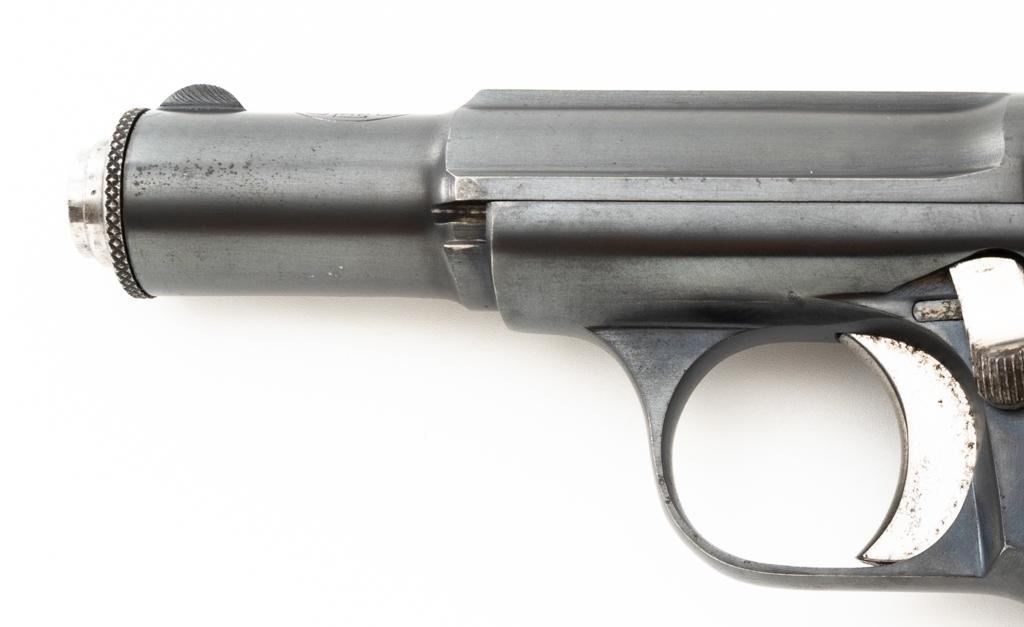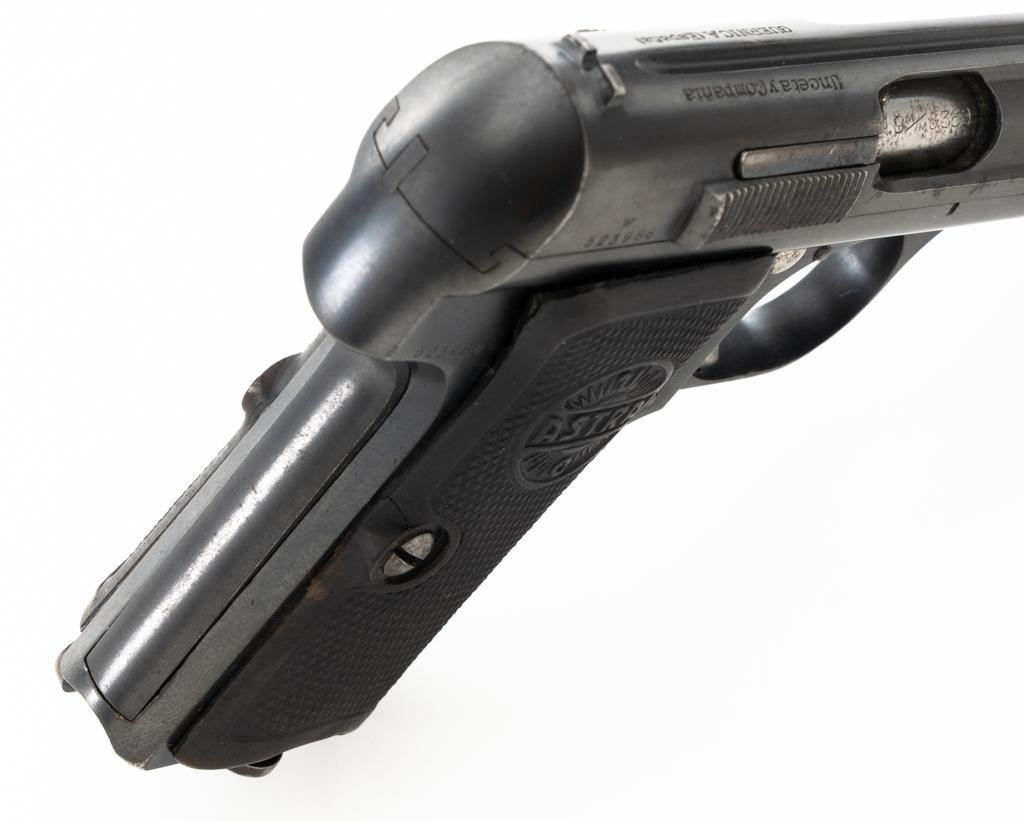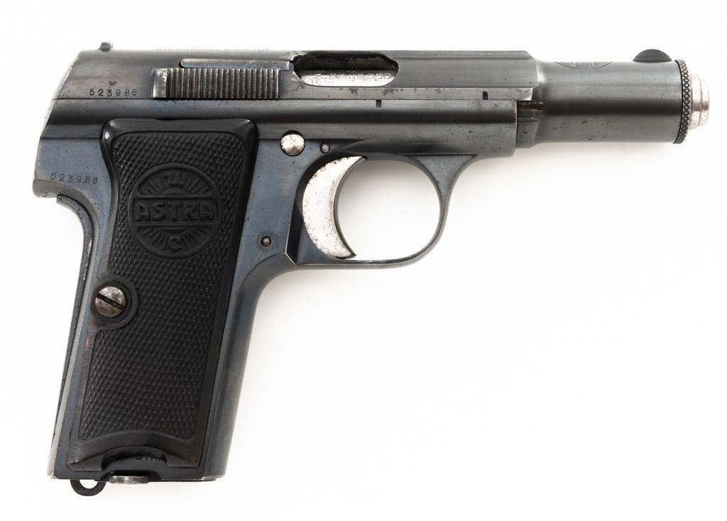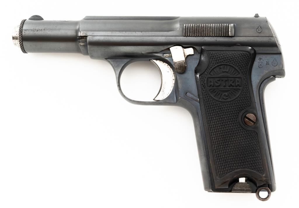 Spanish Astra 300 Semi-Automatic Pistol, #523986, .380 ACP cal., 3.9" barrel, blued finish with bright trigger and safety, checkered black plastic grips embossed with "ASTRA" logo on each side, blade front sight, and fixed rear sight with "U"-notched groove. Includes one blued steel magazine with "ASTRA" logo on the floorplate. Top of the slide is marked "Unceta y Compania" over "GUERNICA(Espana), with an "ASTRA" logo behind the front sight. There are Spanish proof and inspection stamps on the left side of the frame and slide. Barrel at the ejection port is stamped "9mm & 380". Matching numbers on frame and slide. No visible import marks. Condition overall is very good+, retaining approx. 93%-95% blue, showing areas of light frosting and intermittent scratches with spots of patina to right side of the slide. Left side grip is good with a repaired area at the bottom; right grip is fair, with a small crack at the bottom. Action operates smoothly Bore is bright with good rifling. Est.: $300-$500. (C&R/PPT)