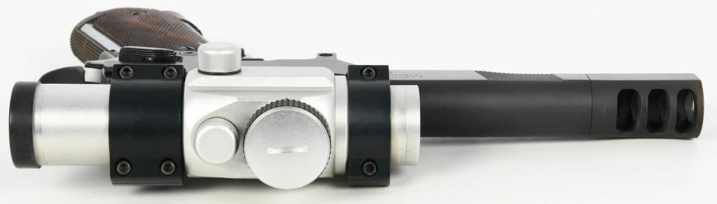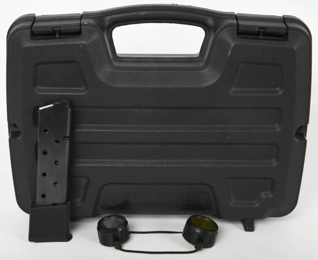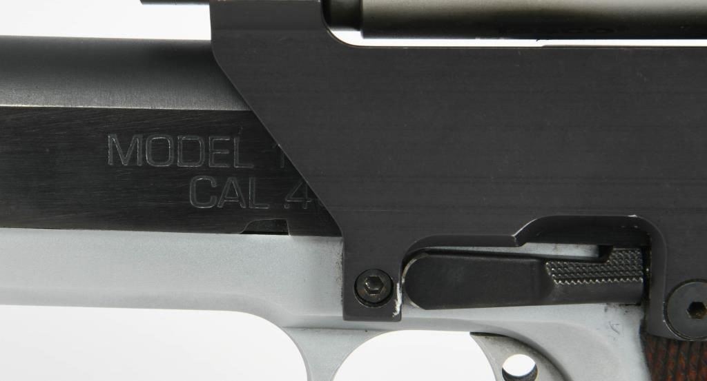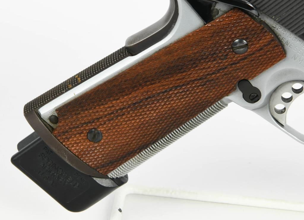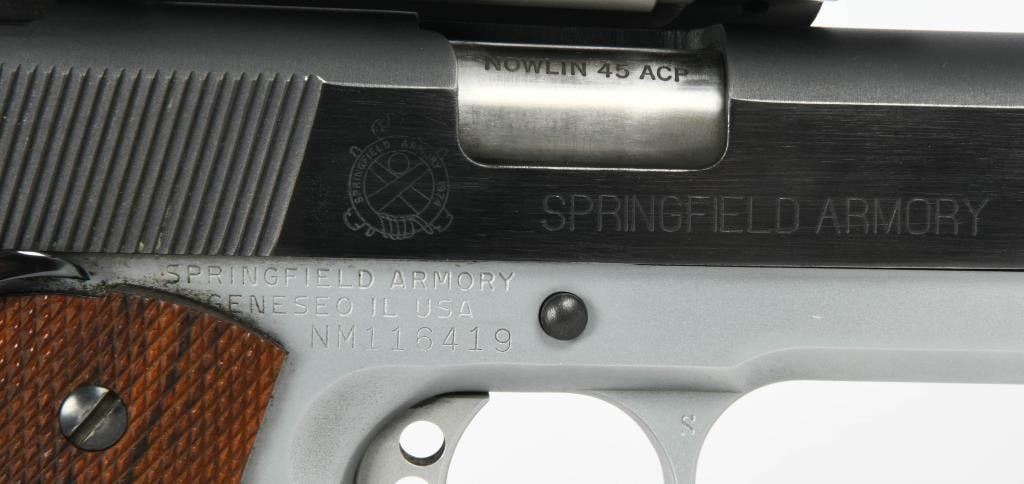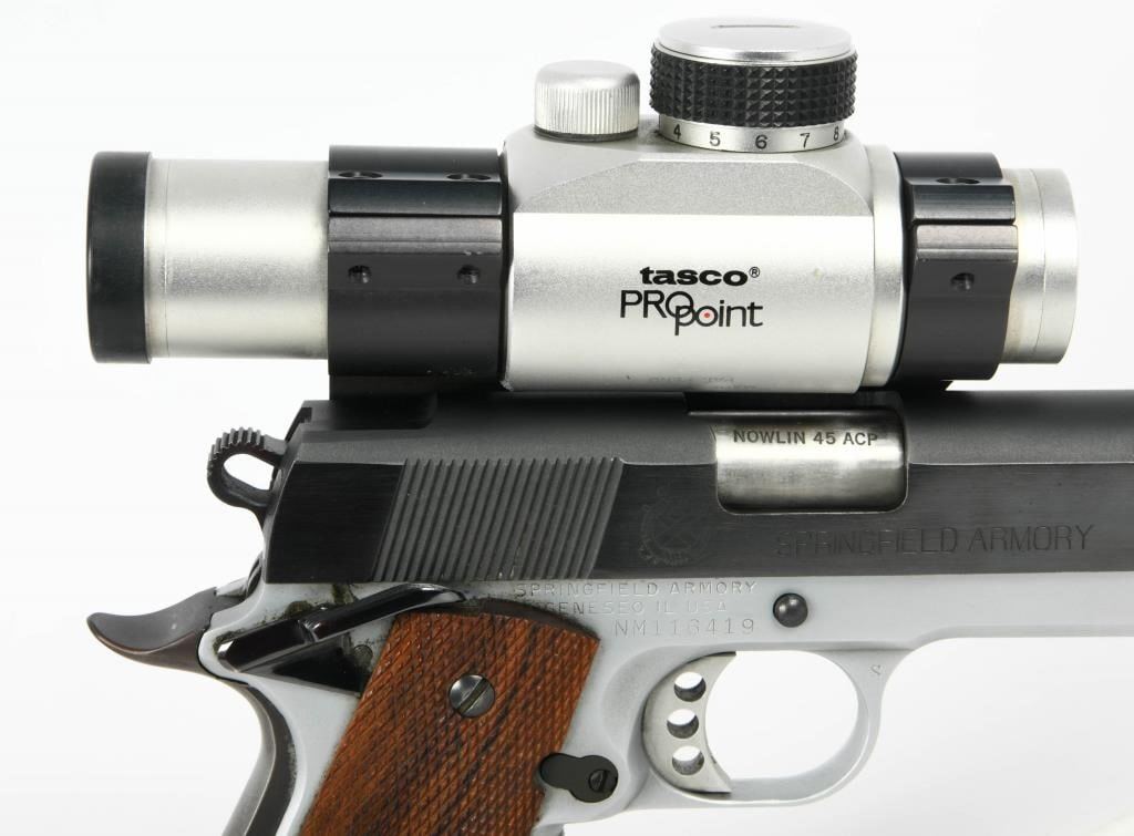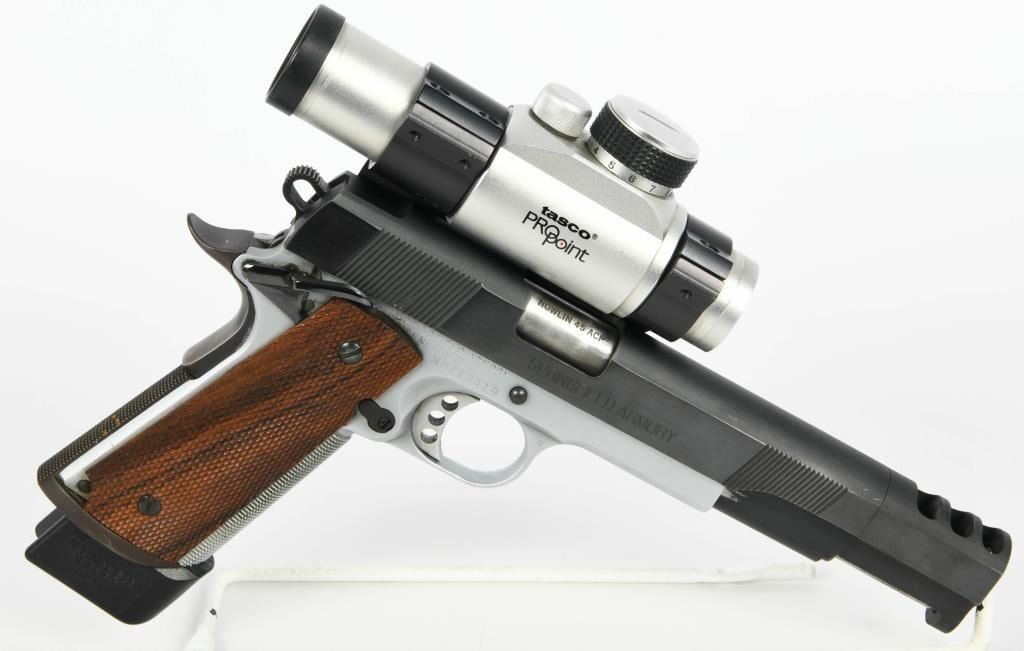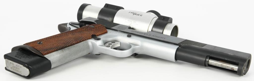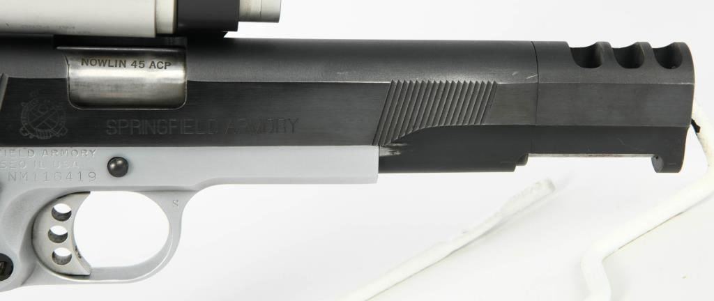 Competition Ready: Springfield Armory 1911 Semi Auto Competition Pistol in .45 ACP Step into the world of competitive shooting with the Springfield Armory 1911 Semi Auto Competition Pistol. Chambered in .45 ACP, this competition-ready firearm boasts features that enhance performance and precision. The inclusion of a Nolin barrel adds a level of precision to your shots, contributing to enhanced accuracy during competitions. The duo-tone finish not only adds a touch of style but also provides durability and resistance to the elements, ensuring the pistol remains in top condition. The compensator reduces muzzle rise, allowing for faster follow-up shots and improved control during rapid-fire sequences. The speed magwell facilitates quick and smooth magazine changes, a crucial element in competitive shooting where every second counts. The side scope mount enhances the pistol's versatility, allowing for the addition of optics to improve target acquisition and accuracy. Topped with a Tasco Pro Point, this pistol comes equipped with a reliable and quick target acquisition optic, further elevating its competition performance. The inclusion of one extended magazine ensures you have ample rounds for your competition stages, reducing the need for frequent reloads. The hard case adds convenience for storage and transportation, protecting your competition pistol between events. The Springfield Armory 1911 Semi Auto Competition Pistol is designed for those seeking top-tier performance in competitive shooting. Whether you're a seasoned competitor or entering the world of competitive shooting, this pistol invites you to experience the thrill of precision and speed on the competition stage.