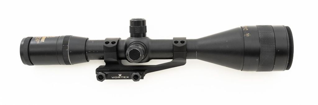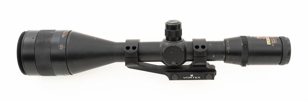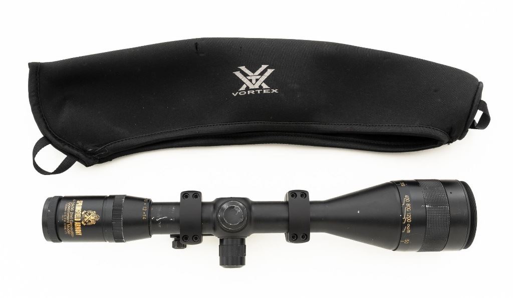 Springfield Armory 4-14x56mm 2ND Generation Government Model Rifle Scope, #25260, 30mm tube, blued finish, FFP, 7.62 BDC reticle. Scope is held in a Vortex cantilever style scope mount. Includes sunshade and neoprene cover. Exterior of the scope shows minor handling marks and light scratches consistent with use. Optics are bright and clear. 1/4" click adjustment for windage and elevation both turn freely. Est.: $400-$600.
