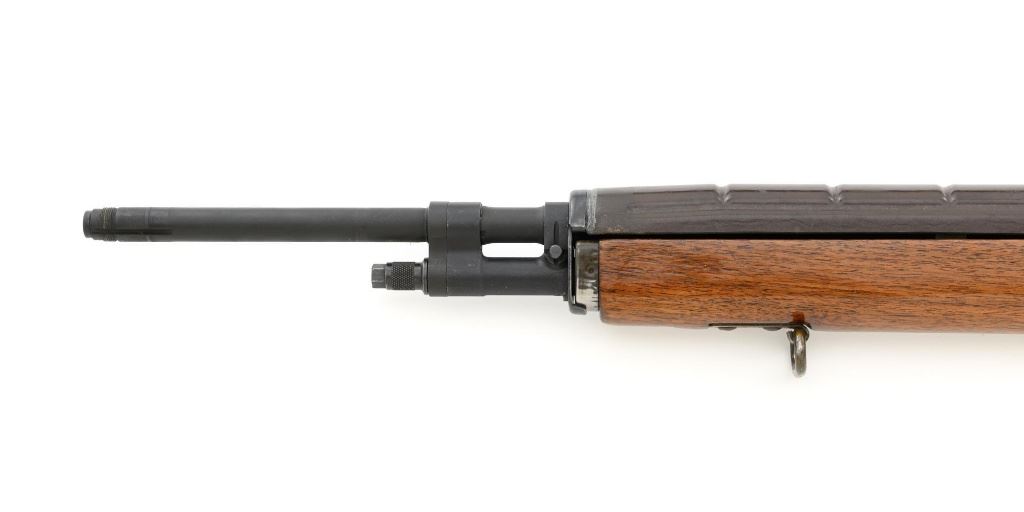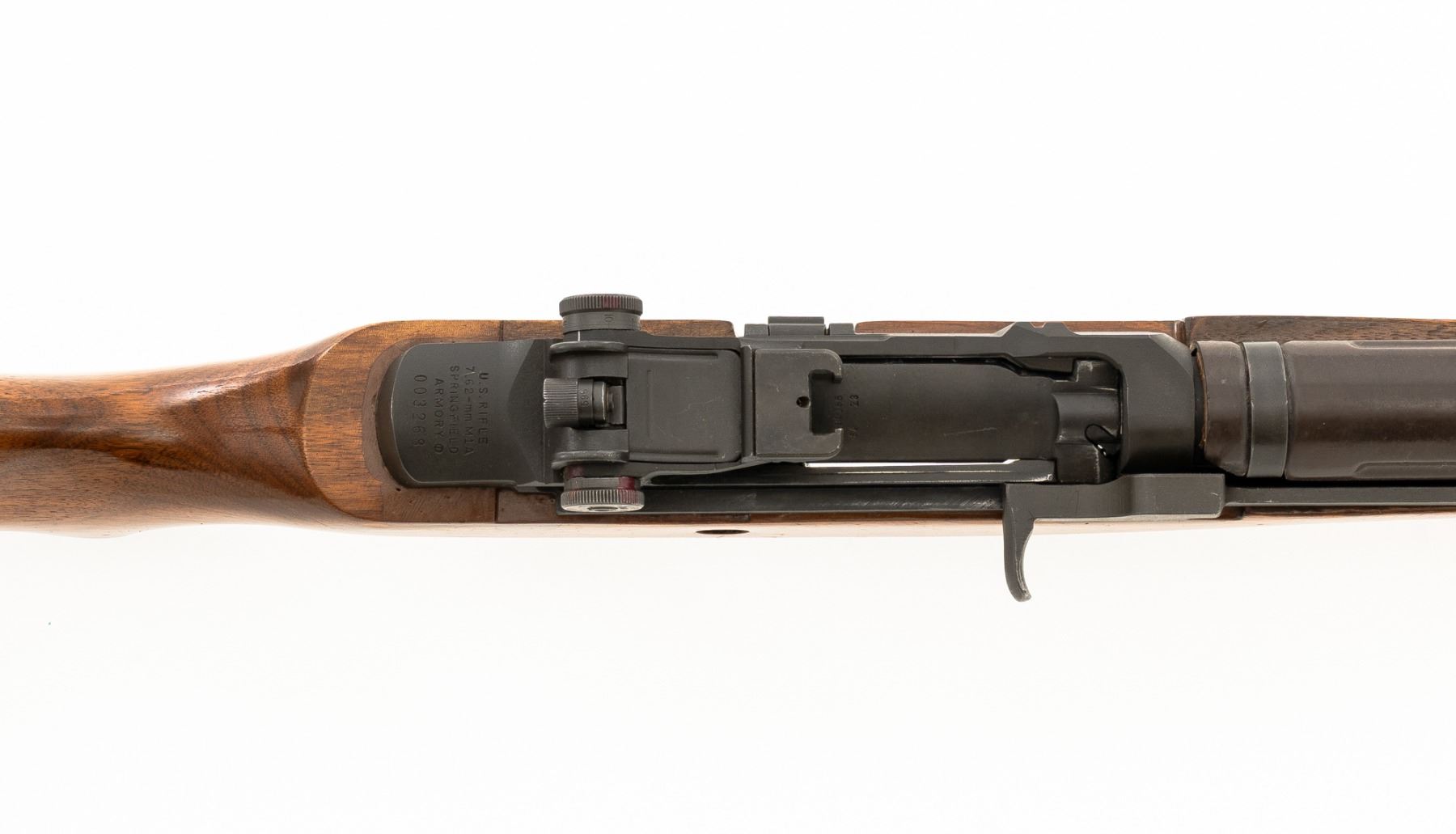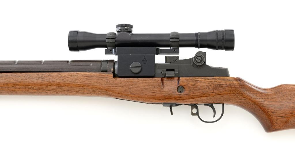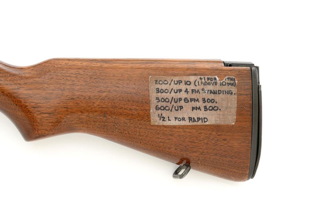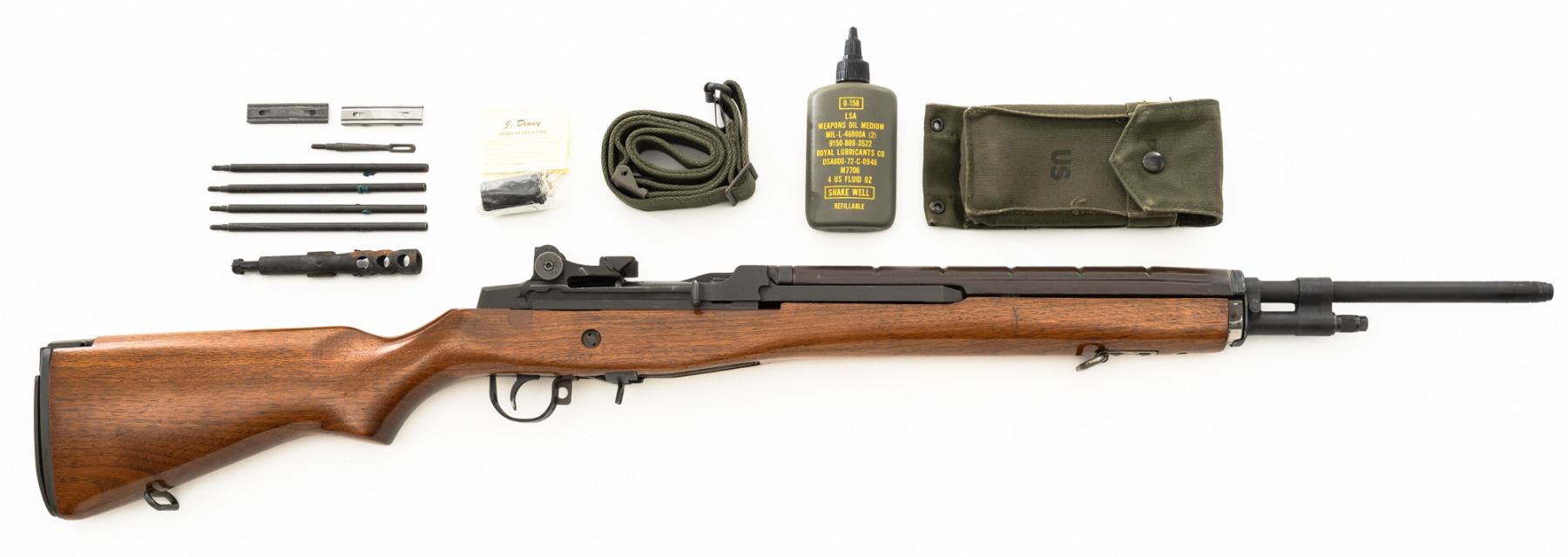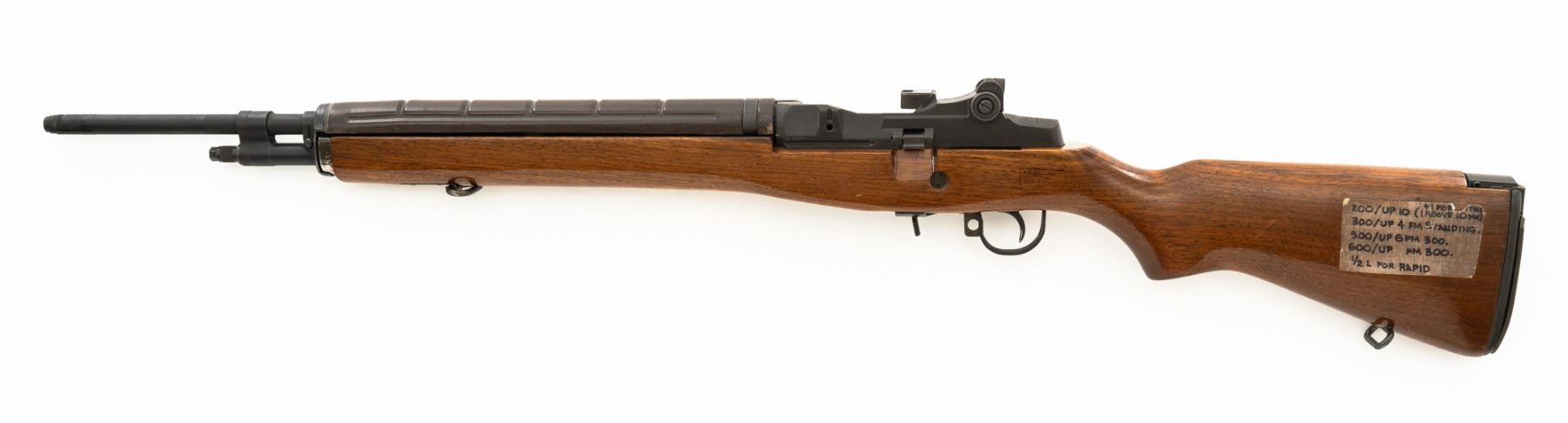 Springfield Armory M1A Semi-Automatic Rifle, #003268, 7.62x51mm cal, 22" threaded barrel without muzzle brake, parkerized finish, walnut stock with fiberglass handguard, no front sight, with hooded aperture rear sight, marked "NM", adjustable for windage and elevation. There is no magazine. Includes a U.S. M1 green cotton sling, U.S.M.C. single magazine pouch, bottle of LSA lubricant, combination tool, four-piece M-10 steel cleaning rod with tip, muzzle guide, rear sight cover, and two (2) stripper clips. Rifle is marked "U.S.RIFLE/7.62 mm M1A/SPRINGFIELD/ARMORY/003268" on rear receiver tang. Barrel is marked "SAK-7791362-11-73-8095943". Metal rates excellent and retains approx. 95% parkerized finish, with wear to the gas adjustment knob. Stock is very good, with an added coat of varnish, scattered moderate scratches and handling marks. There is a range scale attached to the left side buttstock. Handguard has a chip to the left rear. Action operates smoothly. Bore is bright with very good, clearly defined rifling. Est.: $1,000-$1,500. (Modern)
