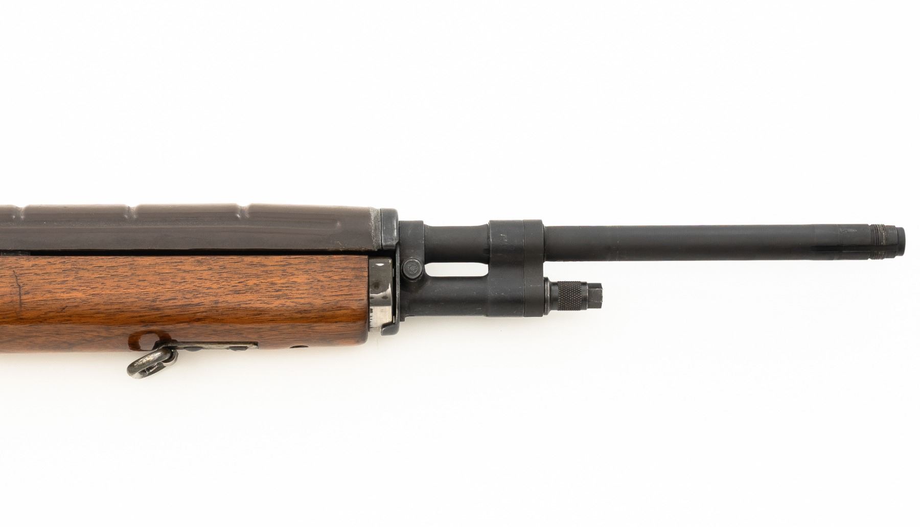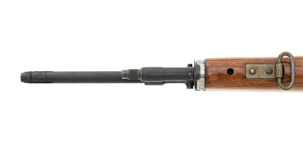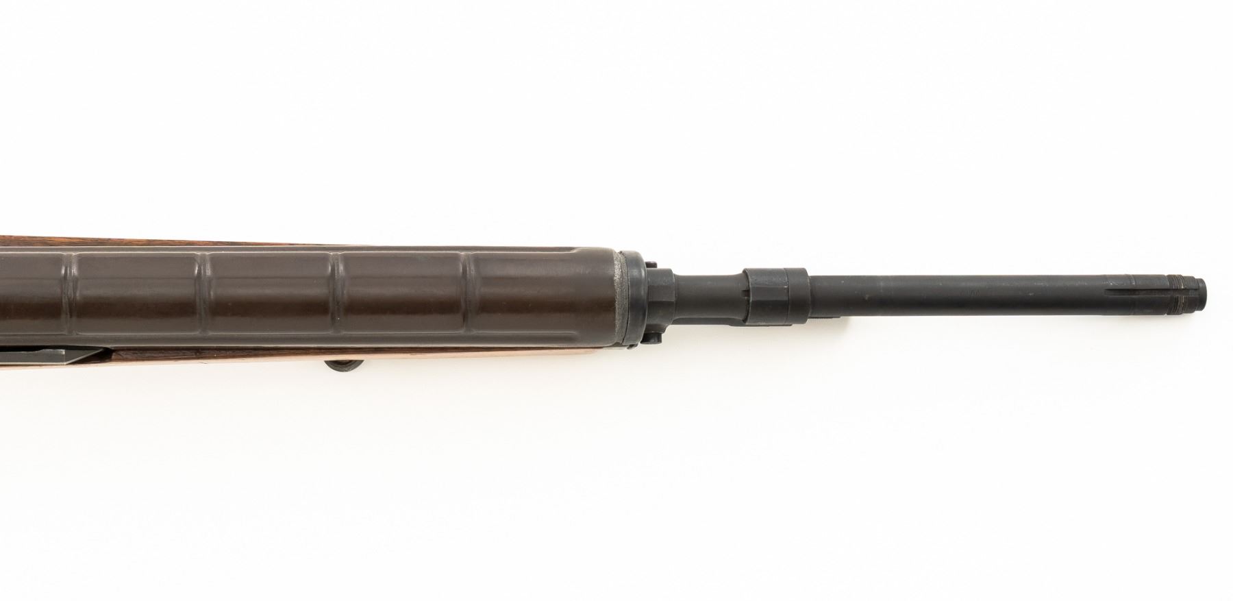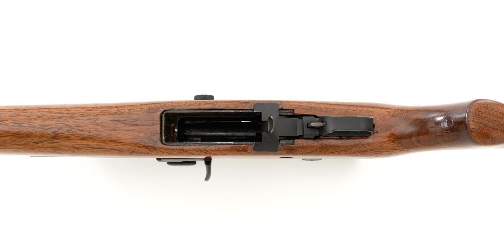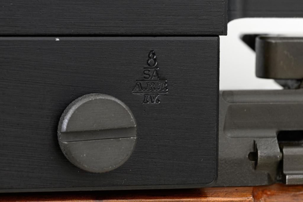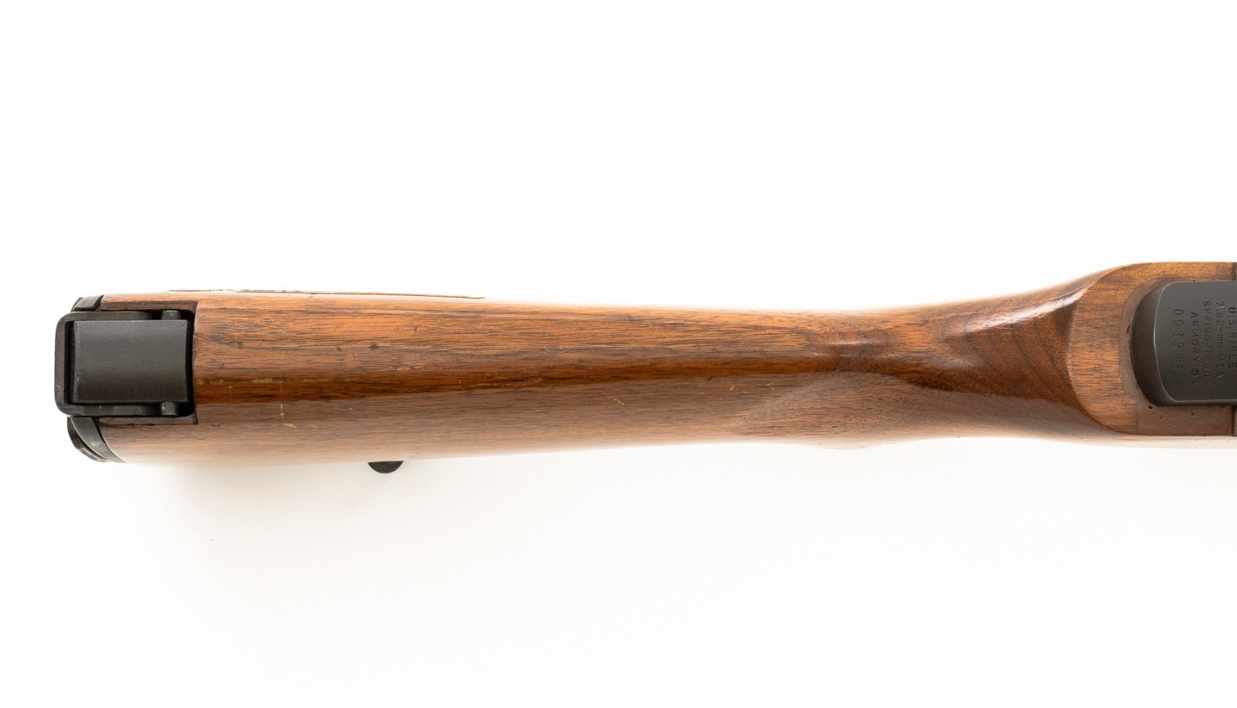 Springfield Armory M1A Semi-Automatic Rifle, #003268, 7.62x51mm cal, 22" threaded barrel without muzzle brake, parkerized finish, walnut stock with fiberglass handguard, no front sight, with hooded aperture rear sight, marked "NM", adjustable for windage and elevation. There is no magazine. Includes a U.S. M1 green cotton sling, U.S.M.C. single magazine pouch, bottle of LSA lubricant, combination tool, four-piece M-10 steel cleaning rod with tip, muzzle guide, rear sight cover, and two (2) stripper clips. Rifle is marked "U.S.RIFLE/7.62 mm M1A/SPRINGFIELD/ARMORY/003268" on rear receiver tang. Barrel is marked "SAK-7791362-11-73-8095943". Metal rates excellent and retains approx. 95% parkerized finish, with wear to the gas adjustment knob. Stock is very good, with an added coat of varnish, scattered moderate scratches and handling marks. There is a range scale attached to the left side buttstock. Handguard has a chip to the left rear. Action operates smoothly. Bore is bright with very good, clearly defined rifling. Est.: $1,000-$1,500. (Modern)