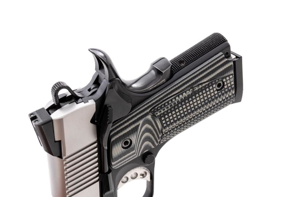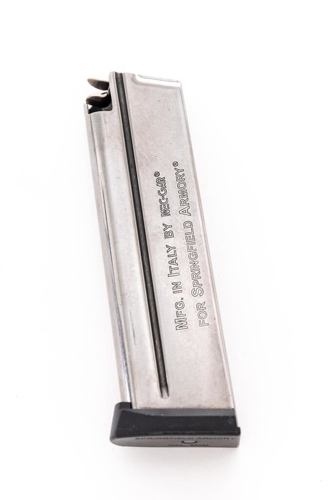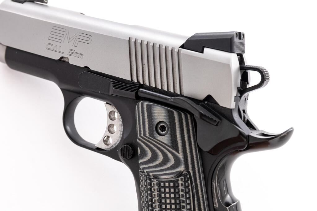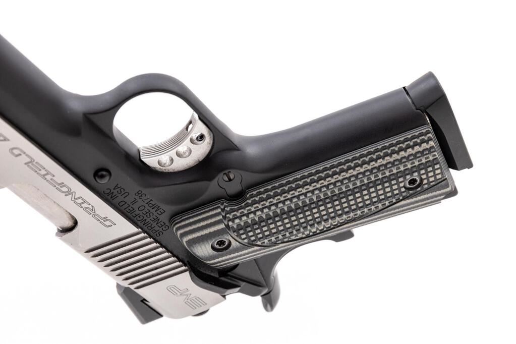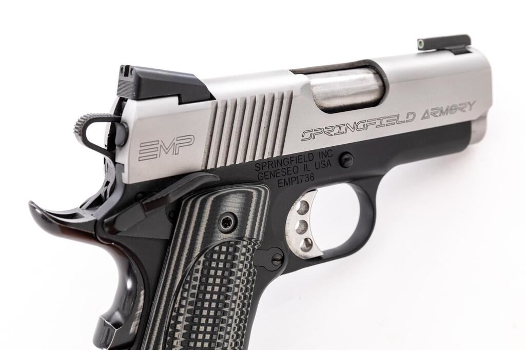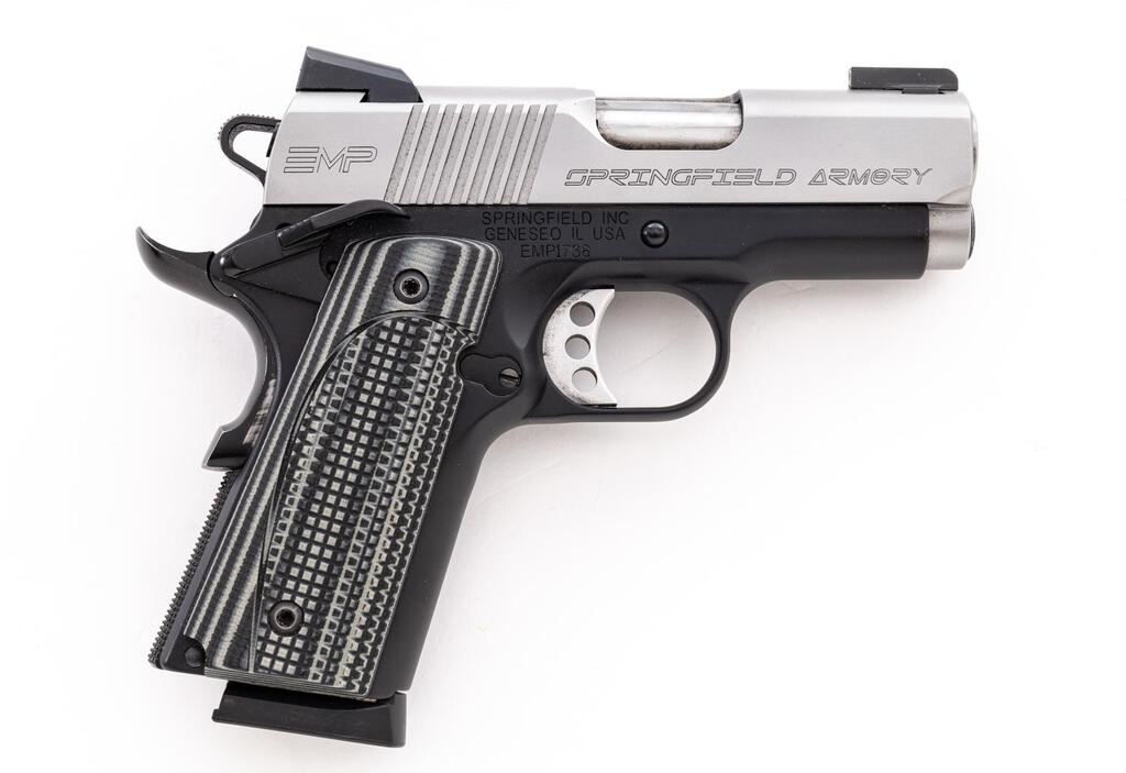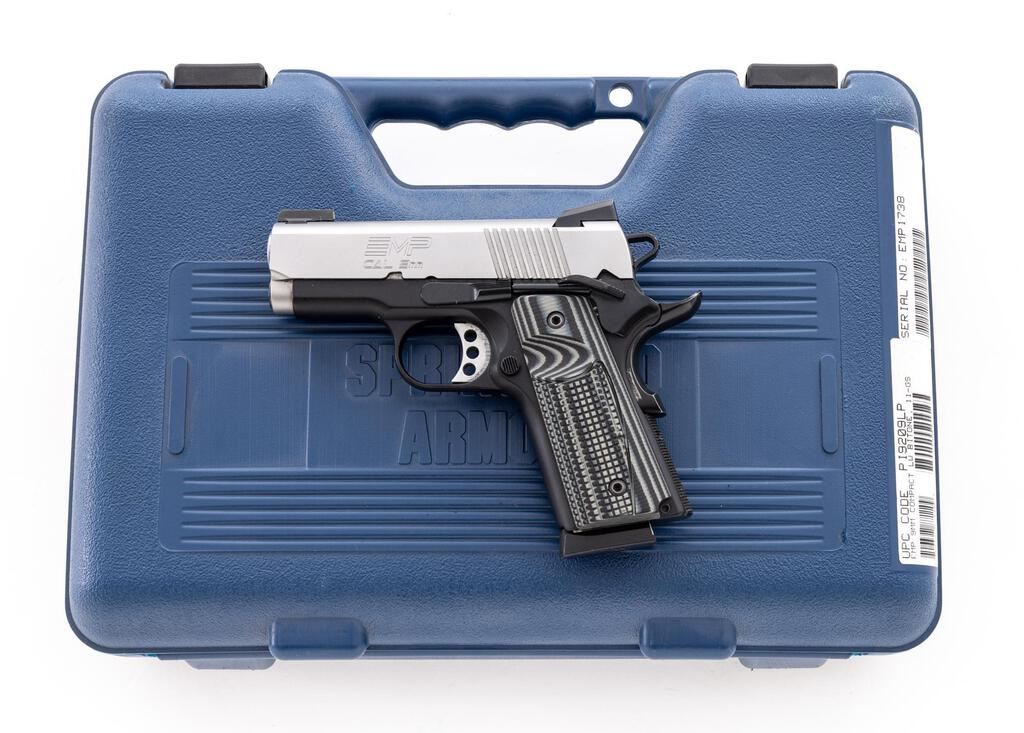 Springfield Armory Model 1911-A1 EMP Lightweight Semi-Automatic Pistol, #EMP1738, 9mm, 3" stainless bull barrel, black aluminum alloy frame, stainless slide, Stoner CNC black/grey G10 grips, 3-dot night sights, skeletonized hammer and trigger, ambidextrous thumb safety, and two (2) 9-rd. EMP magazines. In matching numbered blue plastic Springfield case with owner's manual and misc. factory paperwork. Includes one key for the internal locking safety mechanism. Condition is excellent retaining approx. 99% factory metal finish. Grips are like new. Excellent action and mirror bright bore. Est.: $800-$1,000. (Modern/PPT)