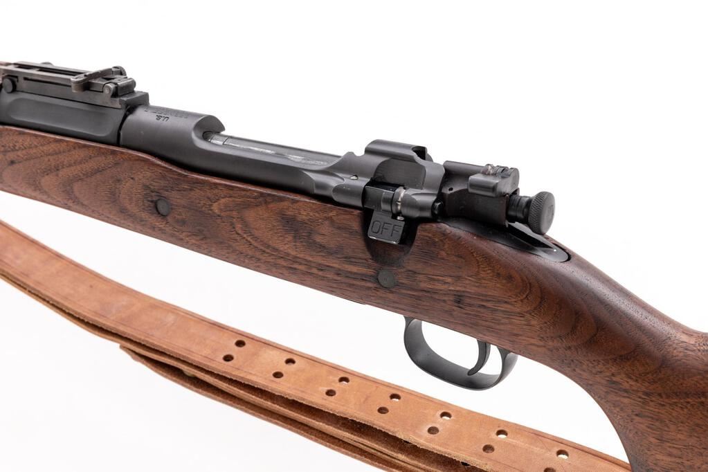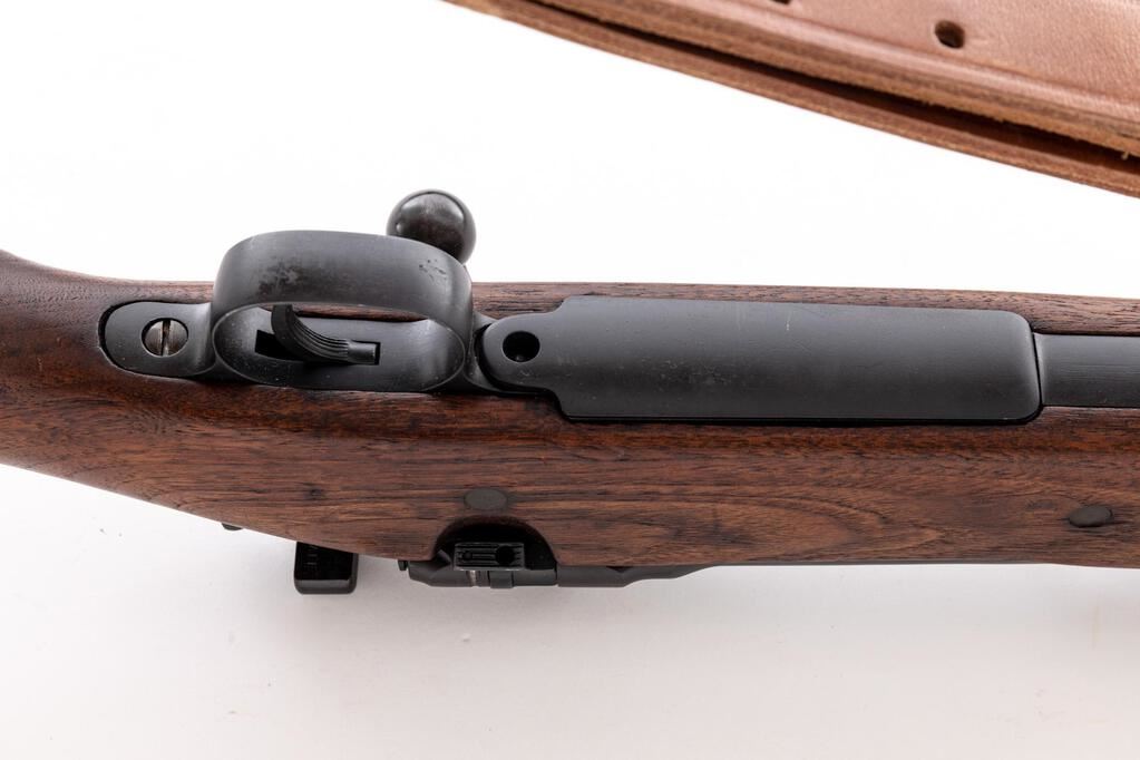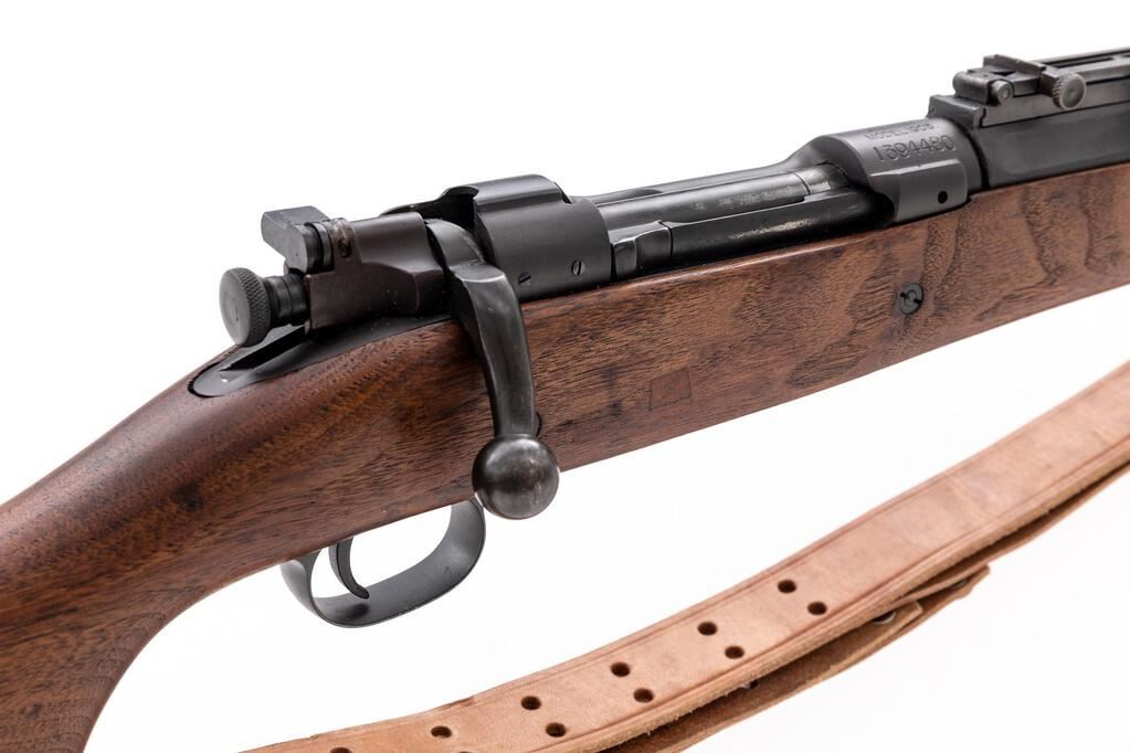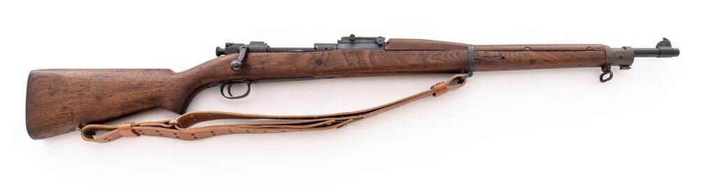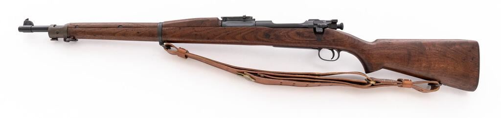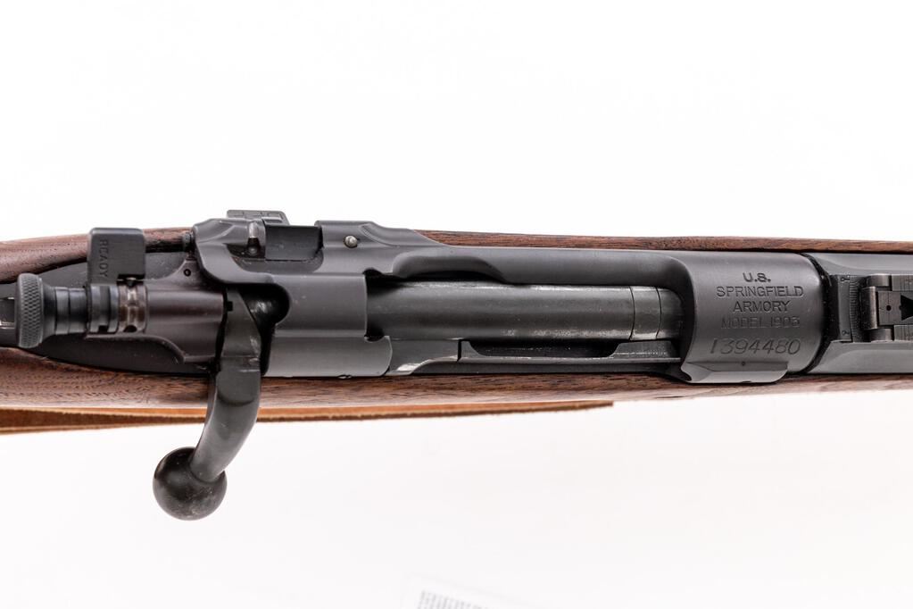Springfield Model 1903-A1 Bolt Action Rifle, #1394480, .30-06 cal., 24" barrel, parkerized finish, walnut stock set, blade front sight and adjustable folding leaf rear sight with "U" notch. Marked on top of receiver ring "U.S.SPRINGFIELD ARMORY MODEL 1903.". Barrel behind the front sight is marked "SA(flaming bomb)12-30".There are no visible markings on the stock. An excellent condition reproduction U.S. M1907 leather sling is attached. Rifle has been refinished and the condition overall is very good, with the metal retaining over 95% of the dark re-parkerization, showing light wear to the bolt and extractor. Stock has two small spliced repairs. Wood has been sanded and oiled, now very good, with a few very light handling marks. Action operates smoothly, bright bore is very good with very good rifling. Est.: $900-$1,100. (C&R)
