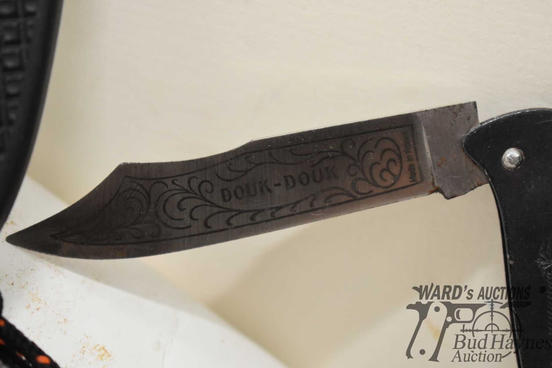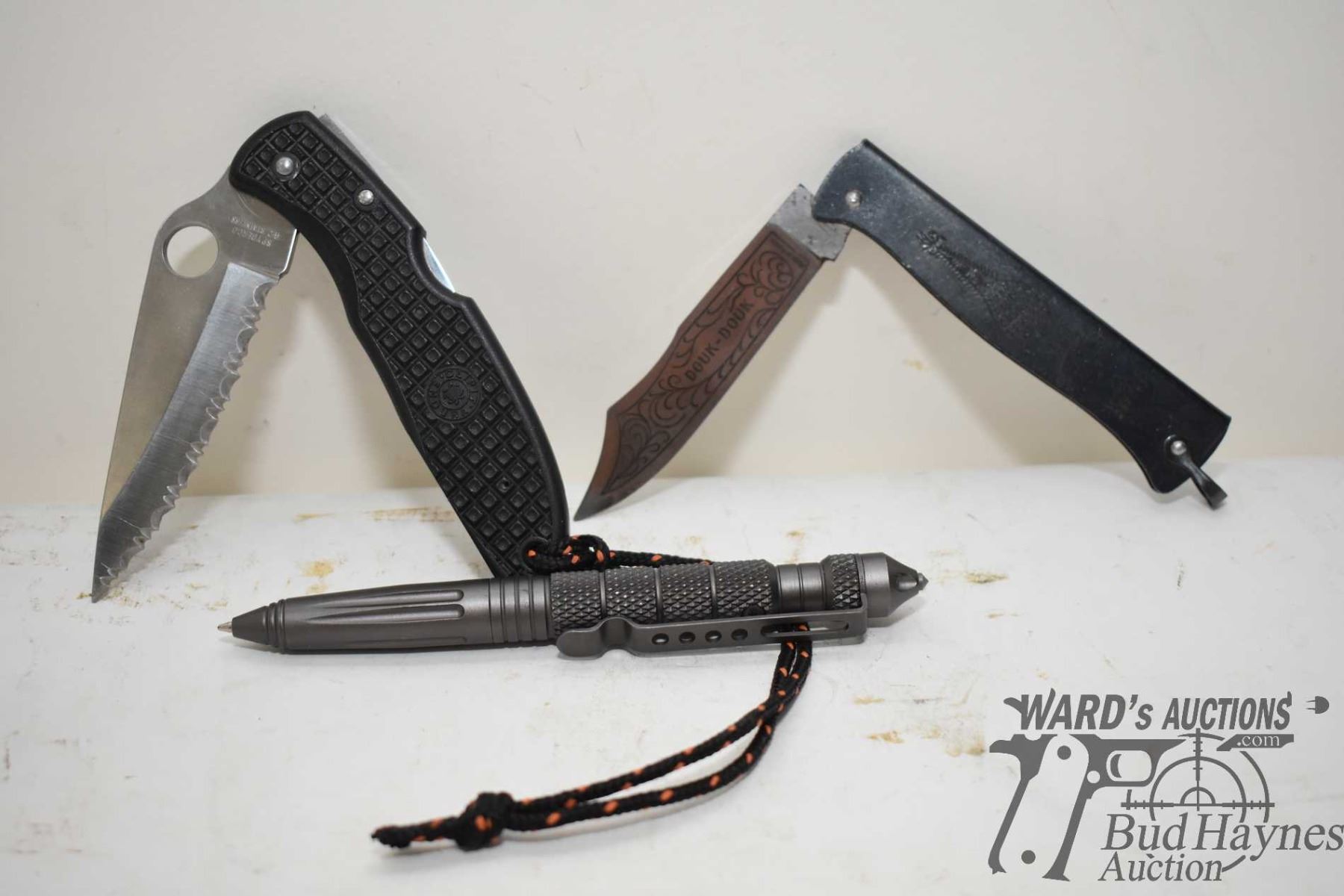 Spyderco G2 folding knife, Douk-Douk 3 1/2" folding knife and a V21 style defence pen