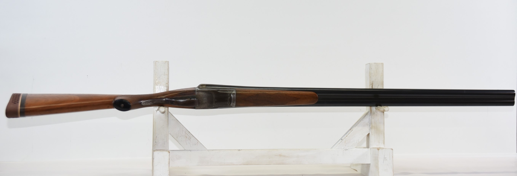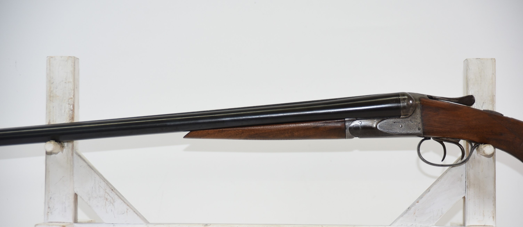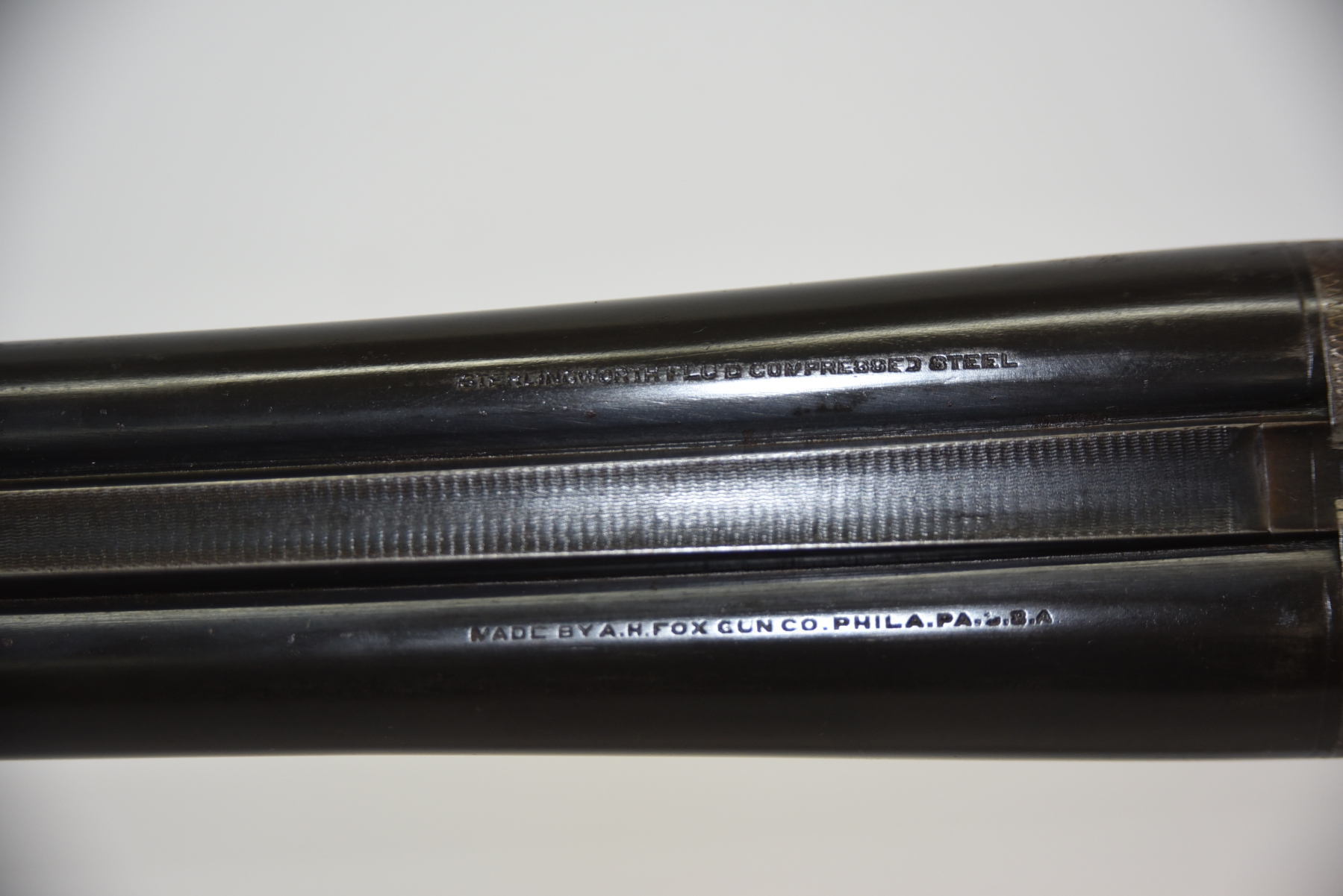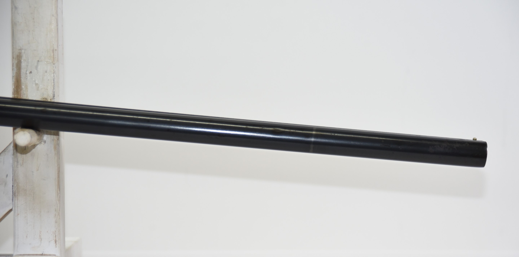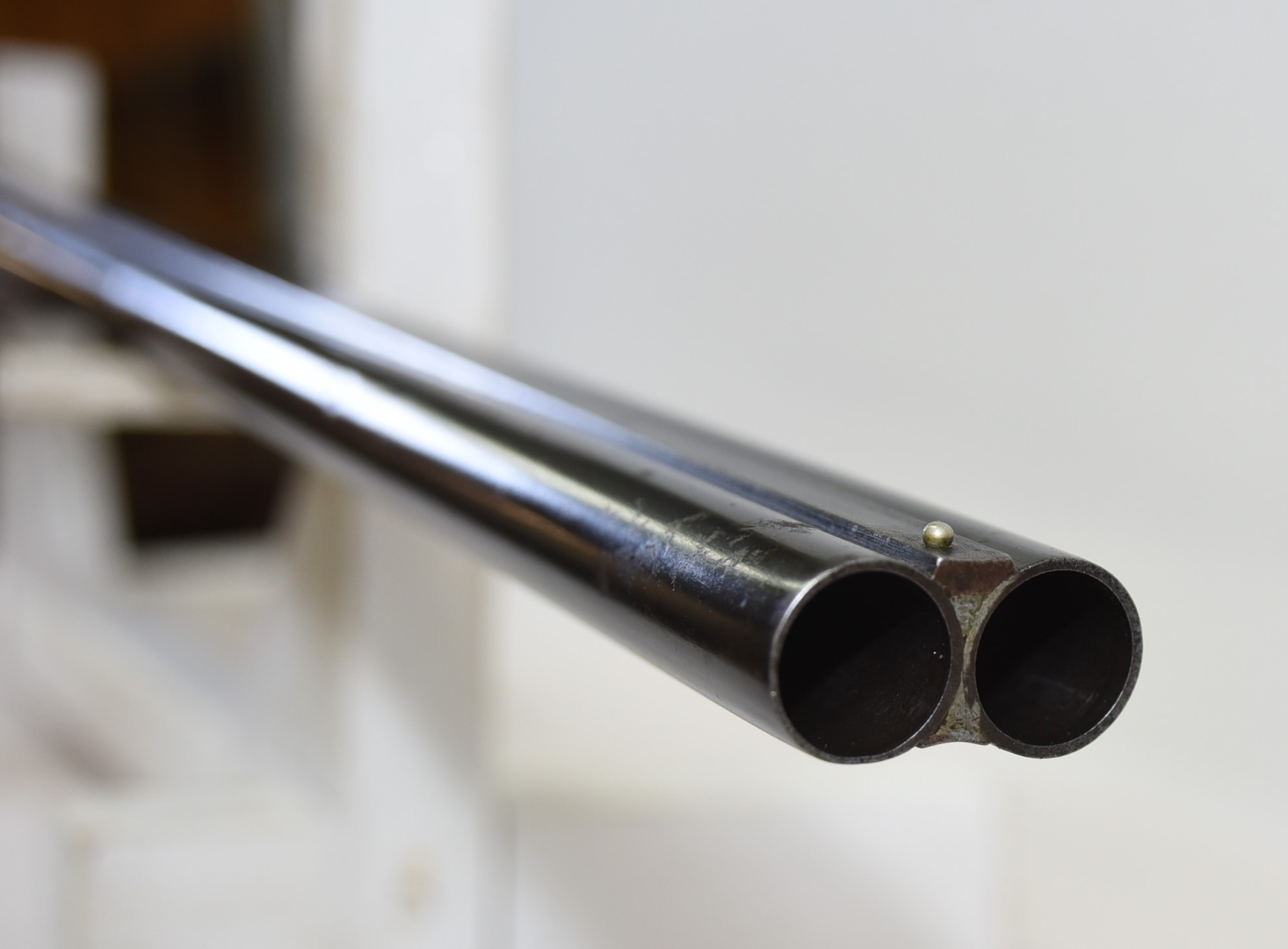 Metal finish shows some rust spots, some scratches, and finish wear specks, right barrel has few small dents about 6" from muzzle; condition is fair.