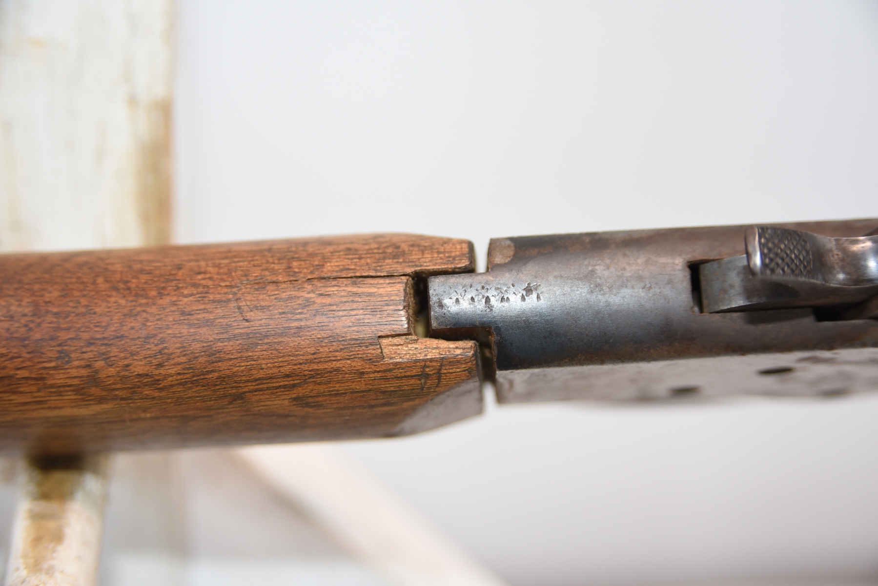 Wood stock shows scratches, scuffs, dents, loose fitting on receiver, a crack on the bottom of grip area; condition is fair.