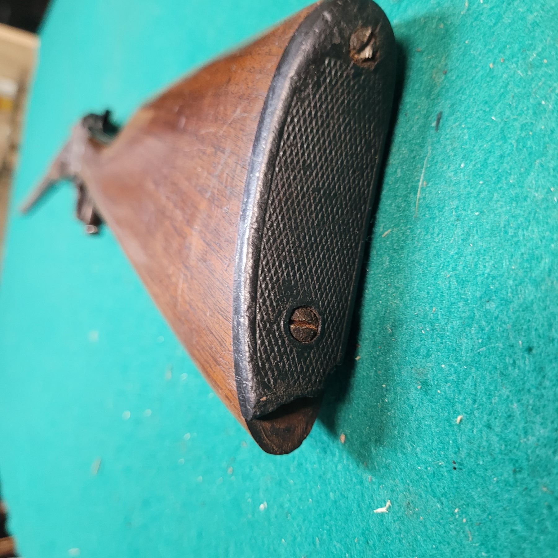 Stock is in good condition with NO cracks. Minor marks & scratches on the stock. Buttplate is chipped at the heel.