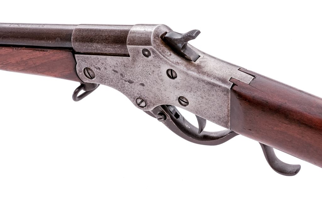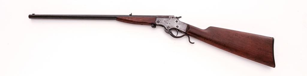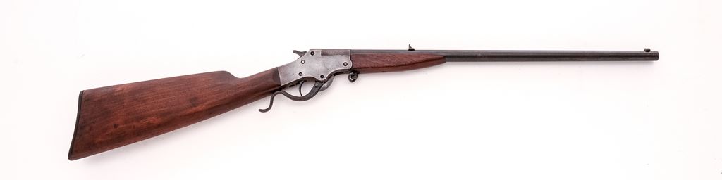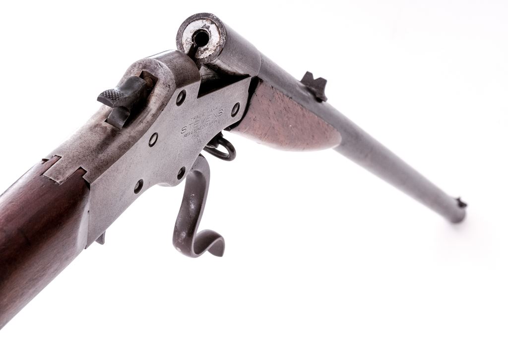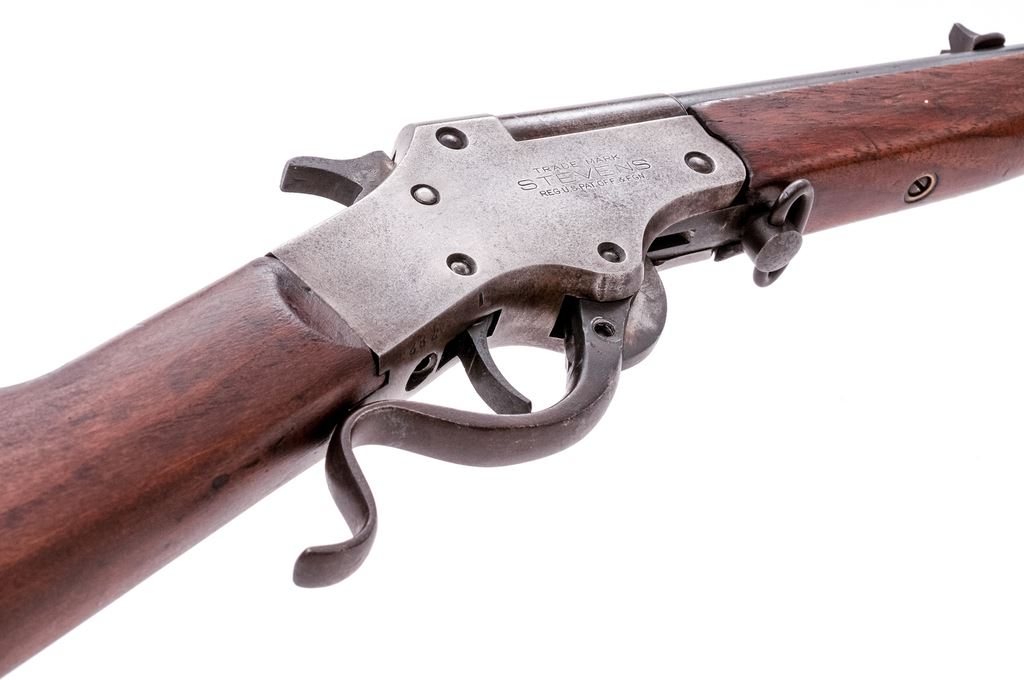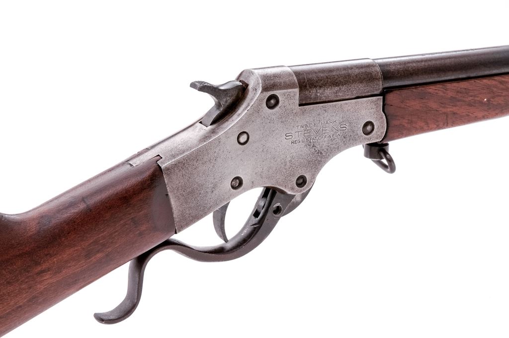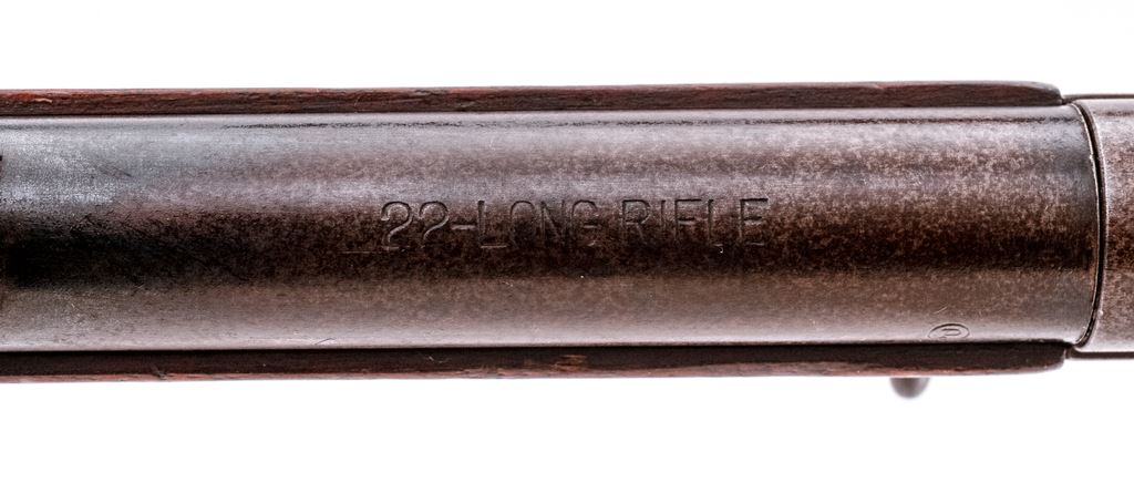 Stevens No. 12 Marksman Single Shot Top-Break Boy's Rifle, #782, .22 LR RF cal., 21" round barrel, fixed open sights, and marked with the caliber and a circled "P" proof at breech; receiver is marked with the maker's name and address, "Marksman" and circled "I" proof at left, "Stevens", trade mark and U.S. pat. off. data at right, has serpentine lever below that opens breech for loading/auto extraction; oil-finished walnut forearm has lanyard-loop at rear, matching buttstock with checkered hard rubber buttplate. Mfg'd. ca. 1911-30. Condition is fine retaining approx. 75% barrel blue, the balance being clean gunmetal gray-brown with sharp edges and markings. Stocks are sound and smooth, buttstock appears to have been sanded. Action is crisp, bore is bright with fine rifling. Est.: $300-$400. (C&R)