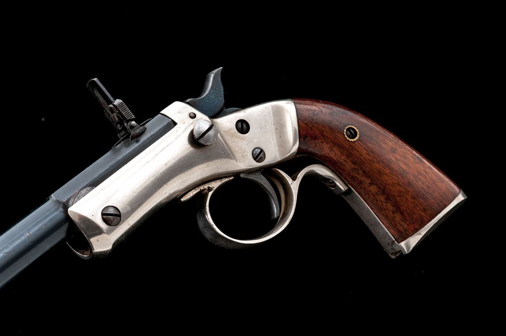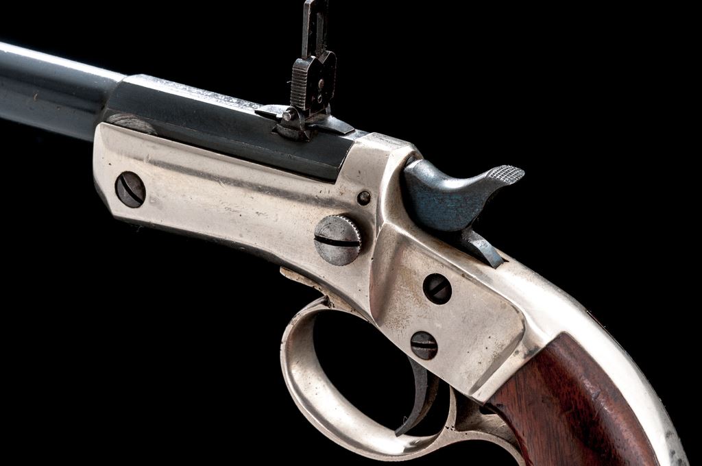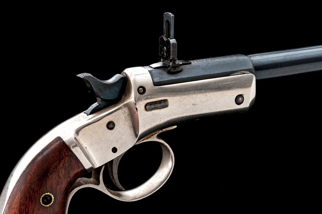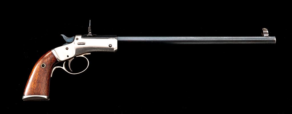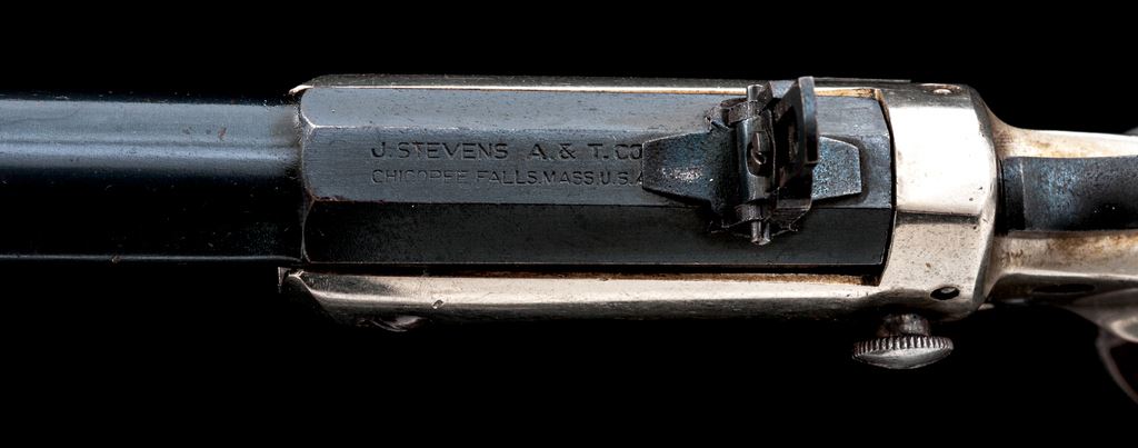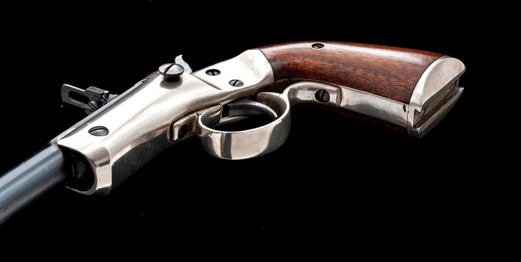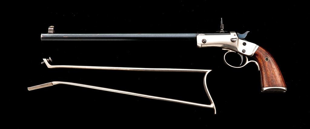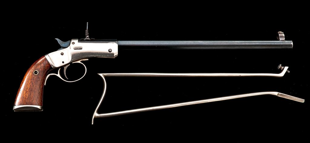 Stevens No. 40 New Model Single Shot Pocket Rifle, with Matching No. Detachable Skeleton Stock, #49331, .22 RF cal., 12'' round-to-octagonal barrel with dovetailed Beaches pin/blade front and sliding-leaf rear sights, marked ''J. Stevens A. & T. Co.'' and address on top flat; iron frame has front hinge, left-side knurled barrel release button, firing pin without bushing, central hammer, loop trigger guard, and integral gripstraps, two-piece varnished walnut grips and separate skeleton shoulder stock. Mfg'd ca. 1896-1916, with blued barrel, nickel-plated frame, straps and stock. Condition is near excellent retaining approx. 96% barrel blue (very light muzzle wear, small nick below), much fire blue to hammer/trigger, and 98% bright nickel incl. stock. Grips are sound and smooth with 90% original finish. Edges and markings are sharp; action is crisp; bore shows light etching and fine rifling. Est.: $600-$900. (C&R/PPT)