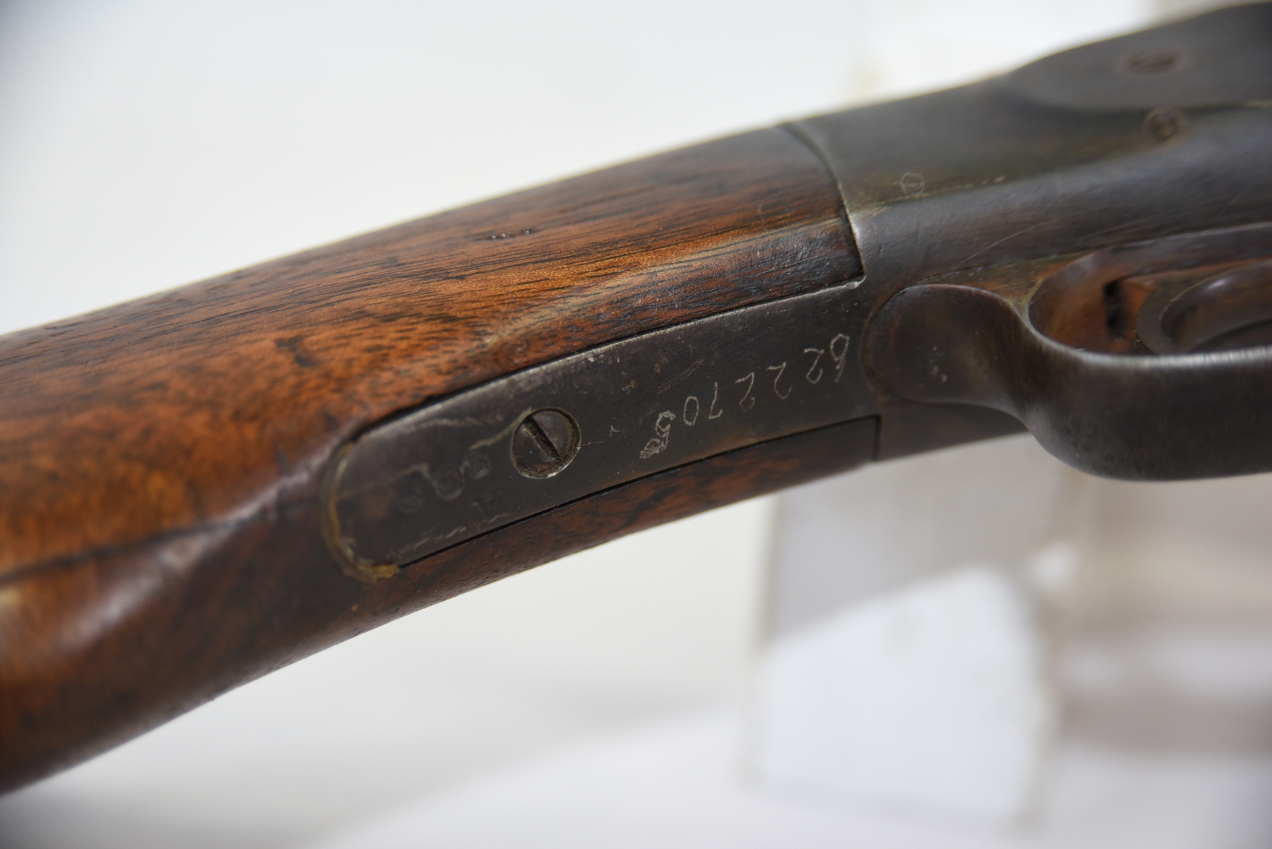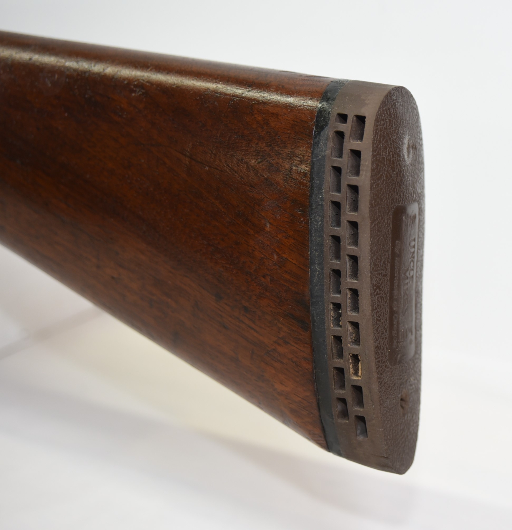 Wood stock shows scratches, scuffs, dents, chip in the rear stock, cracks in the grip area; condition is less than fair.