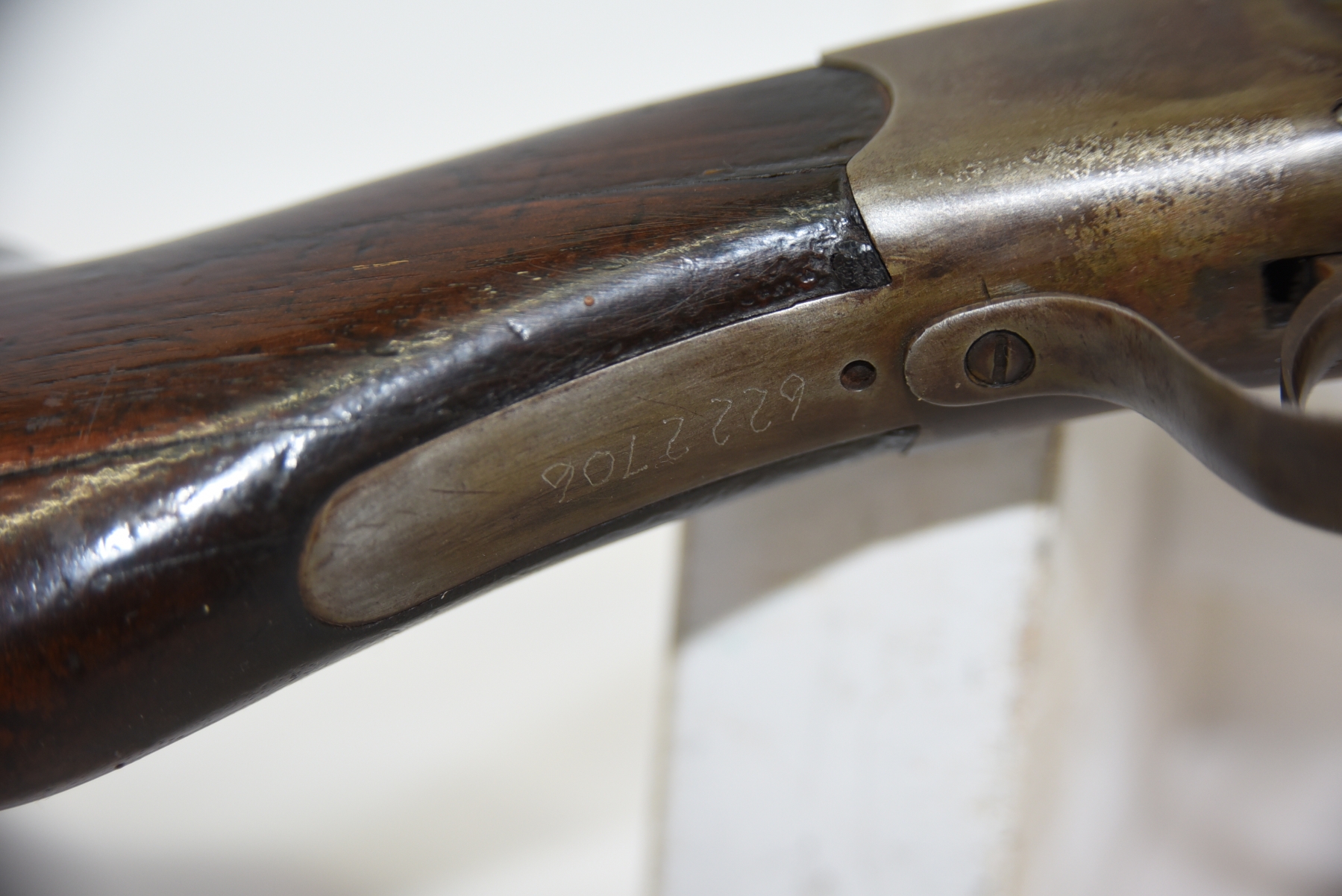 Wood stock shows scratches, scuffs, cracks in the grip area, a large chip in the right side of upper tang and a large chip on the left side of forearm, there are scratches, scuffs; condition is poor.