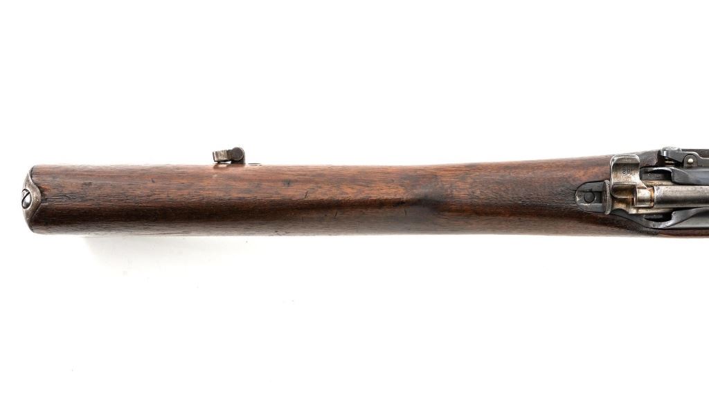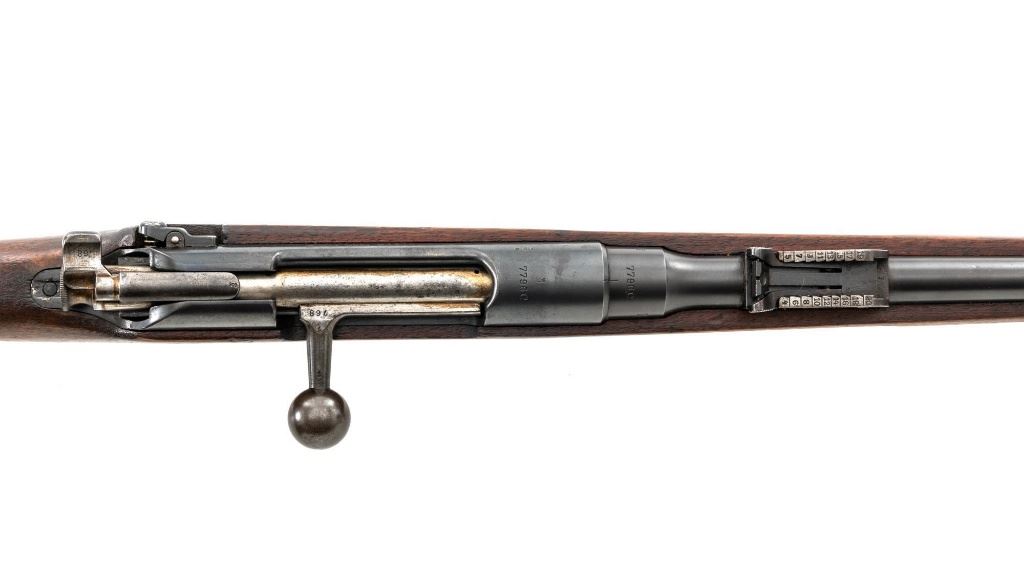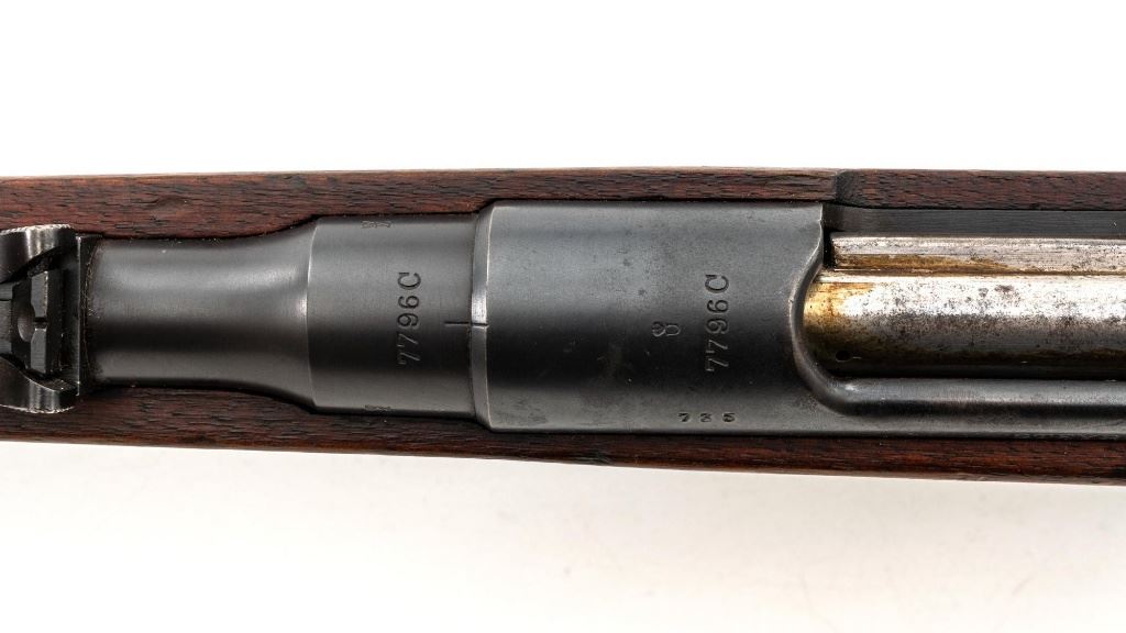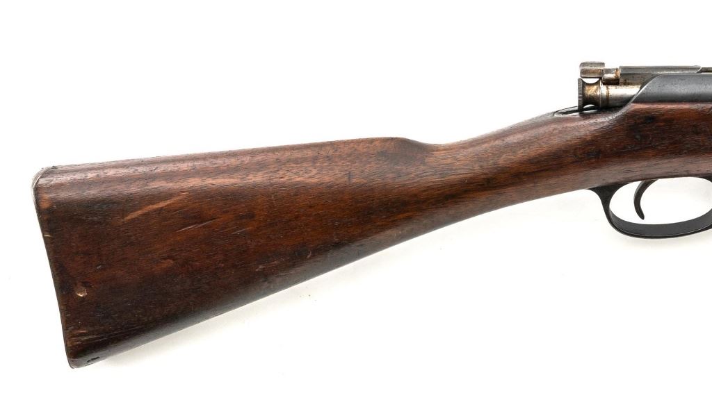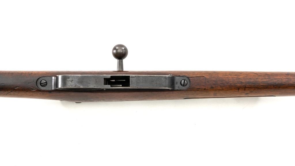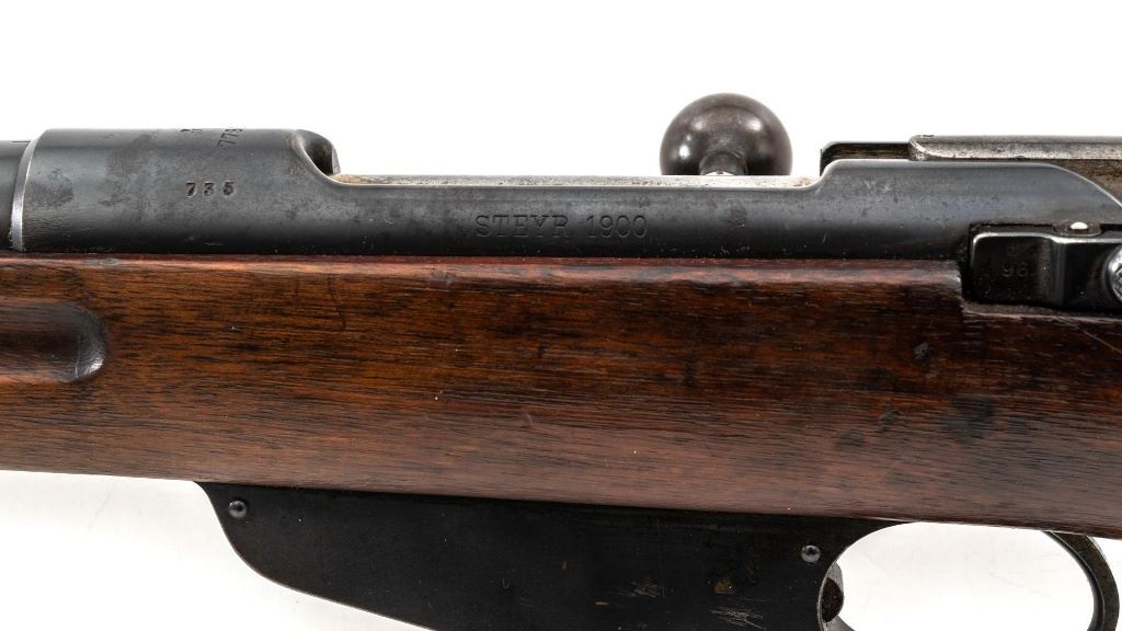 Steyr 1900 Mannlicher Bolt Action Carbine with Folding Bayonet, 7796C, possibly 6.5x53R cal., 18"barrel, blued finish, hardwood stock, inverted-"V" front sight, and adjustable rear sight with "V"-notched groove, graduated to 2000 meters. Steel cleaning rod is missing. Triangular shaped folding bayonet is stamped "(crown)B" and "07". Bayonet condition is very good, it opens and locks in place smoothly. Carbine is marked "STEYR 1900"on left side of the receiver rail and "(crown)U" on top of the receiver ring. "KAR" is stamped under the barrel band. Bolt assembly is numbered but does not match. No visible import marks. Condition overall is very good, retaining approx. 85% thinning and toning blue, showing spots of patina to the receiver and barrel; wear to the barrel band, magazine, and buttplate. Wood is very good, showing mostly moderate handling marks and impressions. Action operates smoothly. Bore rates fair, with visible rifling, but may clean better. Est.: $400-$600. (C&R)