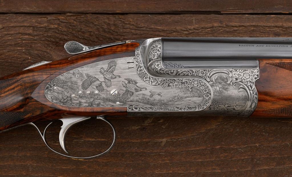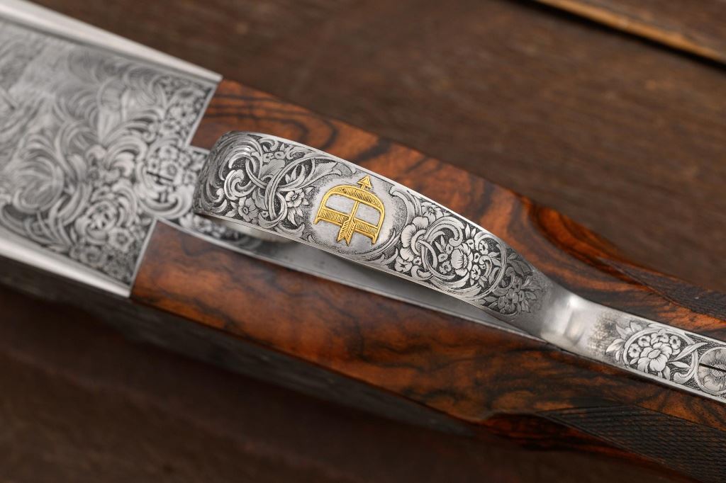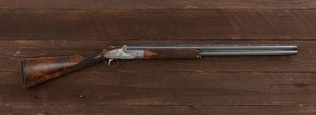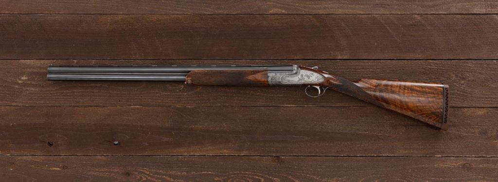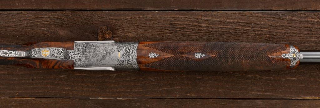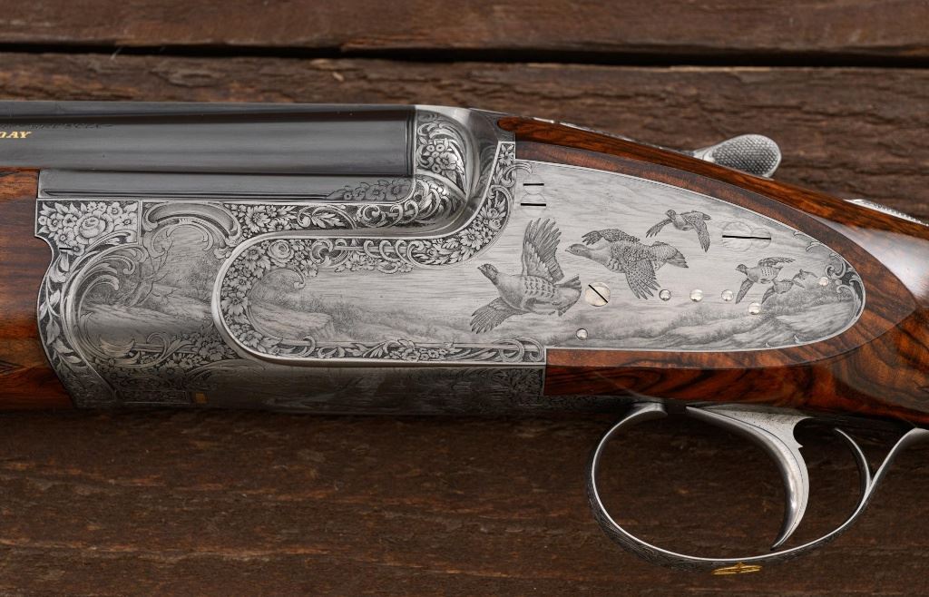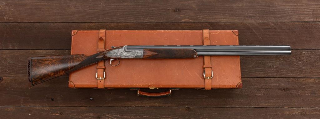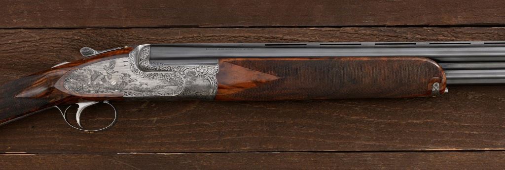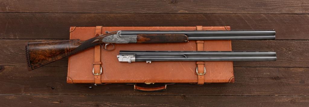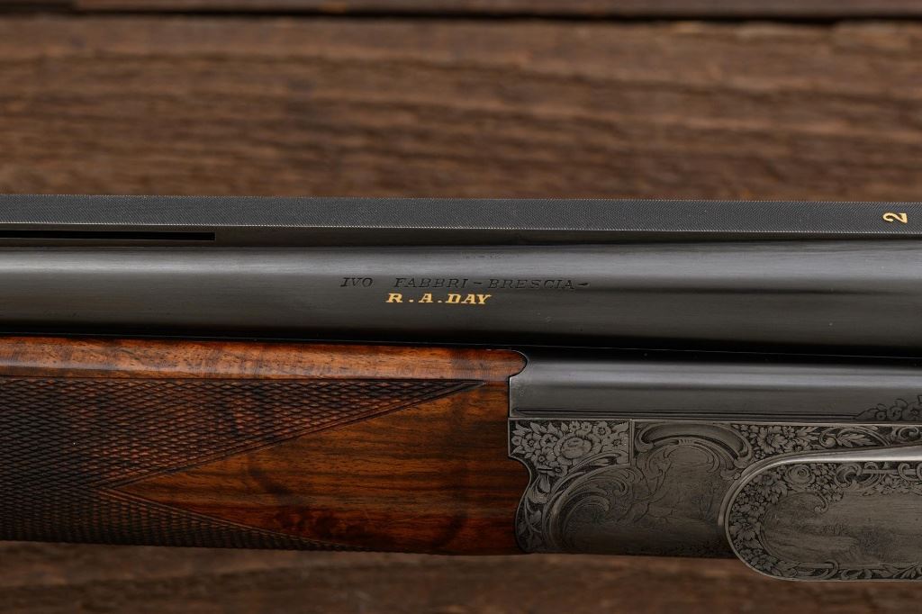 Stunning IVO Fabbri Best Quality Sporting Grade Over/Under Shotgun Two-Barrel Set, Engraving Signed by Galeazzi, #E691, 12 ga., 28" blued barrels are of the best steel available in Europe, first set is marked in gold "1/IV". Barrels have a tapered ventilated rib, 3" chambers, and are choked IC/MOD. Barrels marked "2/IV" in gold are the same except for choked CYL/IC; both sets of barrels with small "R.A. Day" in gold lettering on the left side and matching serial numbers. There is a gold "IV" on the opening lever and forend. The true sidelock action features a dual underlug lockup, single non-selective inertia trigger, non-automatic safety, and selective ejectors. The coin finished receiver is beautifully engraved with a small flock of partridge in flight, right-left on the left hand lock, and a similar flock flying left-right on the right side. Both sides have abundant game scenes and scroll engraving that surround the birds. Bottom of the receiver features a pheasant flushing, again with rose and scroll surrounding, gold "Fabbri" in prominent caption, and signed "Galeazzi". Blue trigger guard features a gold "D" with an arrow through it, for its previous owner. The very full forend and straight grip buttstock are of lightly-finished presentation grade European walnut, with complete checkering at 28 LPI, and a Fabbri buttpad. Stock dimensions are 14-3/8" x 1-5/8" x 1-7/8". Manufactured in 1989. Contained in a heavy brown leather hard case, with paper accessories. Condition is excellent, with almost no handling marks to the metal, and little wear to the action, which closes very tight and functions correctly. Wood displays typical signs of field use, with several light marks at rear of the forend, and intermittent light marks along the top and bottom edge of the buttstock, checkering detail is crisp. Bores are mirror bright. Overall reflecting light use, regular cleaning and maintenance. A spectacular two-barrel set. Est.: $30,000-$45,000. (Modern)(Property from the Estate of Robert Day)