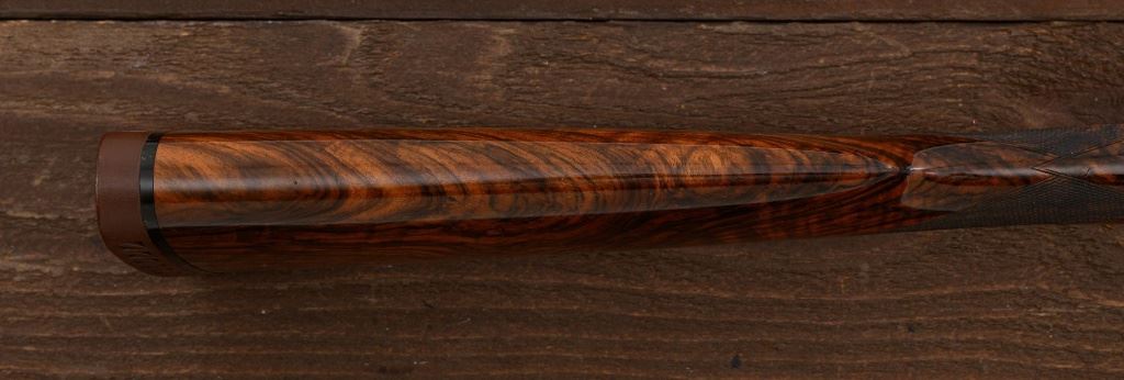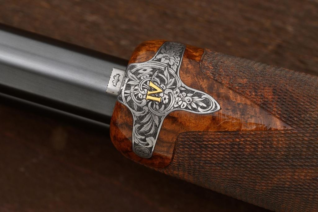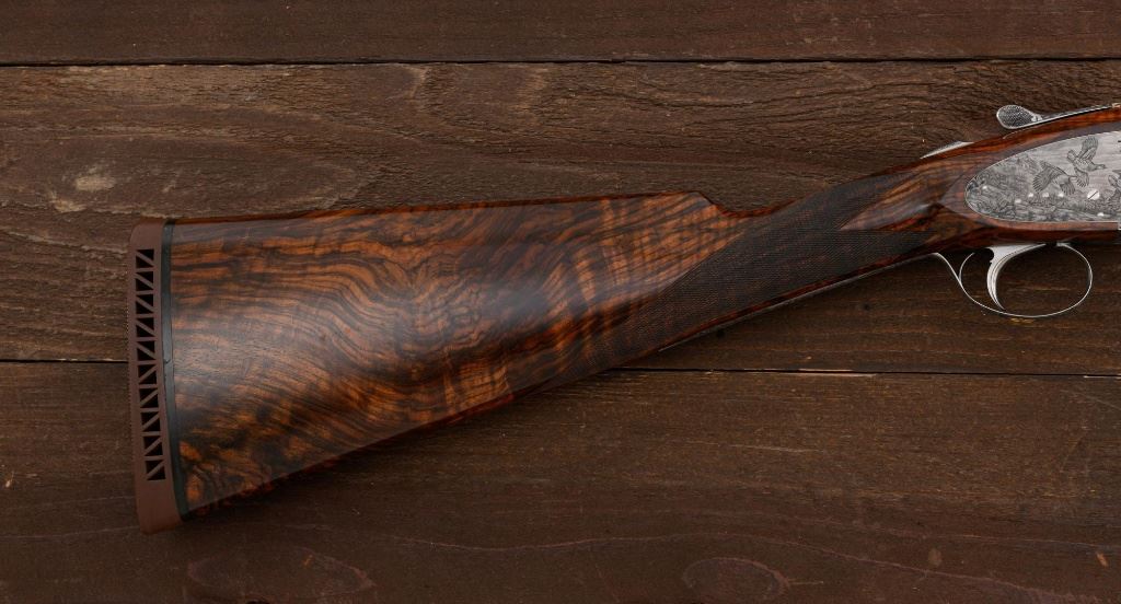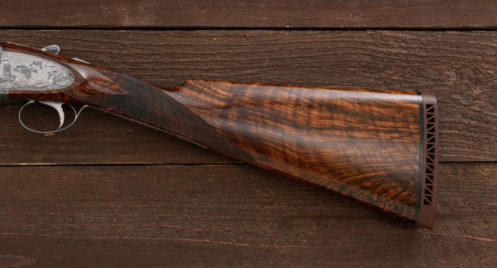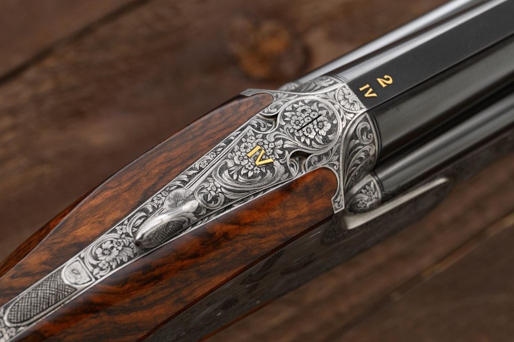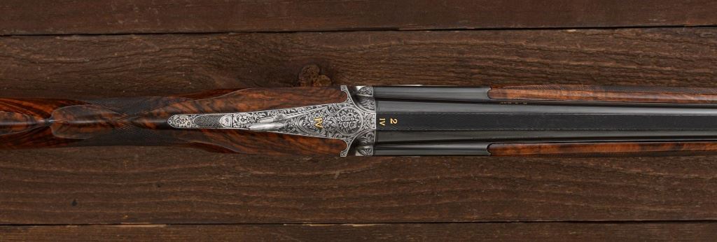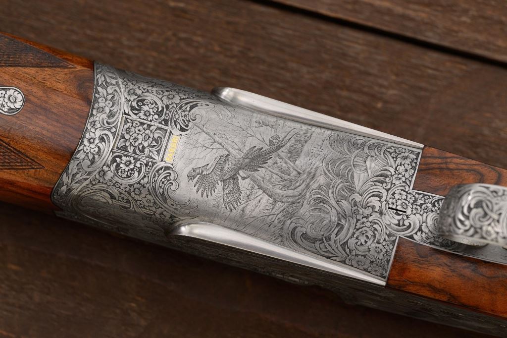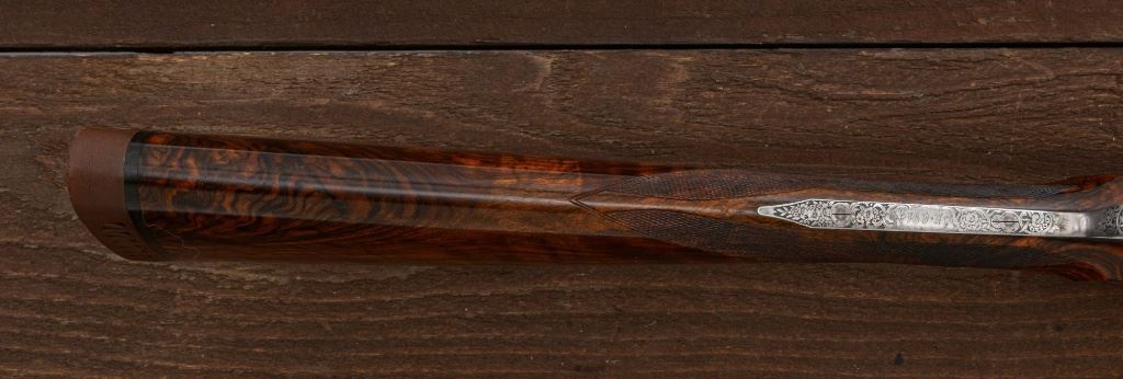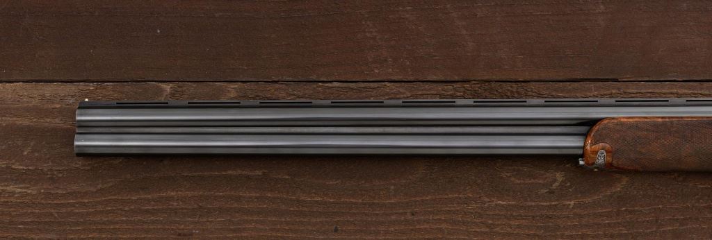 Stunning IVO Fabbri Best Quality Sporting Grade Over/Under Shotgun Two-Barrel Set, Engraving Signed by Galeazzi, #E691, 12 ga., 28" blued barrels are of the best steel available in Europe, first set is marked in gold "1/IV". Barrels have a tapered ventilated rib, 3" chambers, and are choked IC/MOD. Barrels marked "2/IV" in gold are the same except for choked CYL/IC; both sets of barrels with small "R.A. Day" in gold lettering on the left side and matching serial numbers. There is a gold "IV" on the opening lever and forend. The true sidelock action features a dual underlug lockup, single non-selective inertia trigger, non-automatic safety, and selective ejectors. The coin finished receiver is beautifully engraved with a small flock of partridge in flight, right-left on the left hand lock, and a similar flock flying left-right on the right side. Both sides have abundant game scenes and scroll engraving that surround the birds. Bottom of the receiver features a pheasant flushing, again with rose and scroll surrounding, gold "Fabbri" in prominent caption, and signed "Galeazzi". Blue trigger guard features a gold "D" with an arrow through it, for its previous owner. The very full forend and straight grip buttstock are of lightly-finished presentation grade European walnut, with complete checkering at 28 LPI, and a Fabbri buttpad. Stock dimensions are 14-3/8" x 1-5/8" x 1-7/8". Manufactured in 1989. Contained in a heavy brown leather hard case, with paper accessories. Condition is excellent, with almost no handling marks to the metal, and little wear to the action, which closes very tight and functions correctly. Wood displays typical signs of field use, with several light marks at rear of the forend, and intermittent light marks along the top and bottom edge of the buttstock, checkering detail is crisp. Bores are mirror bright. Overall reflecting light use, regular cleaning and maintenance. A spectacular two-barrel set. Est.: $30,000-$45,000. (Modern)(Property from the Estate of Robert Day)