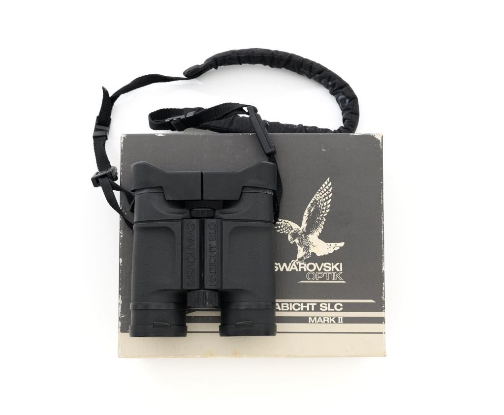 Swarovski Habicht SLC Mark II 8x30mm Binoculars, #DA6300074, WB, matte black, mfgd circa 1989. Includes factory box, instruction manual, front/rear eye caps, neck strap, and carrying case. Binoculars are in excellent condition, exterior with a few light handling marks. Optics are bright and clear. Front left lens cap hinge is broken. Est.: $600-$800.