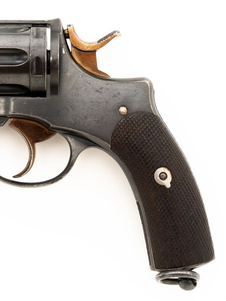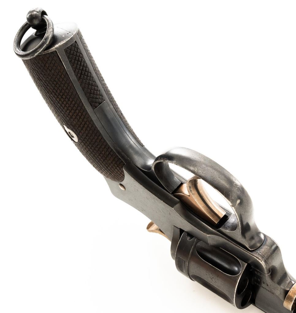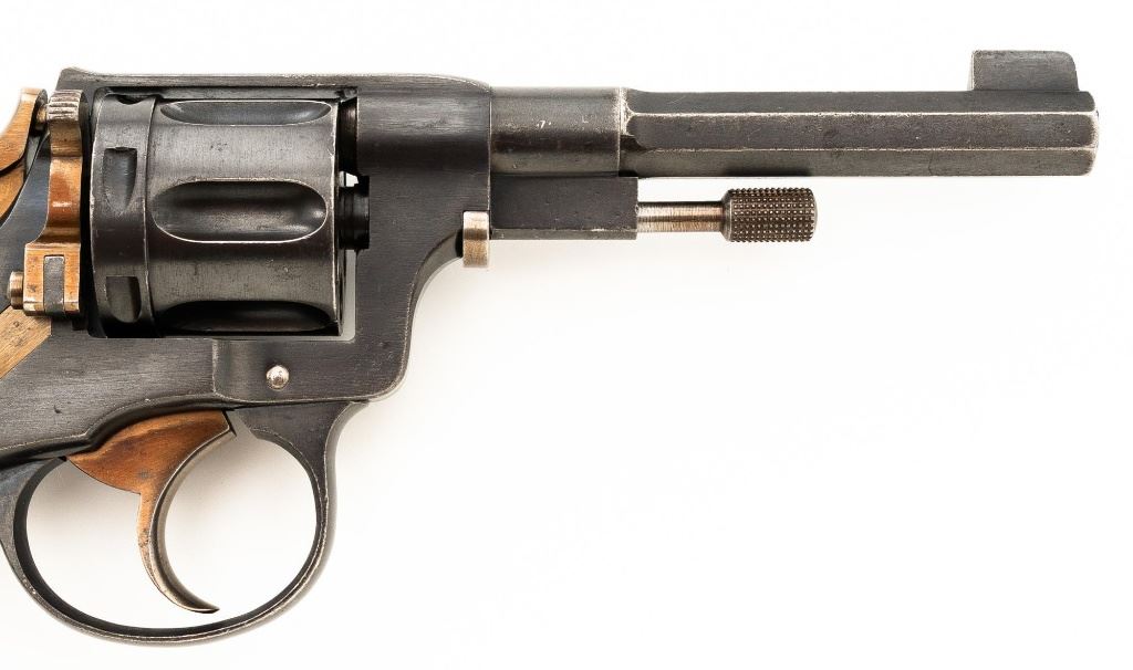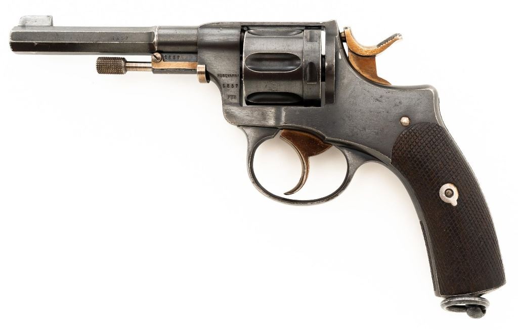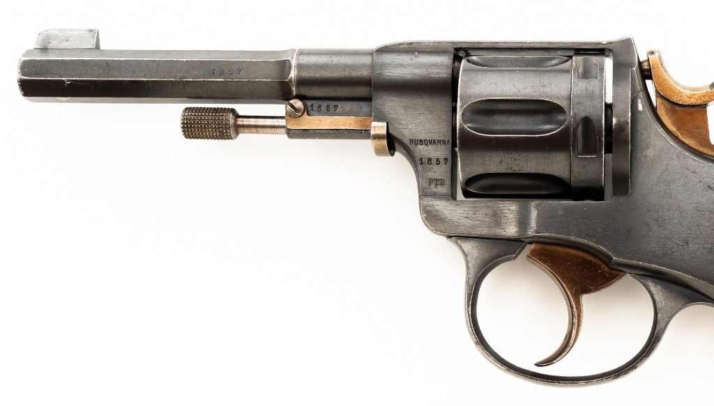 Swedish M1887 Nagant Double Action Revolver, #1857, 7.5x22Rmm cal., 4.5" octagon barrel, blued finish with straw colored small parts, checkered hardwood grips, inverted-"V" front sight, fixed rear sight with "V"-notched groove, and swiveling lanyard ring. Left side of the frame is marked "HUSQVARNA/PTB" for Husqvarna inspector Per Theodor Bergsten. Matching visible numbers. No visible import marks. Condition overall is very good+, retaining approx. 90% blue with scattered specks of mild frosting, showing some areas of light edge wear, handling marks, and patina to left side of the barrel and frame. Straw colored parts show darker toning. Barrel is canted slightly to the right. Grips are good with moderate handling marks and wear to the checkering. Action locks up, cycles, and extracts smoothly. Bore is bright with very good rifling. Est:$450-$650. (C&R/PPT)