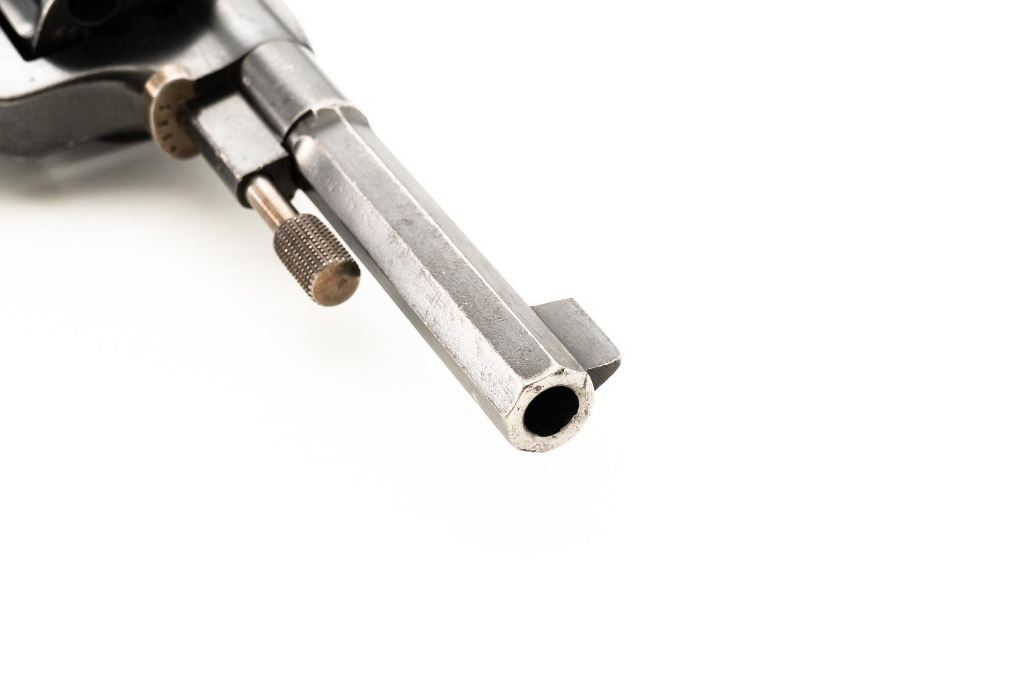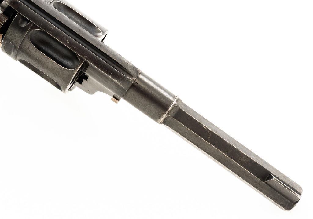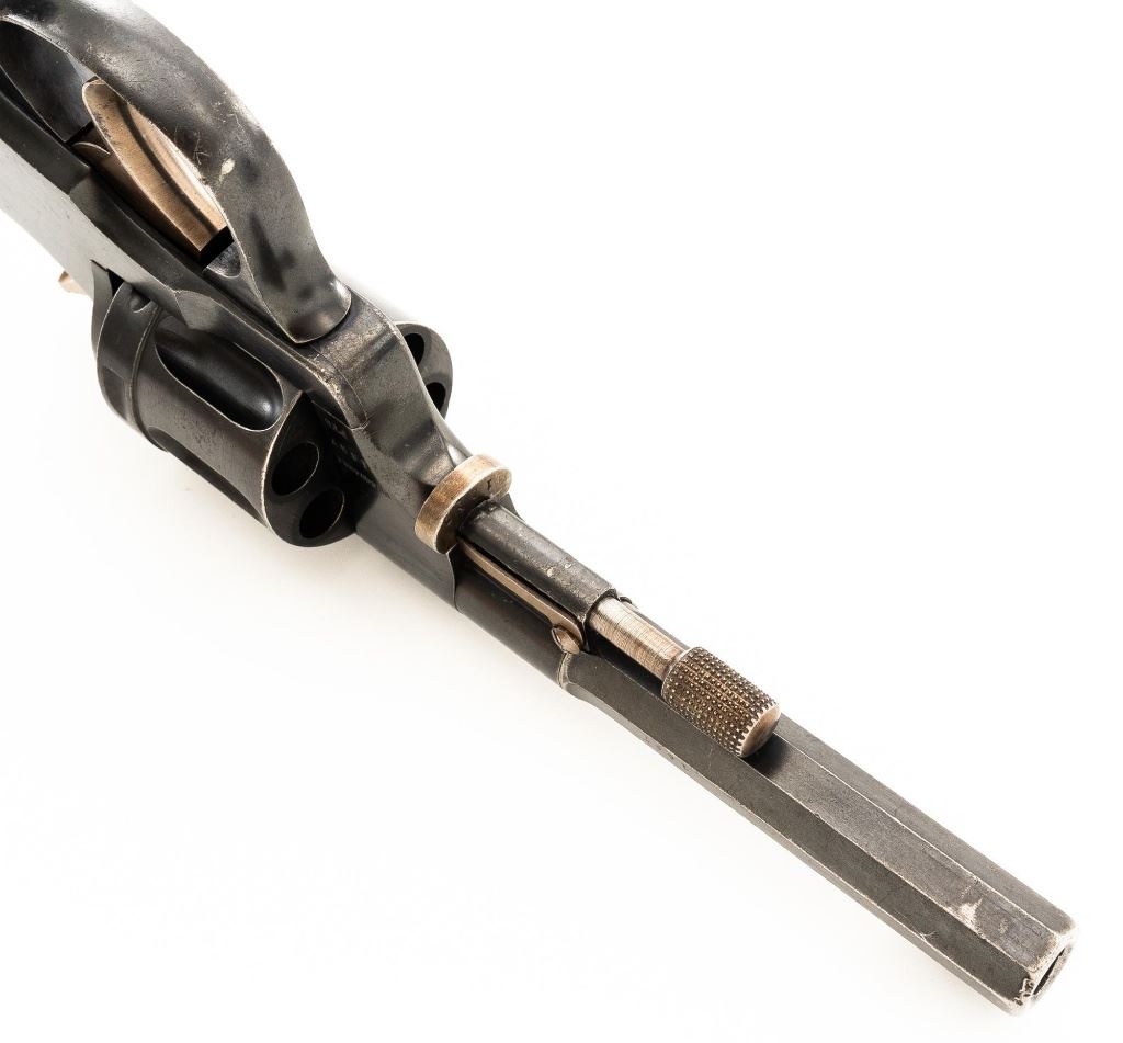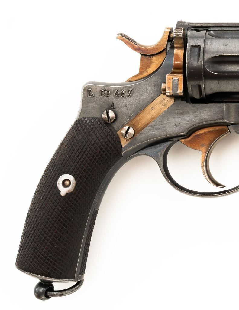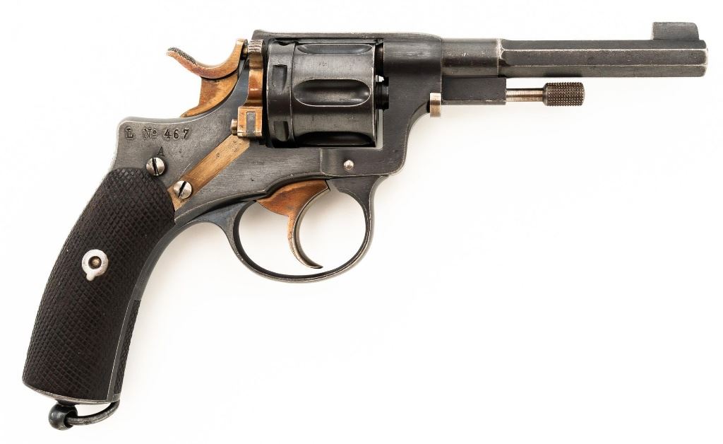 Swedish M1887 Nagant Double Action Revolver, #1857, 7.5x22Rmm cal., 4.5" octagon barrel, blued finish with straw colored small parts, checkered hardwood grips, inverted-"V" front sight, fixed rear sight with "V"-notched groove, and swiveling lanyard ring. Left side of the frame is marked "HUSQVARNA/PTB" for Husqvarna inspector Per Theodor Bergsten. Matching visible numbers. No visible import marks. Condition overall is very good+, retaining approx. 90% blue with scattered specks of mild frosting, showing some areas of light edge wear, handling marks, and patina to left side of the barrel and frame. Straw colored parts show darker toning. Barrel is canted slightly to the right. Grips are good with moderate handling marks and wear to the checkering. Action locks up, cycles, and extracts smoothly. Bore is bright with very good rifling. Est:$450-$650. (C&R/PPT)