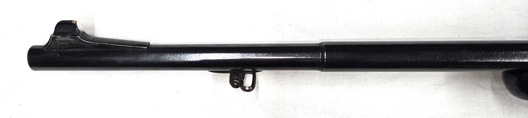 Has rear iron sight on barrel and blade on front. Barrel is only 20 inches long.