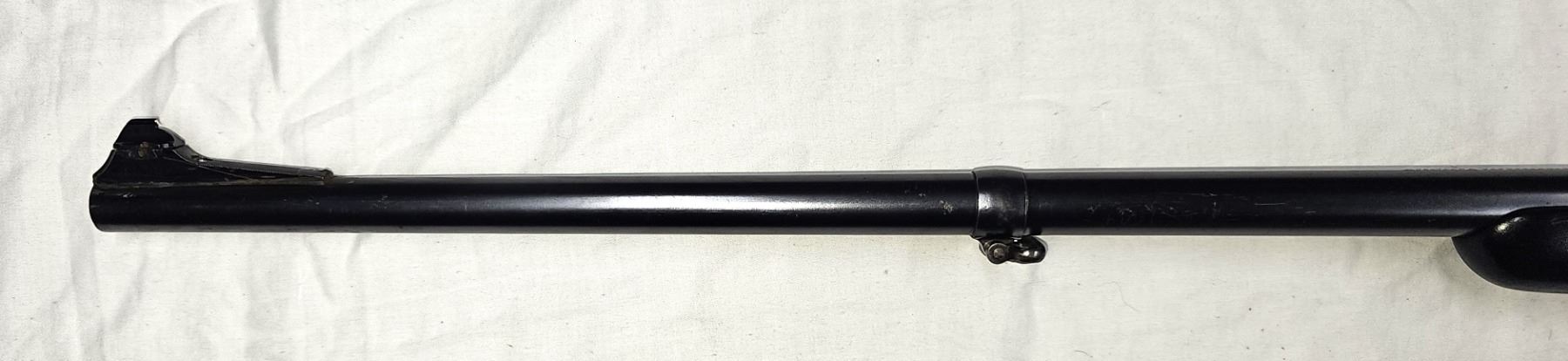 Has flip up iron sight at rear and blade on front. Rubber after market butt pad.